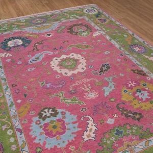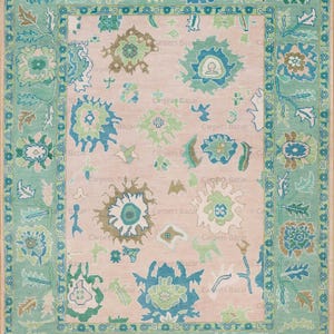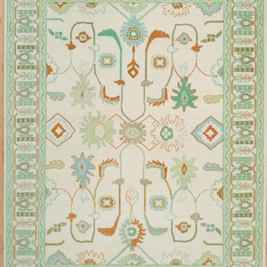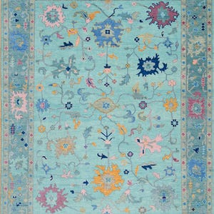 Touched With Gold is a modern oushak area rug with a beautiful blue background. The blue rug has abstract floral pattern in play of colors: navy blue, warm coral, fresh green, and zesty lemon yellow. The hand woven wool rug has an average of 20 to 40 knots per square inch, which makes the Turkish area carpt thick and plush underfoot without being too dense. The blue oushak has a cozy, inviting texture - almost cushy- so it's the rug for high traffic areas like living rooms and bedroom. Truly versatile, oushak rug is available in all sizes. Whether you need the charm of an 8x10 rug or the elegance of a 9x12.