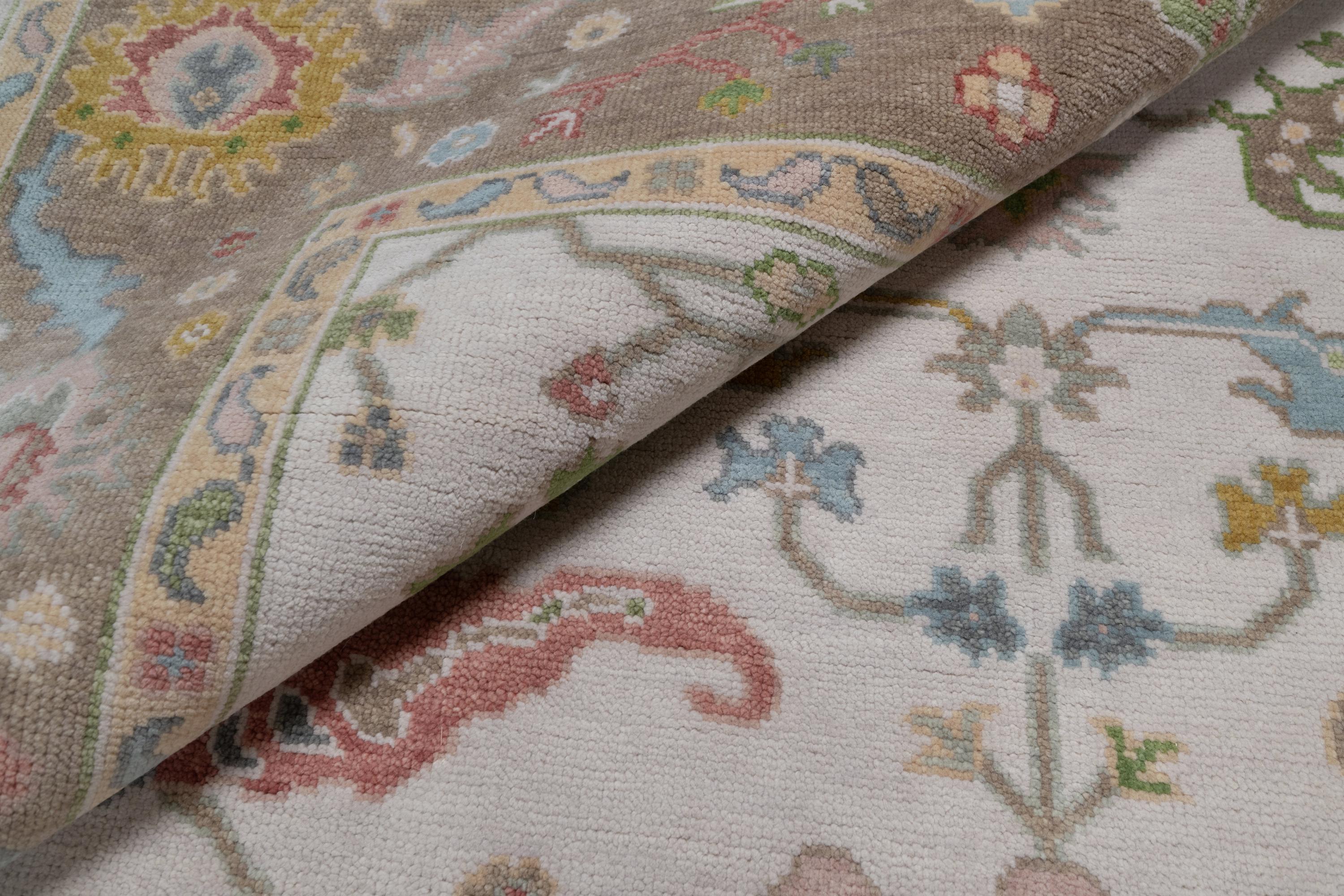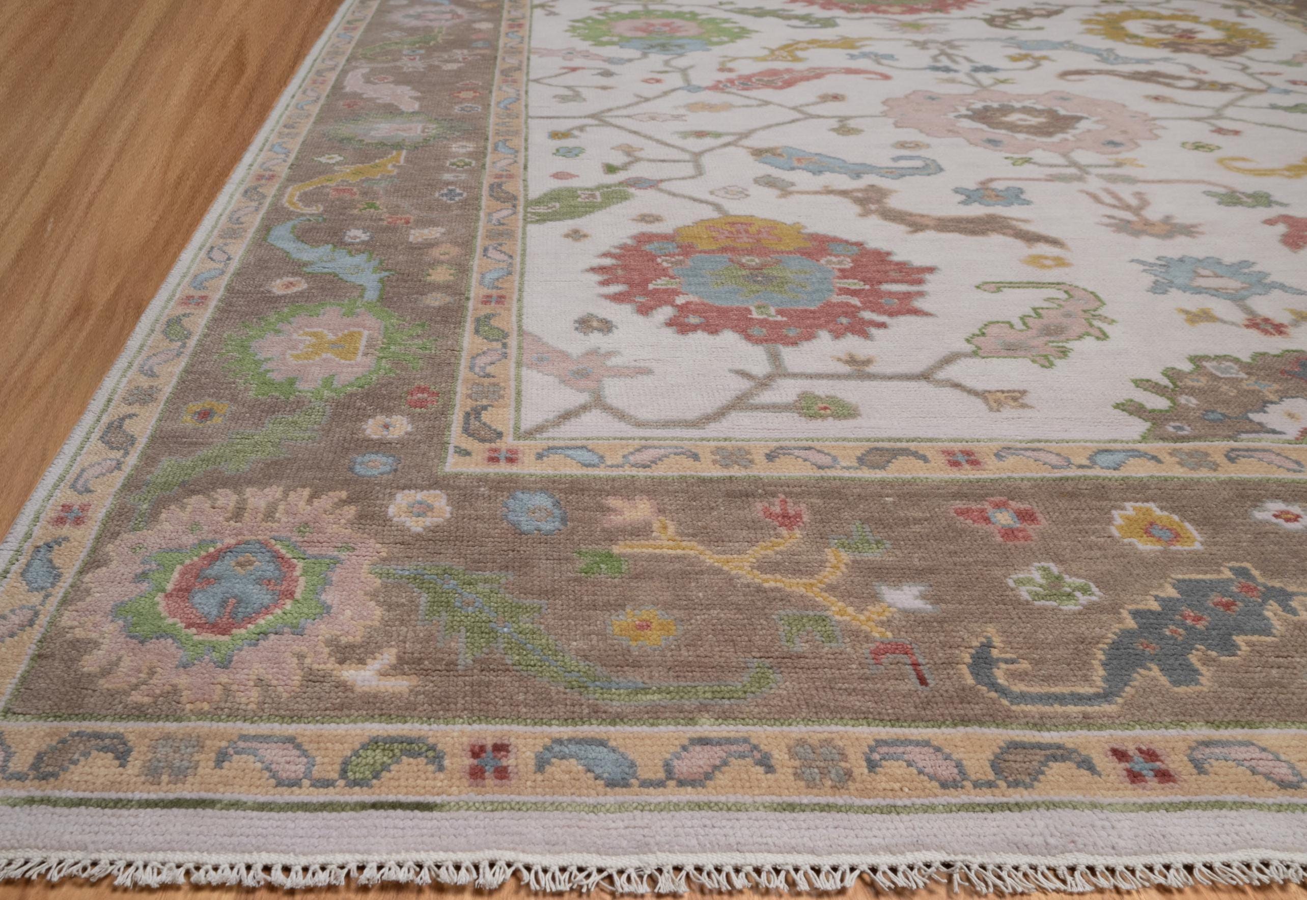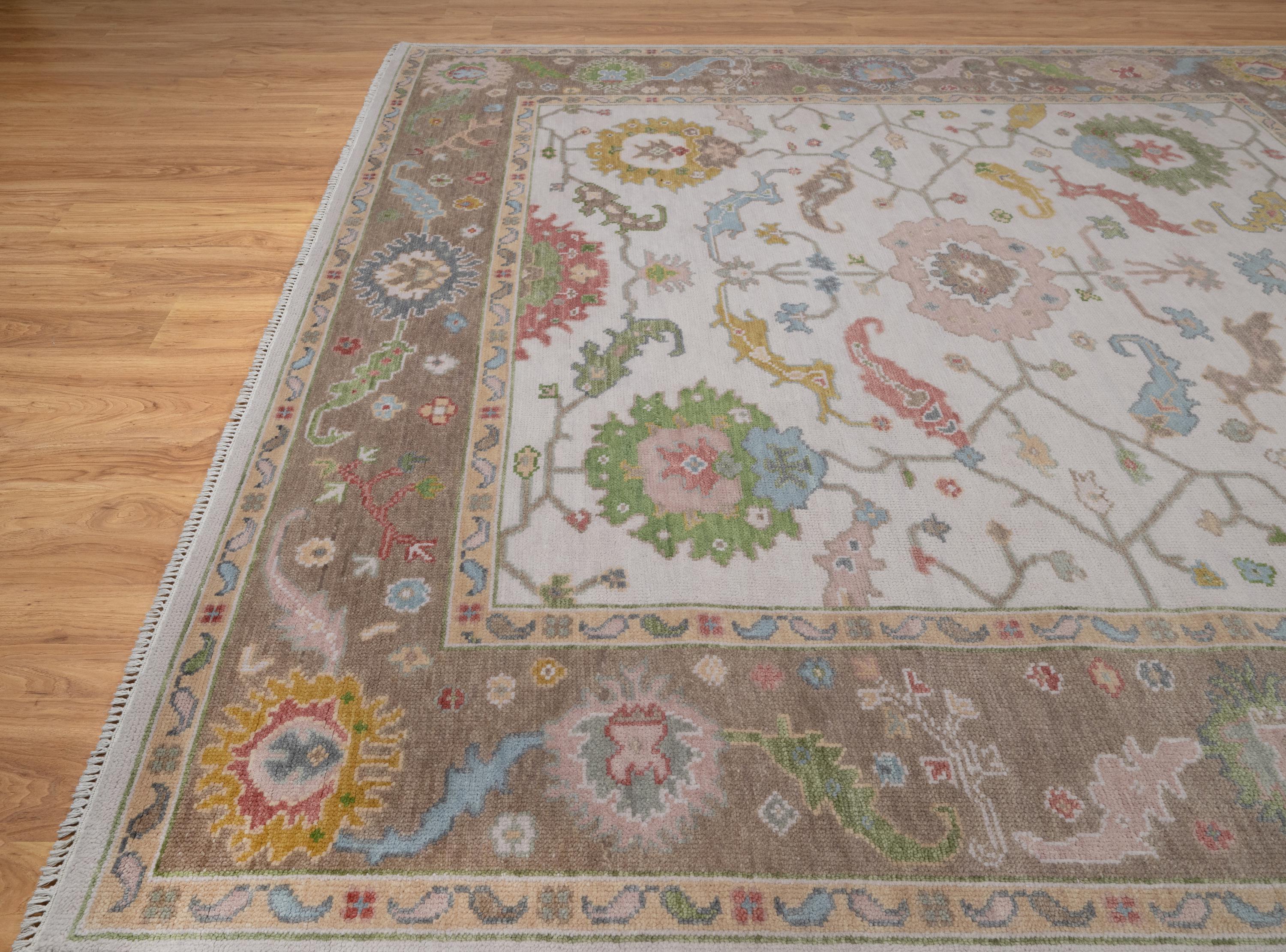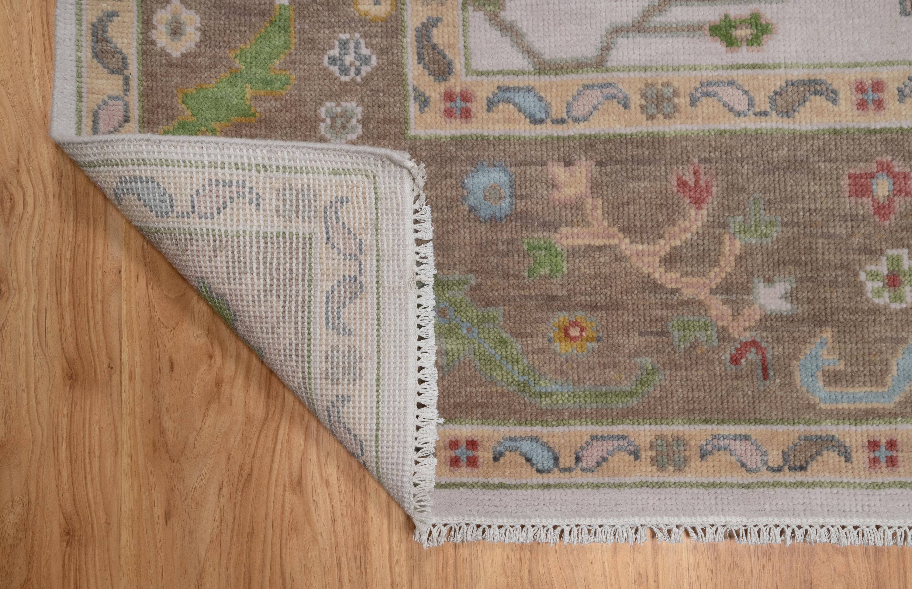 Add style and elegance to your home with the beautifully hand knotted Whispers of Fall Area Rug. The gray and brow rug is made from the highest quality wool and natural dyes with about 20 to 40 knots per square inch. It makes the modern living room rug super soft without being too dense. A floral design highlighted in shades of green, yellow, pink and more, give the neutral Oushak wool rug a colorful vibe. The gray Turkish rug is easy to clean and maintain, super plush and soft and doesn't need a rug pad.