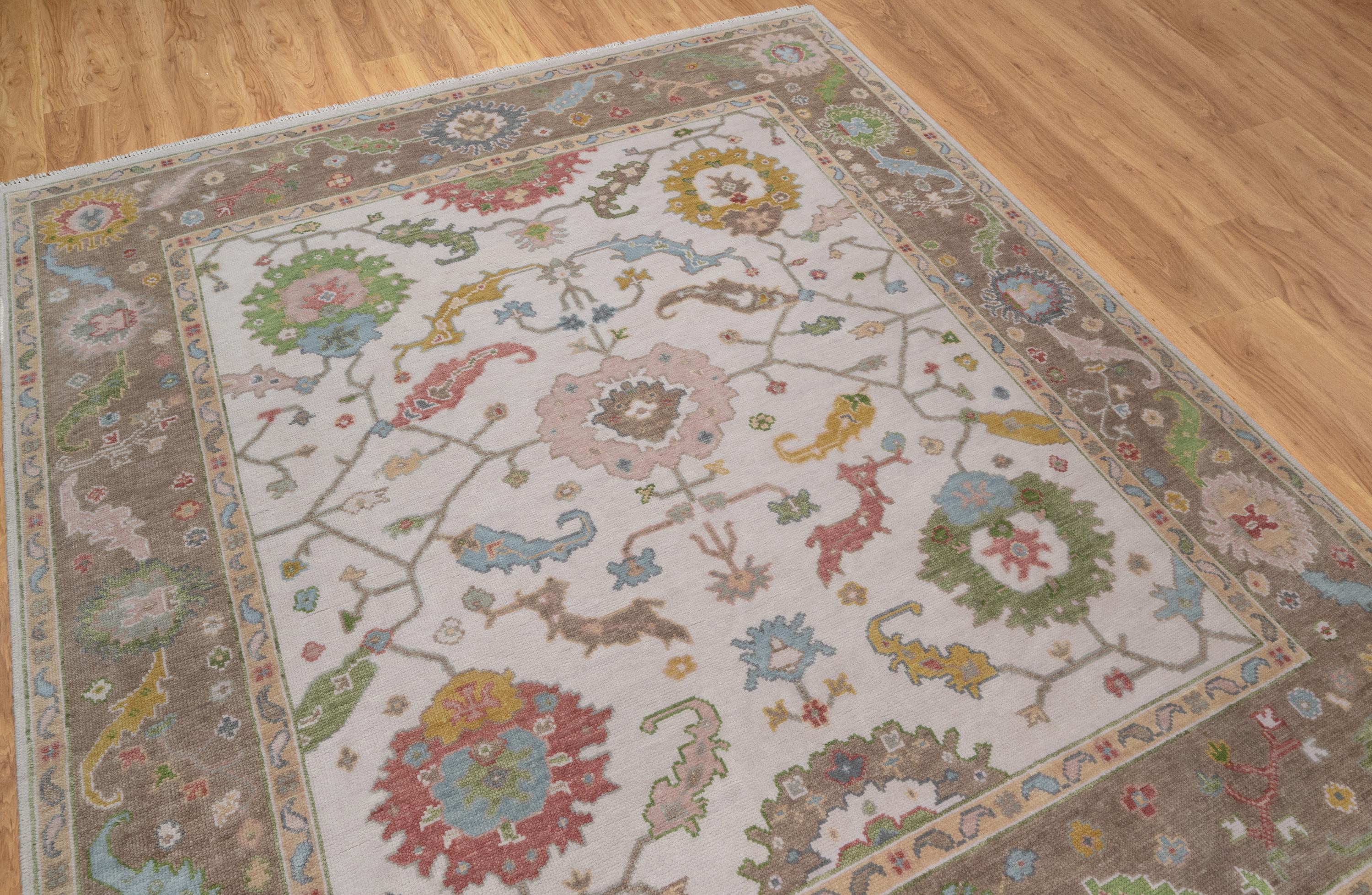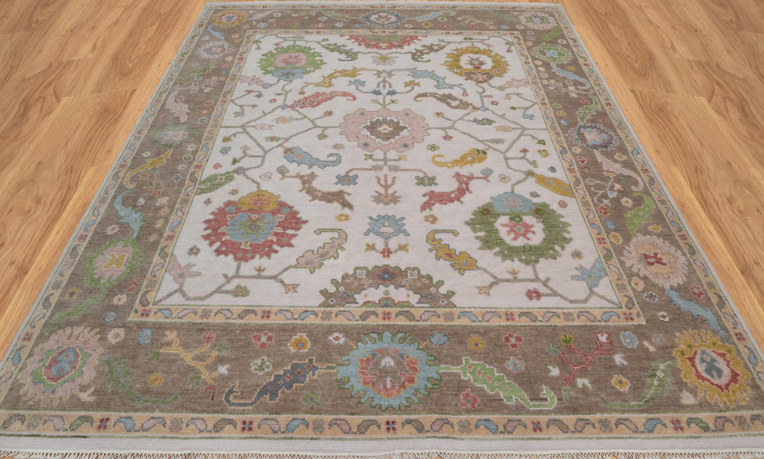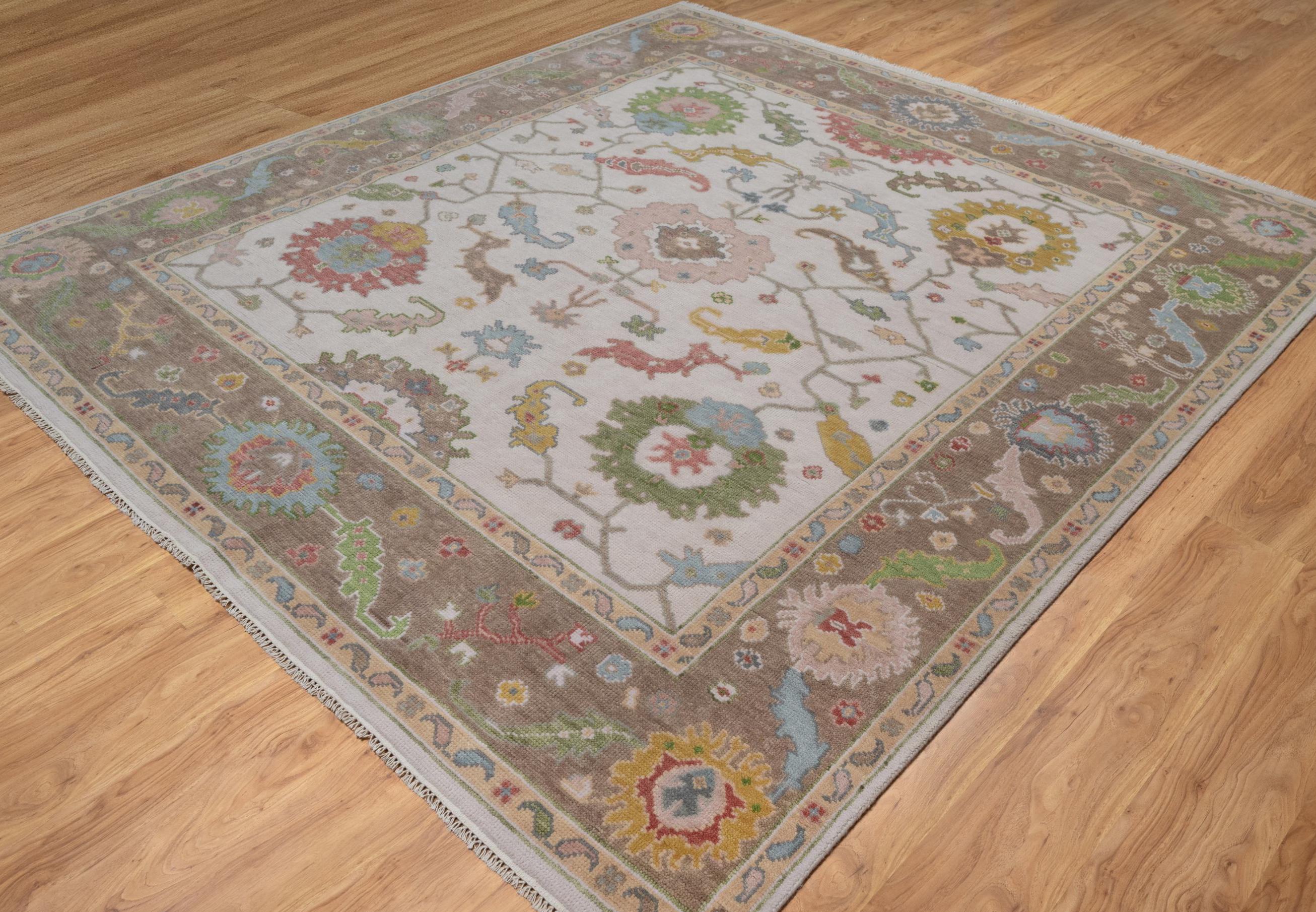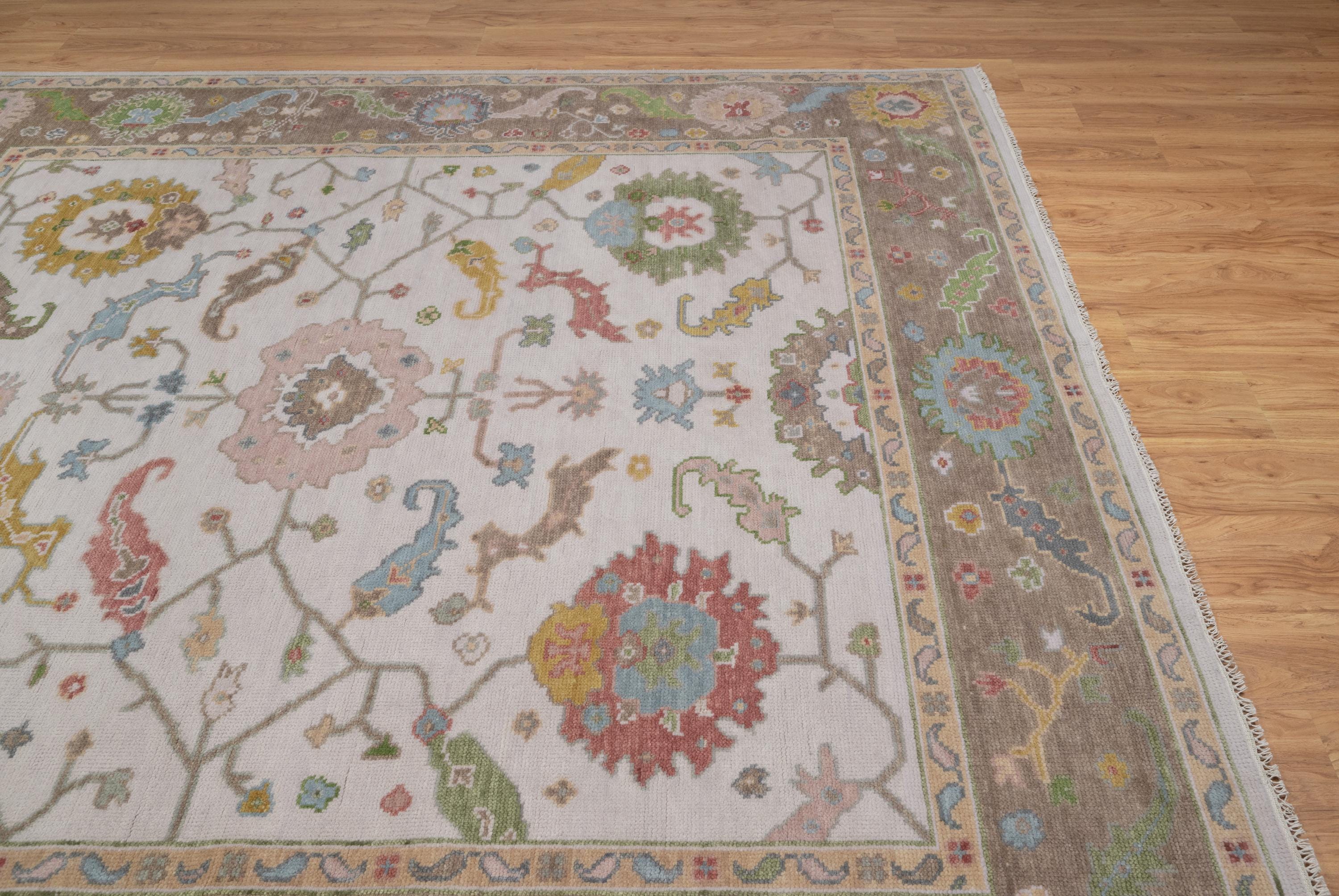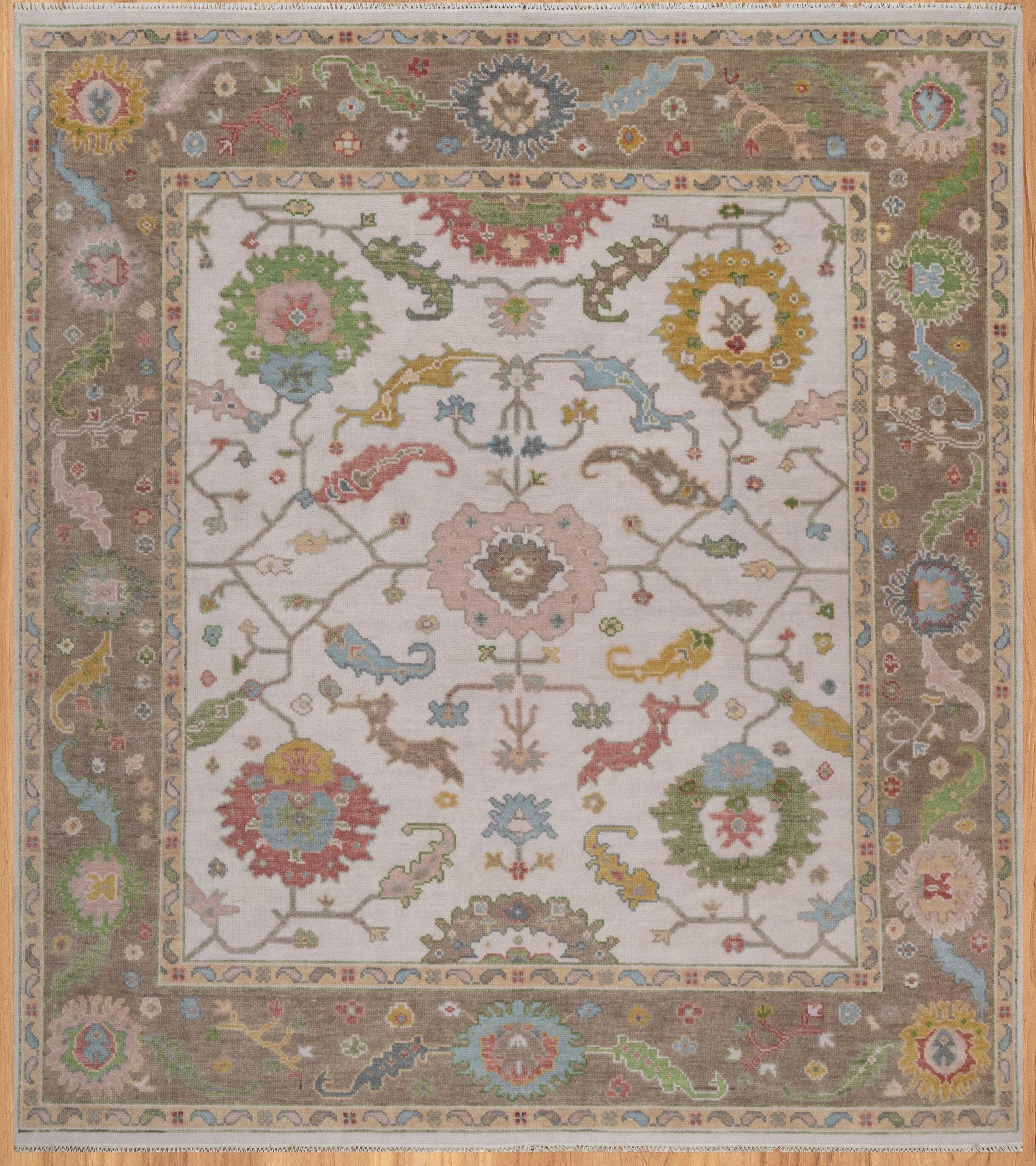 Add style and elegance to your home with the beautifully hand knotted Whispers of Fall Area Rug. The gray and brow rug is made from the highest quality wool and natural dyes with about 20 to 40 knots per square inch. It makes the modern living room rug super soft without being too dense. A floral design highlighted in shades of green, yellow, pink and more, give the neutral Oushak wool rug a colorful vibe. The gray Turkish rug is easy to clean and maintain, super plush and soft and doesn't need a rug pad.