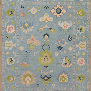 Dove’s Delight is light sky blue rug with ivory border. The handmade floral abstract style carpet is handknotted in premium NZ wool. The blue Oushak wool rug features pattern in pink, lavender, rust, and gold accents. The colorful feel of the Turkish area rug make it perfect for modern ro farmhouse décor. Although not very cottagecore, the colorful wool rug is great for traditional home décor. With approximately 20–40 knots per square inch, the handmade area rug is cloud-soft underfoot without being overly dense. The carpets bazaar rug is 100% cut-pile, which makes it durable, and pet-friendly, perfect for homes with pets or little ones. Easy to maintain even in high traffic areas the Oushak is a versatile choice for living rooms, bedrooms, or dining rooms. The carpet is available in all sizes from small 4x6 to usual 8x10 to oversize 12x15, including custom sizes.