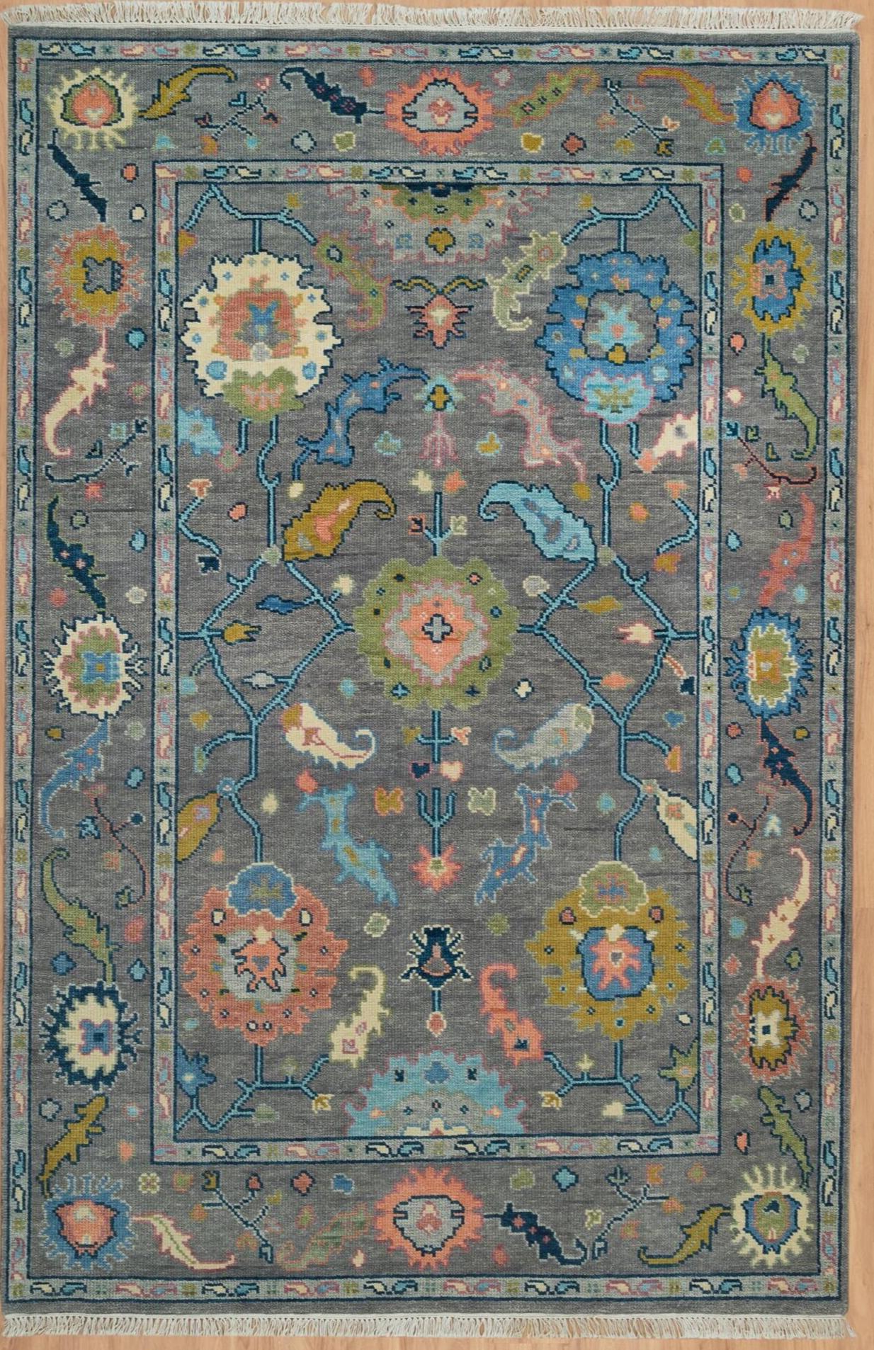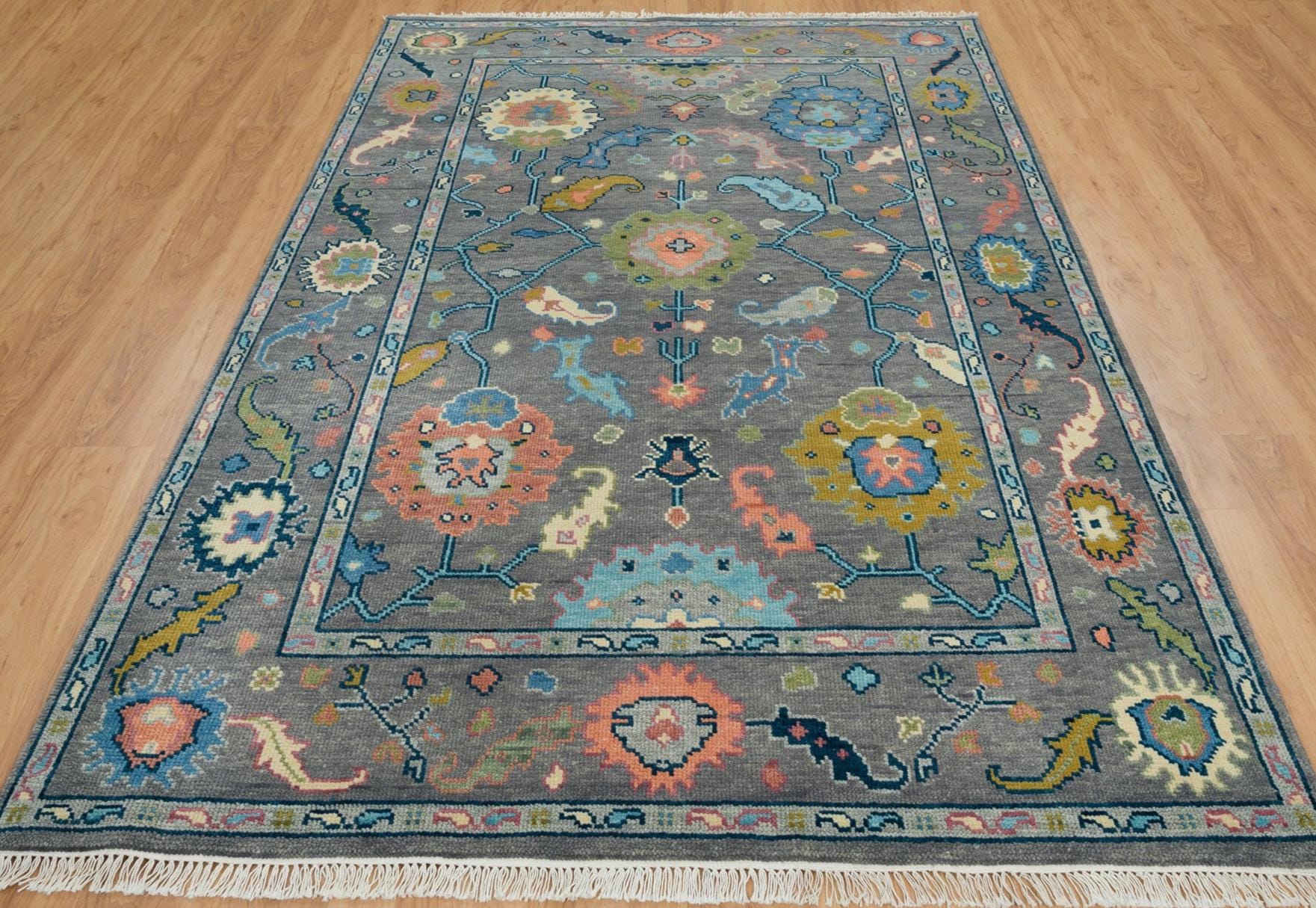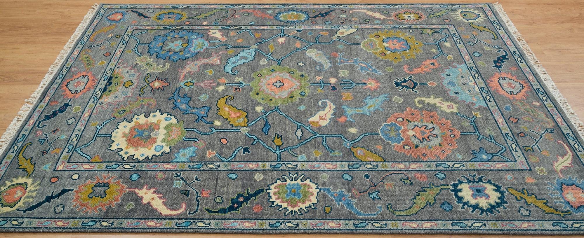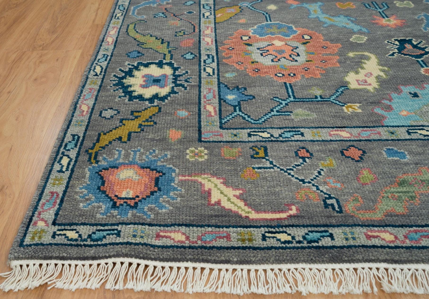 We call this modern oushak rug Silv-her. With a silver, almost slate gray base, the handmade Oushak area rug has bold floral, abstract patterns. The accents in teal blue, salmon pink, navy, and cream give the Oushak wool rug energy. The blue gray Oushak rug has about 20 to 40 knots per square inch, so the pile is plush and cushioning but not too thick to make the area rug cumbersome. The handknotted wool rug is very durable, and is 100% cut-pile. This Carpets Bazaar design is available in all sizes, from large 10x14 oushak to small 4x6 area rug.