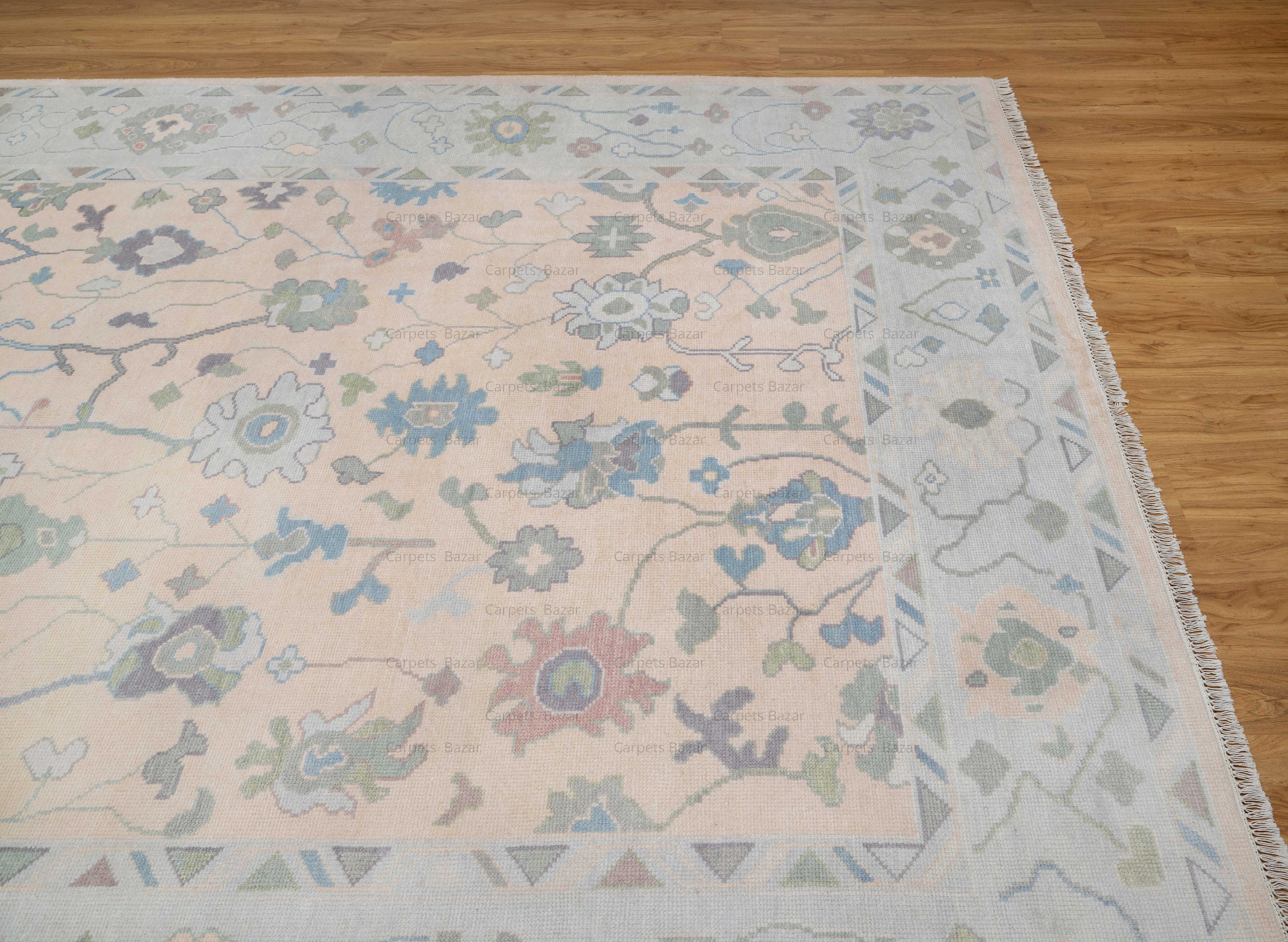 This soft peach Oushak rug is the perfect muted handmade area rug for bedroom or living room. Handknotted in premium wool, the mid century modern Oushak Turkish rug features a floral design in light shades of blue, gray and Benjamin Moore Pale Petal. The pastel hand woven wool area rug is strong and durable thanks to the high knot density. It's also super soft to feel but not cumbersome and dense. The contemporary style oushak area rug uses pastel colors but still looks vibrant because of the high quality of wool. The peach and blue rug is 100% cut pile (has no loops) and doesn't shed. This Carpets Bazaar design is also easy to maintain, which makes the wool rug idea for high traffic areas like living room or kitchen.