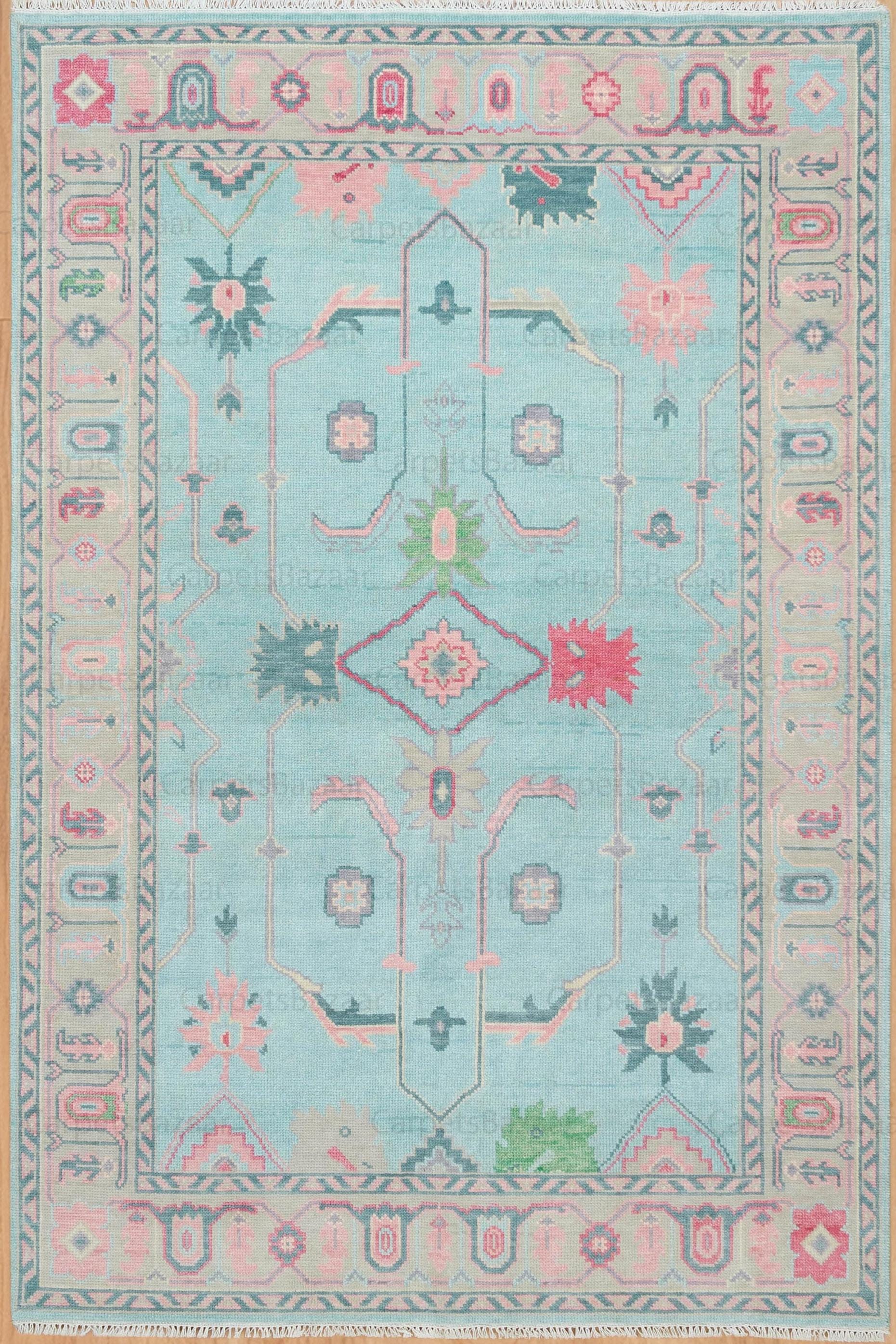 Hand-Knotted Wool Oushak Rug, Soft Blue, Pink, Green, Colorful Carpet AR_3642