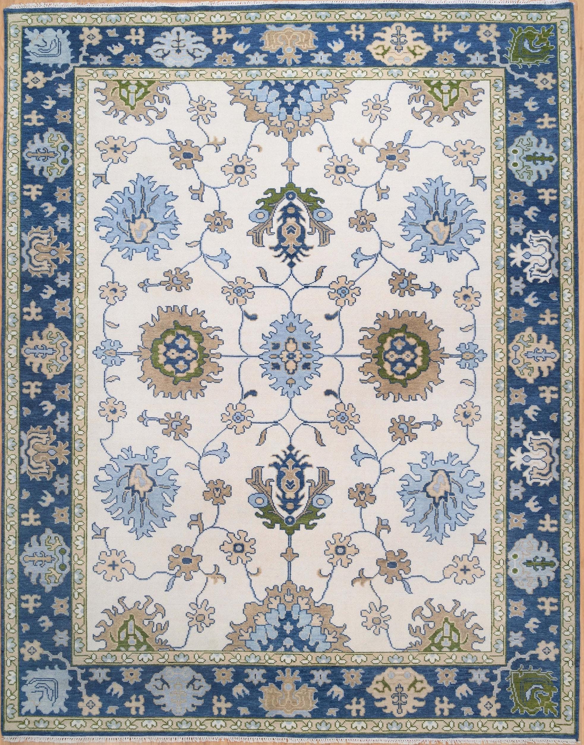 Handwoven Wool Oushak Rug, Ivory, Navy Floral, Mid-Century Modern AR_3657