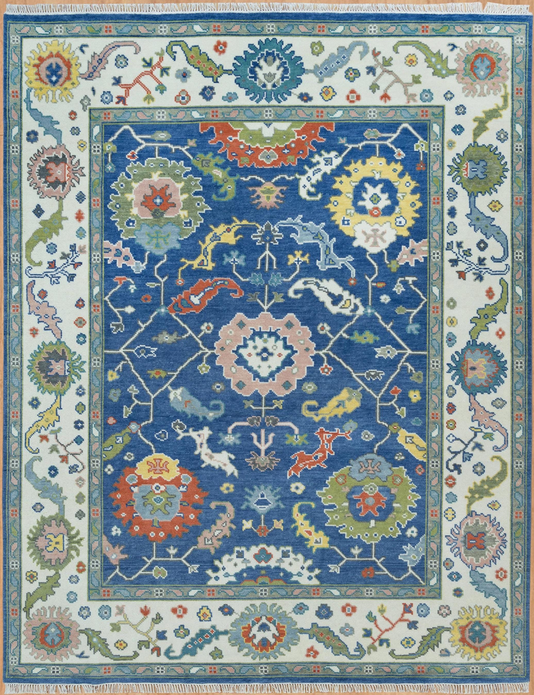A rug with a blue field bordered in white. The blue and white area rug has a floral pattern in green, orange, yellow and pink, giving it a very colorful look that would pair beautifully with a white, cream or beige couch. The Oushak rug is made of premium quality NZ wool and has 20 to 40 knots per square inch. So, the multi-colored carpet is plush and luxuriously soft. Perfect for a living room or bedroom, the blue Turkish rug is not too dense, doesn't shed and is 100% cut pile (no loops) so it's suitable even with pets. The colorful handwoven wool rug is available is all sizes from small 6x9 to palace size 12x15.