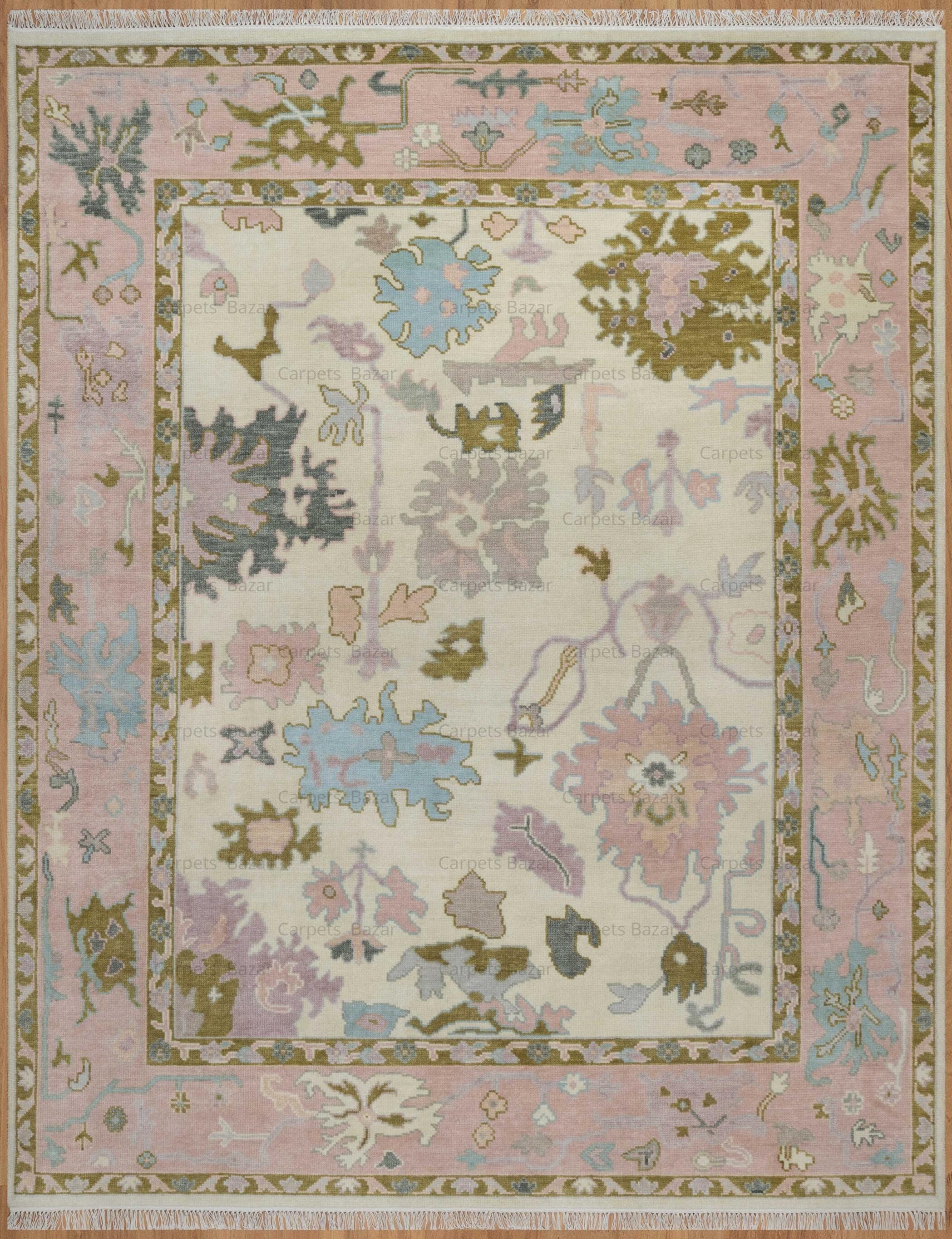 Tranquil is a stunning modern oushak rug in ivory and light pink. With abstract floral pattern meticulously hand-knotted by skilled artisans, the pastel color area rug is unique and of the highest quality. The soft, muted hues of mauve, blue and olive green make the wool rug perfect for any home decor style. The white and pink rug complements both modern and traditional home. We'd love to place the oriental rug, available in all sizes, on a living room, bedroom, or dining area floor. Made from premium quality wool, the muted oushak rug offers exceptional durability and a luxurious feel underfoot. The wool rug is easy to clean and maintain. It's a great way to gift her something personalized!