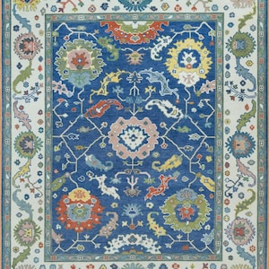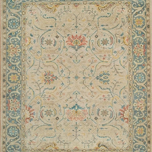 The colorful Oushak rug is a blend of bright colors, and neutral shades. The blue border with a touch of olive green make this modern area rug unique. Handknotted in 100% NZ wool, the Oushak Turkish rug is super soft and plush - much more you'd imagine thanks to the high knot count. The rug is 100% cut pile, which means there are no loops so the wool rug is meant for homes with pets. Easy to maintain, the green and beige rug is available in multiple sizes. This contemporary floral rug is the perfect addition to your living room, dining room or hallway.