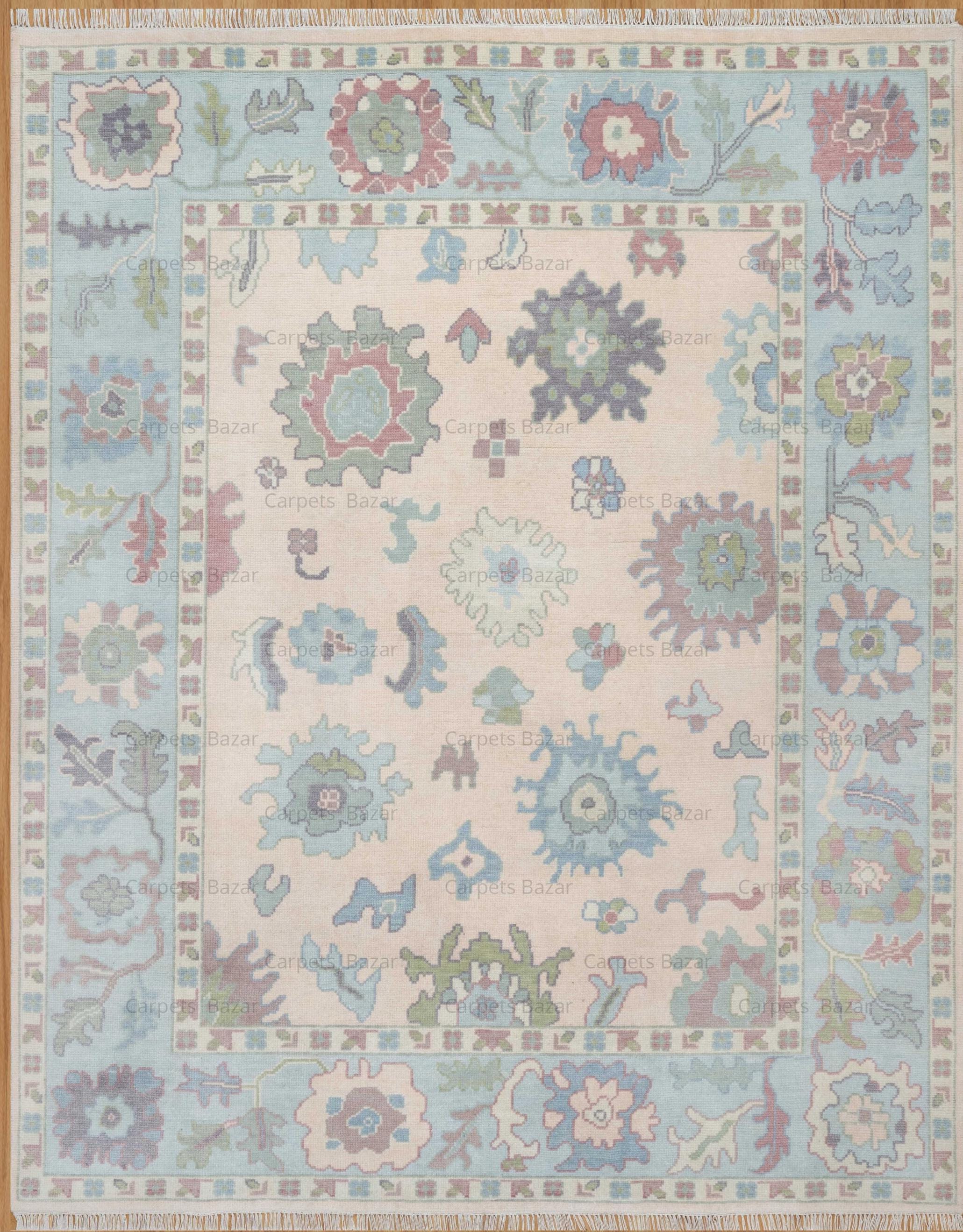 This Oushak rug is a hand-knotted wool rug in soothing pastel tones of peach, baby blue, gray, pale green, and purple. Crafted in fine New Zealand wool with dense knotting, this muted Turkish rug is soft, durable, and non-shedding. Perfect for a living room, bedroom, or dining space, the pastel area rug adds warmth, elegance, and timeless style to any décor. We call this hand woven rug Fresno. The soothing pastel color palette of the carpet works beautifully in both modern and traditional homes. This pale pink and baby blue rug design is available as a 5x8 area rug, 8x10 living room rug, and oversized 9x12 wool rug. Each CarpetsBazaar rug is handcrafted by skilled artisans. For a high-traffic area like a dining room or living room, this cut-pile wool rug resists shedding and cleans easily.