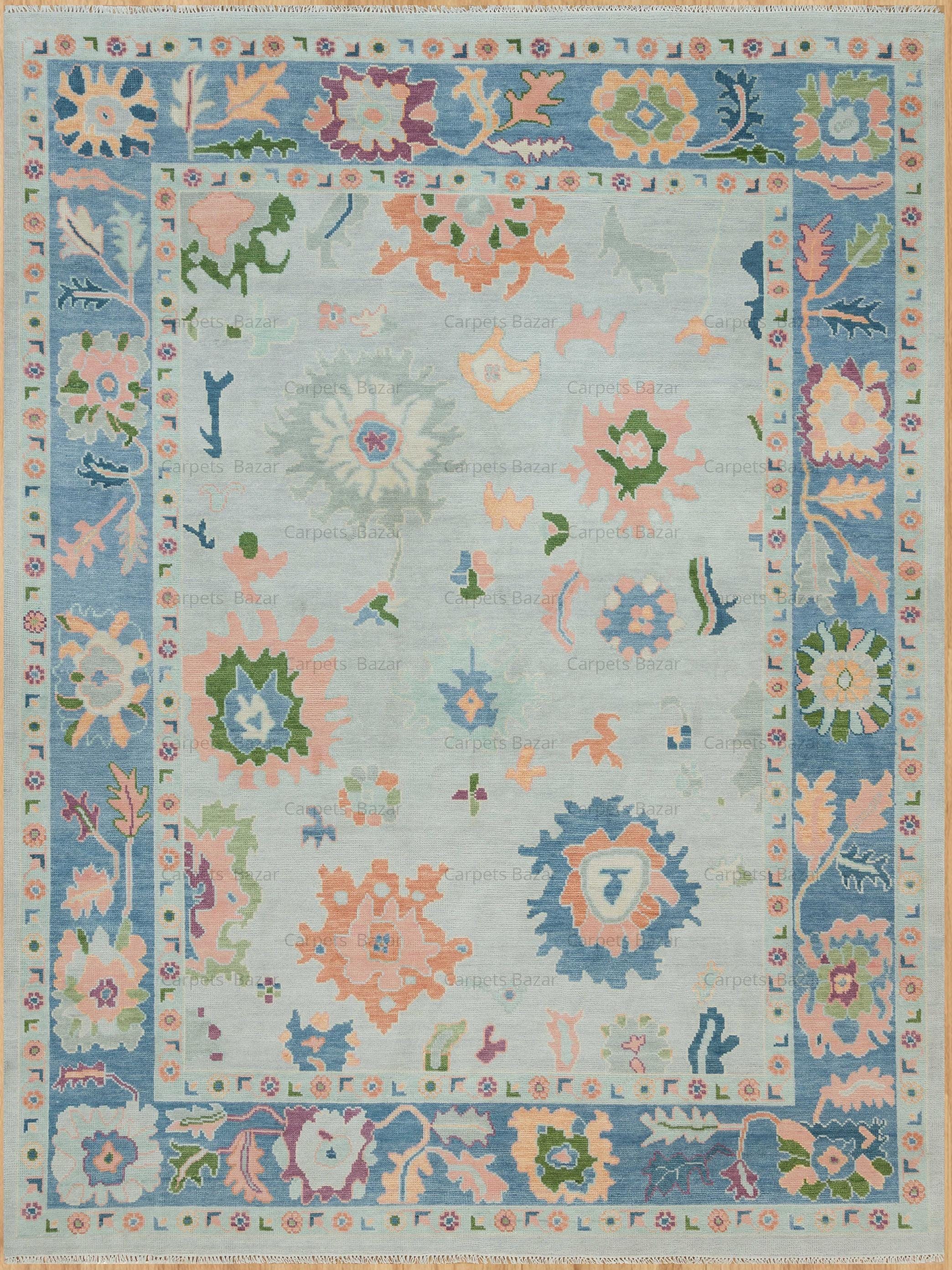This silver rug with blue border is available in all sizes from 5x8 area rug to 10x14 large. The floral oushak area rug with green, orange & purple accents is handwoven wool. The rug features a silver field framed by a blue border. The gray Turkish rug is adorned with soft floral motifs in shades of orange, green, purple, and ivory for just the right pop of color. The silver and blue rug is a colorful, handcrafted masterpiece whether you're styling a modern farmhouse, transitional living room, or a serene bedroom retreat. Crafted using premium-quality wool with 20–40 knots per square inch, the silver blue Oushak wool rug is luxuriously plush but never bulky—and perfectly pet- and kid-friendly.