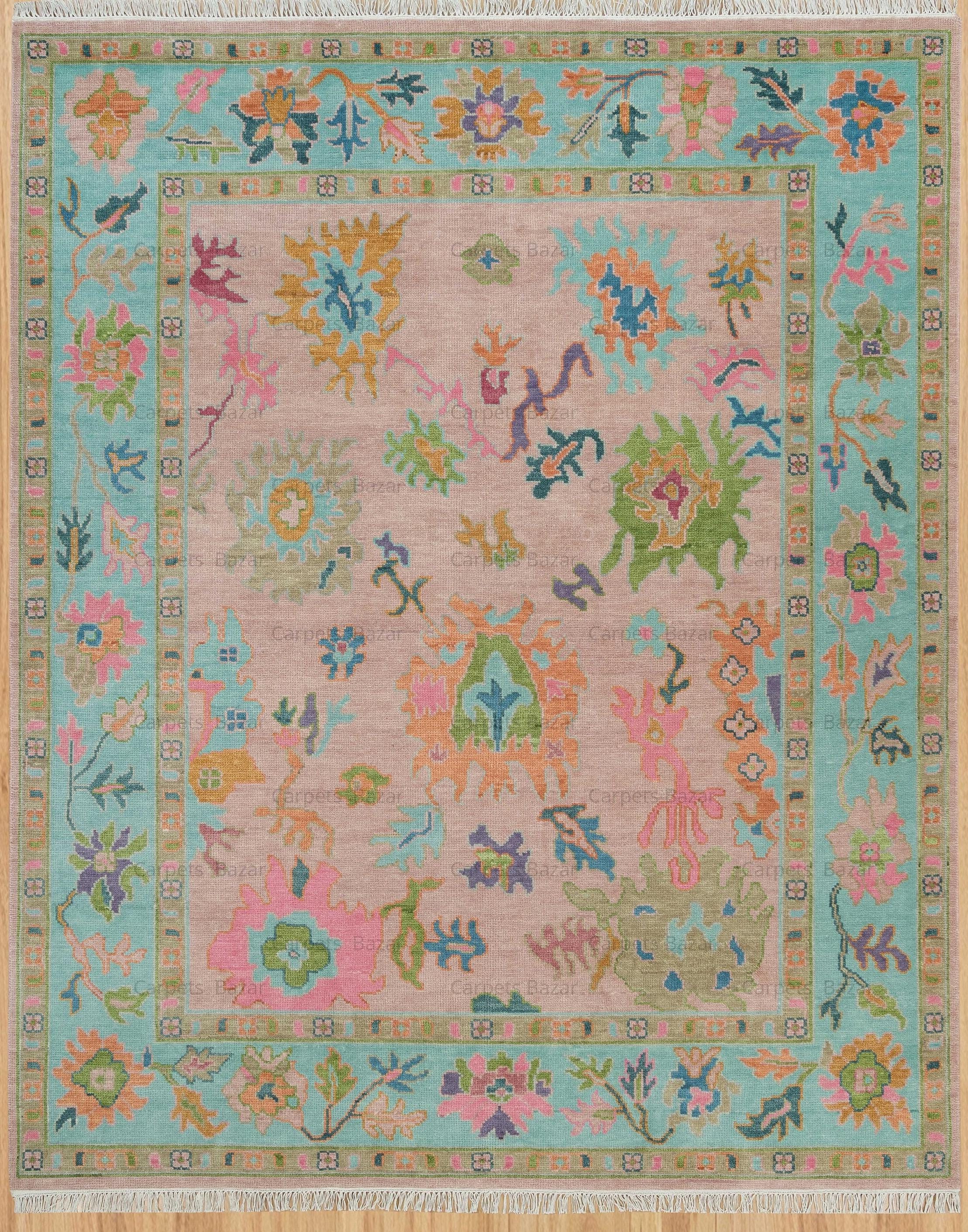 This stunning pink and blue Oushak rug is handwoven in premium quality wool. The area rug features a soft medley of beige, green, purple, orange, and teal accents. The result? A vibrant rug that fits a nursery décor and a statement bedroom. If you looking for a rug that goes well with a white couch or fits a mid century modern space, this hand woven rug is it. The Turkish Oushak rug is 100% cut-pile (no loops!) – making it pet- and kid-friendly. It’s made to last with about 20–40 knots per square inch and it’s easy to maintain with simple vacuuming and spot cleaning