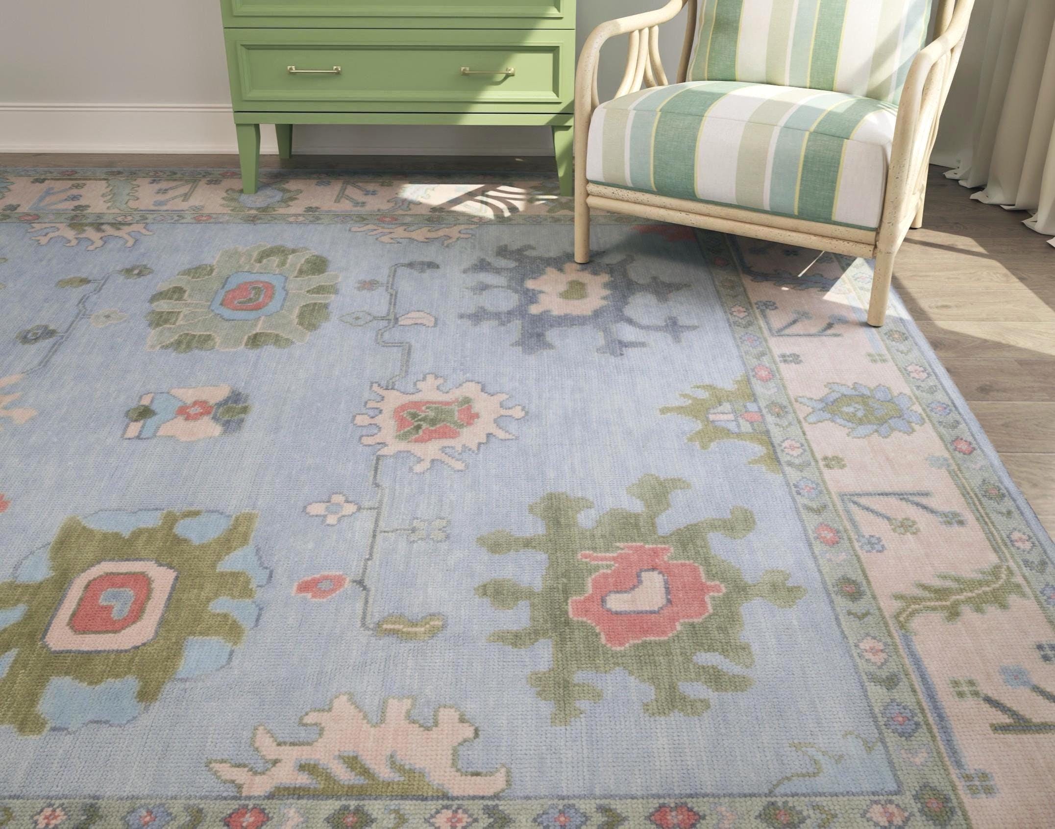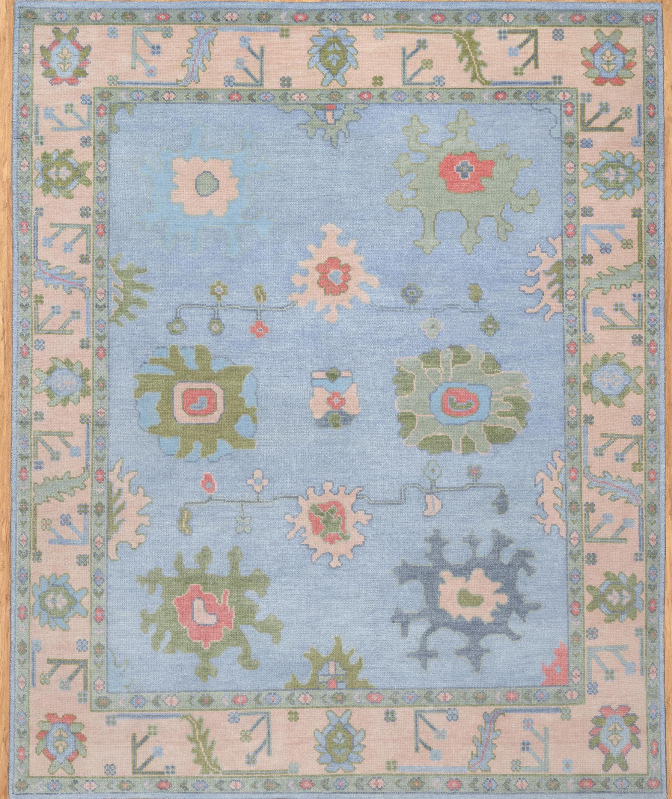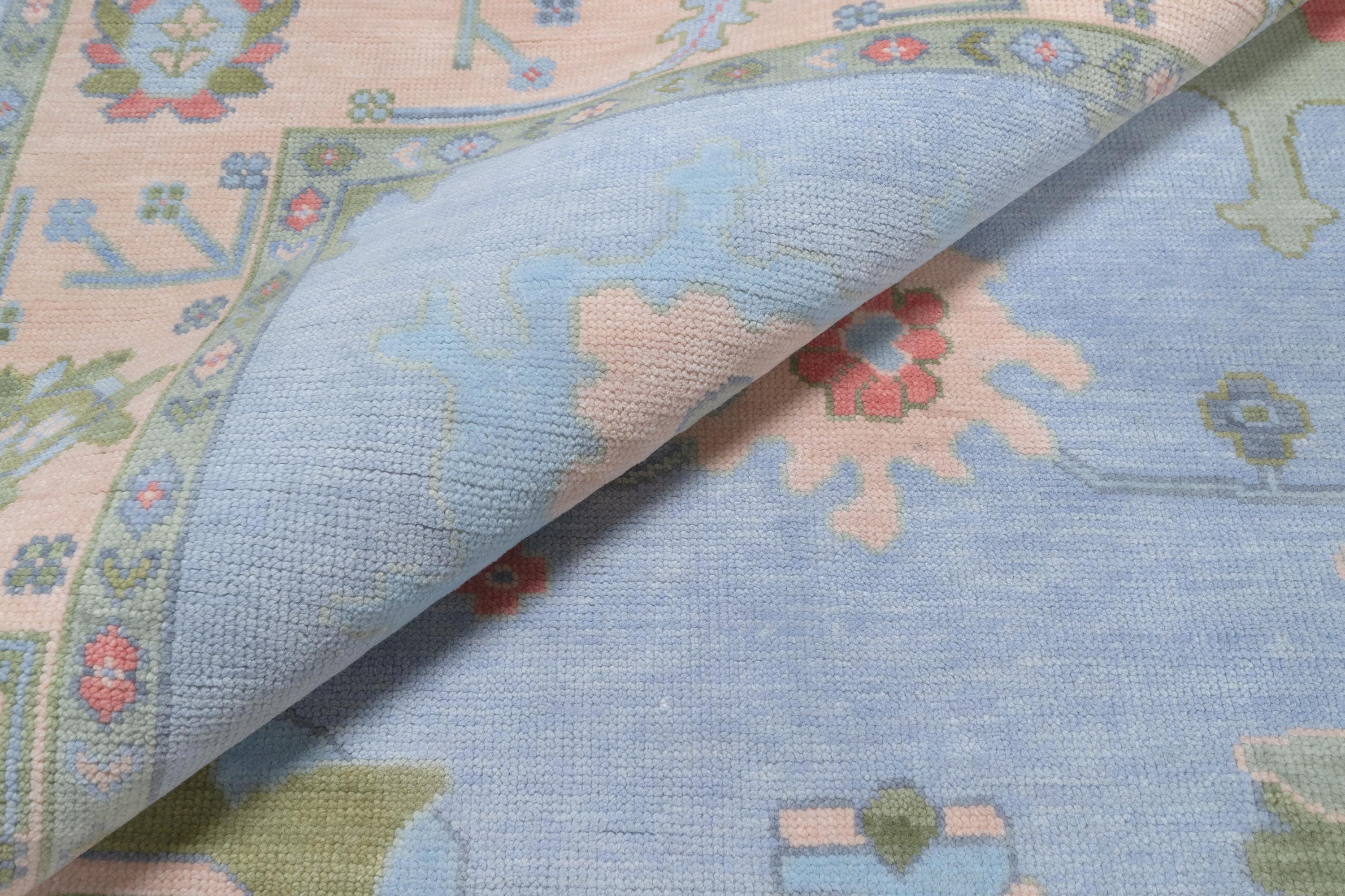 A stunning handmade Oushak rug featuring a serene light blue background adorned with soft pastel floral and abstract motifs. Crafted with premium-quality wool and a sturdy cotton backing, the blue and beige rug has 20-40 knots per square inch, which make it super soft and plush. The highlights in green, pink and dark blue make the modern oushak rug a versatile choice for living rooms, bedrooms, or dining areas. Perfect for both modern and traditional settings, pastel color Turkish Oushak rug brings warmth, style, and a cozy ambiance to any home. This Carpets Bazaar design is available in all sizes from small 4x6 area rug to large 10x14 wool rug.