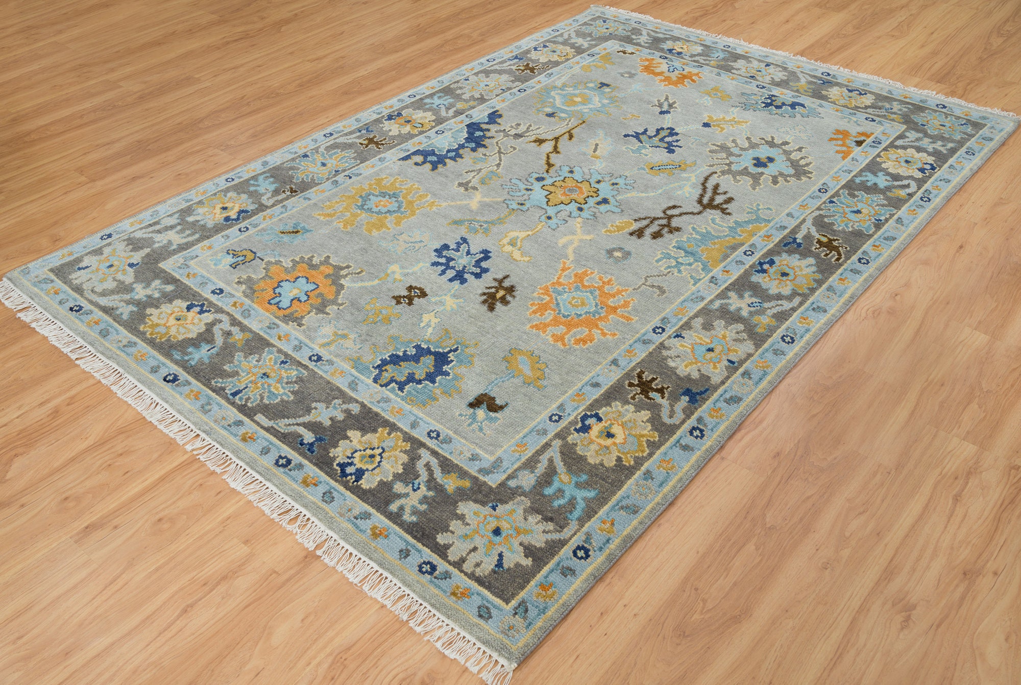 This hand-knotted oushak rug in gray has blue orange, brown & gold accents. Available as a 5x8 area rug, 8x10 living room rug, and oversized 9x12 wool rug and in custom rug sizes. We call this wool area rug Touch of Brown. This Carpets Bazaar rug design strikes the perfect balance between neutral tones and vibrant colors. Hand-knotted in premium wool, this silver gray rug is accented with warm hues of rust, sky blue, and yellow.The colorful yet muted palette of the Turkish carpet makes it versatile enough for a living room, dining room, or hallway, adding warmth and charm to any space.