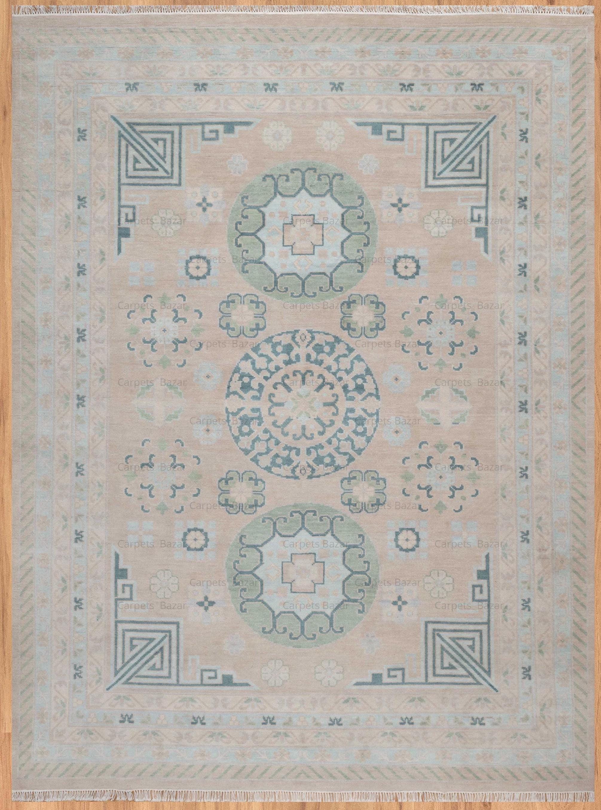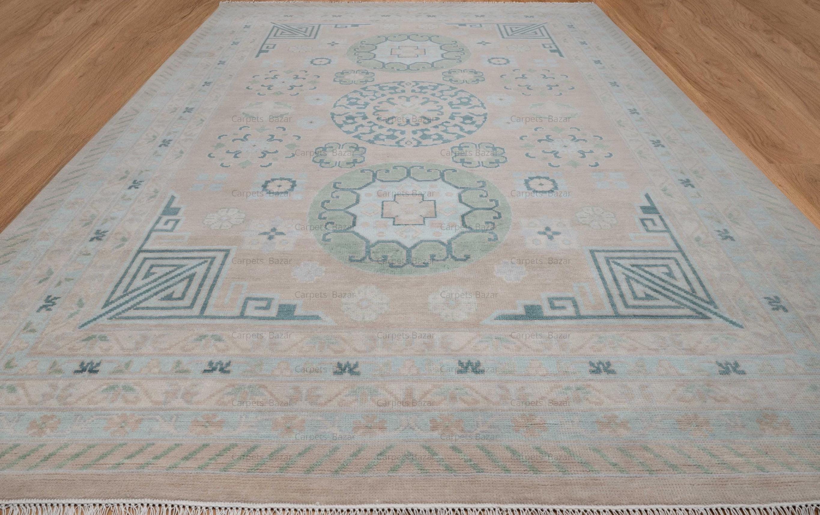It’s hard to explain the beautiful pastel colors of this hand woven Oushak wool rug in words. The Turkish area rug with a medallion pattern in the center is pinkish peachy tan cream. The pastel toned rug has subtle ice blue borders and motifs in sage green, seafoam, pearl white, pale aqua, and silver gray. This Carpets Bazaar design is apt for traditional, modern, farmhouse, or transitional interiors. Meticulously hand-knotted with a high knot count, this Oushak area rug offers a plush yet durable texture underfoot. Crafted from 100% cut-pile wool, it’s soft, shed-free, and doesn’t require a rug pad. Easy to maintain with regular vacuuming, this rug is pet-friendly, child-friendly, and made to last for generations. Perfect for adding elegance to living rooms, dining rooms, bedrooms, nurseries, or entryways. The pastel colored Oushak is available in all sizes from small 5x8 area rug to oversize 12x15, including custom sizes.
