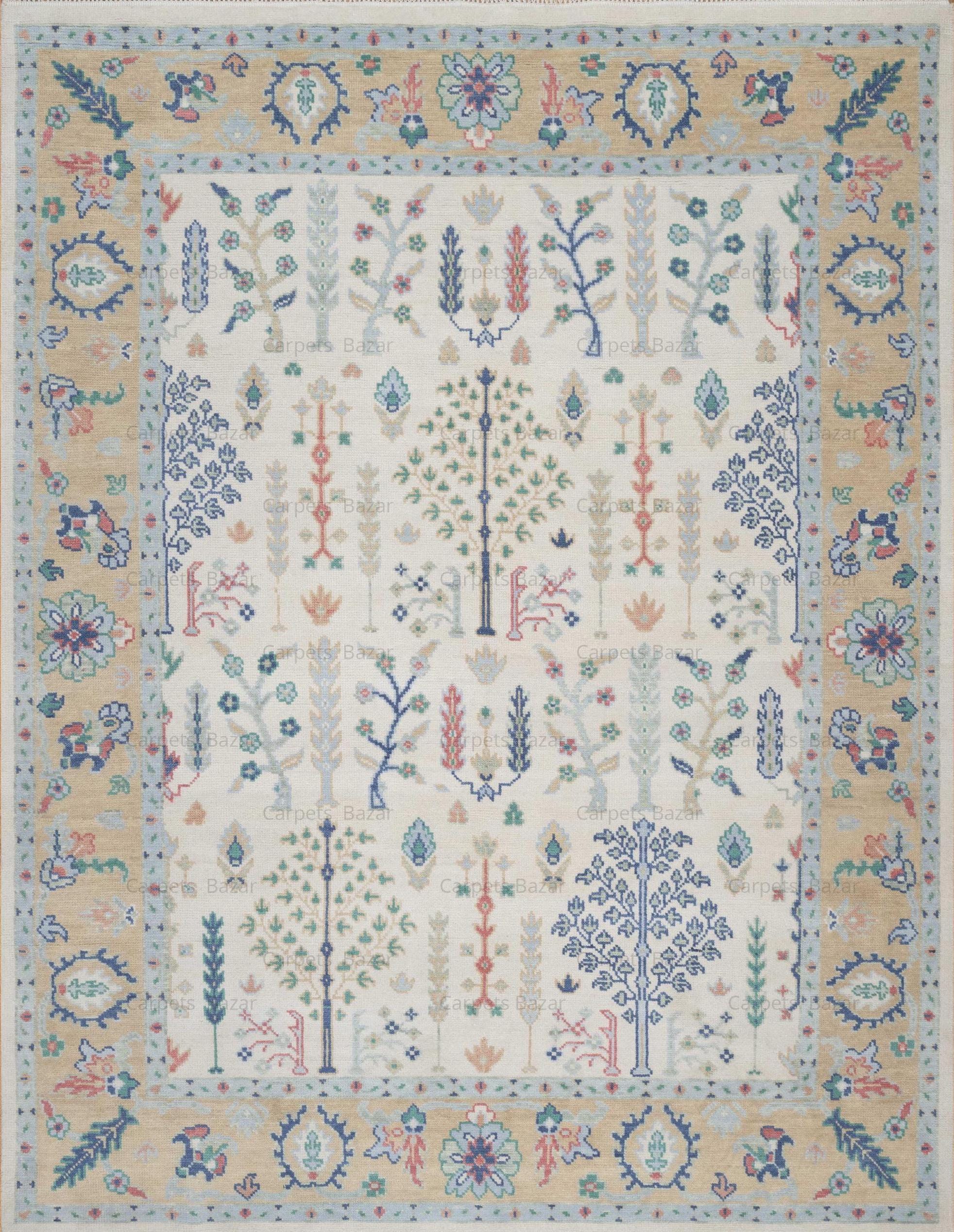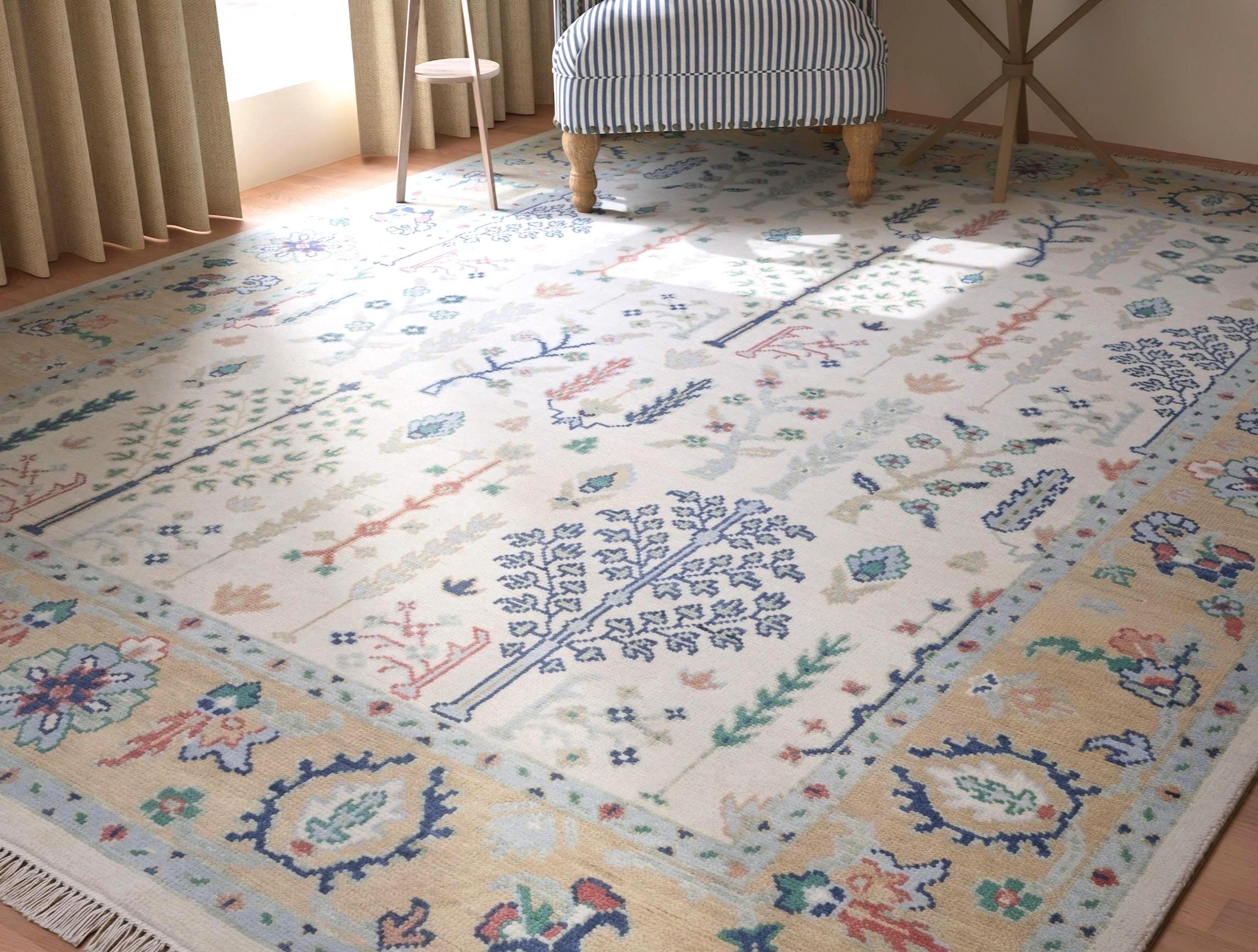 Hand Knotted Oushak Rug, Ivory Beige Wool, Turkish Floral Design AR_3859