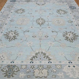This isn’t just any vintage feel Oushak rug. It’s a masterpiece with a high-low weave that creates a stunning 3D effect. Run your hands over it, and the pile will all be the same height. Yet the LOOK of the distressed Turkish rug has depth and dimension that sets it apart from every other rug out there. The muted yet rich blend of soft sky blue, warm beige, and gentle taupe of the neutral area rug brings an effortlessly elevated vibe to any space. Whether it’s your living room, bedroom, or dining area, this handknotted wool rug doesn’t just complement the decor—it defines it. The intricate Turkish Oushak design—floral motifs, delicate vines, and timeless medallions, all with a distressed finish give it that coveted vintage charm. It’s the perfect mix of old-world elegance and modern sophistication. The 8x10 oushak rug is available for immediate shipping.