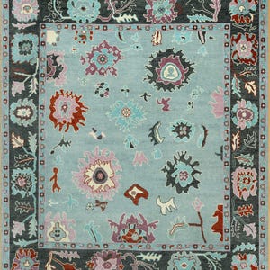This handmade Turkish Oushak wool rug has a soft ivory field and a sky blue border, it is beautifully accented with rose pink, terracotta, sage green, gold, and cornflower blue. The muted floral motifs, inspired by traditional Oushak designs, give this Carpets Bazaar rug a subtle yet striking presence, making it a versatile choice for both modern and classic interiors. Crafted from 100% wool pile, this ivory area rug is plush, durable, and designed to last for generations. The elegant color palette and soft texture of the white carpet make it an ideal choice for the living room, bedroom, dining area, or entryway. Whether your style leans classic, cottagecore, or modern-boho, this handmade wool area rug will fit right in. The white blue and pink oushak rug is available in all standard rug sizes including custom measurements.