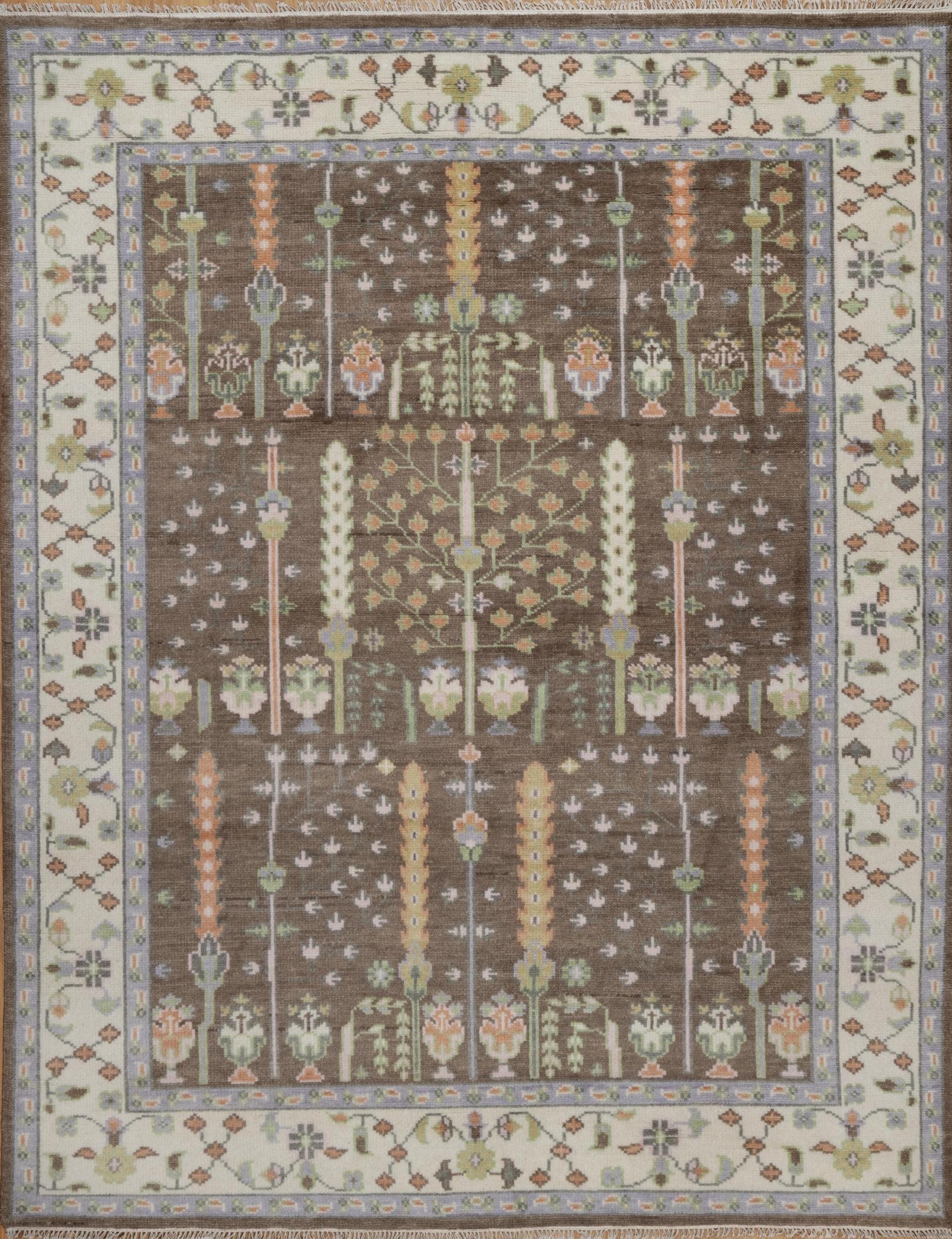 This stunning handmade wool Oushak rug features an intricate Tree of Life design. The brown wool rug has an ornate floral border in warm ivory tones. The very traditional carpet has an exquisite Persian-inspired design with symmetrical botanical patterns in green, blue, coral and white. The Oushak area rug has contemporary aesthetic perfect for modern home decor. The gorgeous 100% wool rug was made for neutral styling. The brown and white rug comes with Intricate Detailing. Long-Lasting Quality. Soft Texture. No shedding. It's easy to maintain and far softer than you can imagine.