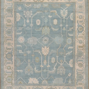This Silver Gray Oushak Rug with ivory border, is a handmade Area Rug with Blue & Orange Accents. We call this Turkish rug, Creamsicle. Soft, Durable & Pet-Friendly the wool rug has a muted color palette perfect for farmhouse décor or mid century modern style homes. Hand-woven in premium wool with about 20–40 knots per square inch, the gray and white Oushak rug has a plush, cloud-soft pile that’s not overly dense—ideal for daily living. The Carpets Bazaar rug is available in all sizes from small 5x8 area rug to extra large 12x15 living room rug. The neutral gray and ivory base is beautifully accented with rust-gold, peach, and blue highlights. Whether you’re styling a living room, dining room, or bedroom, this Turkish-inspired wool rug lifts any space.