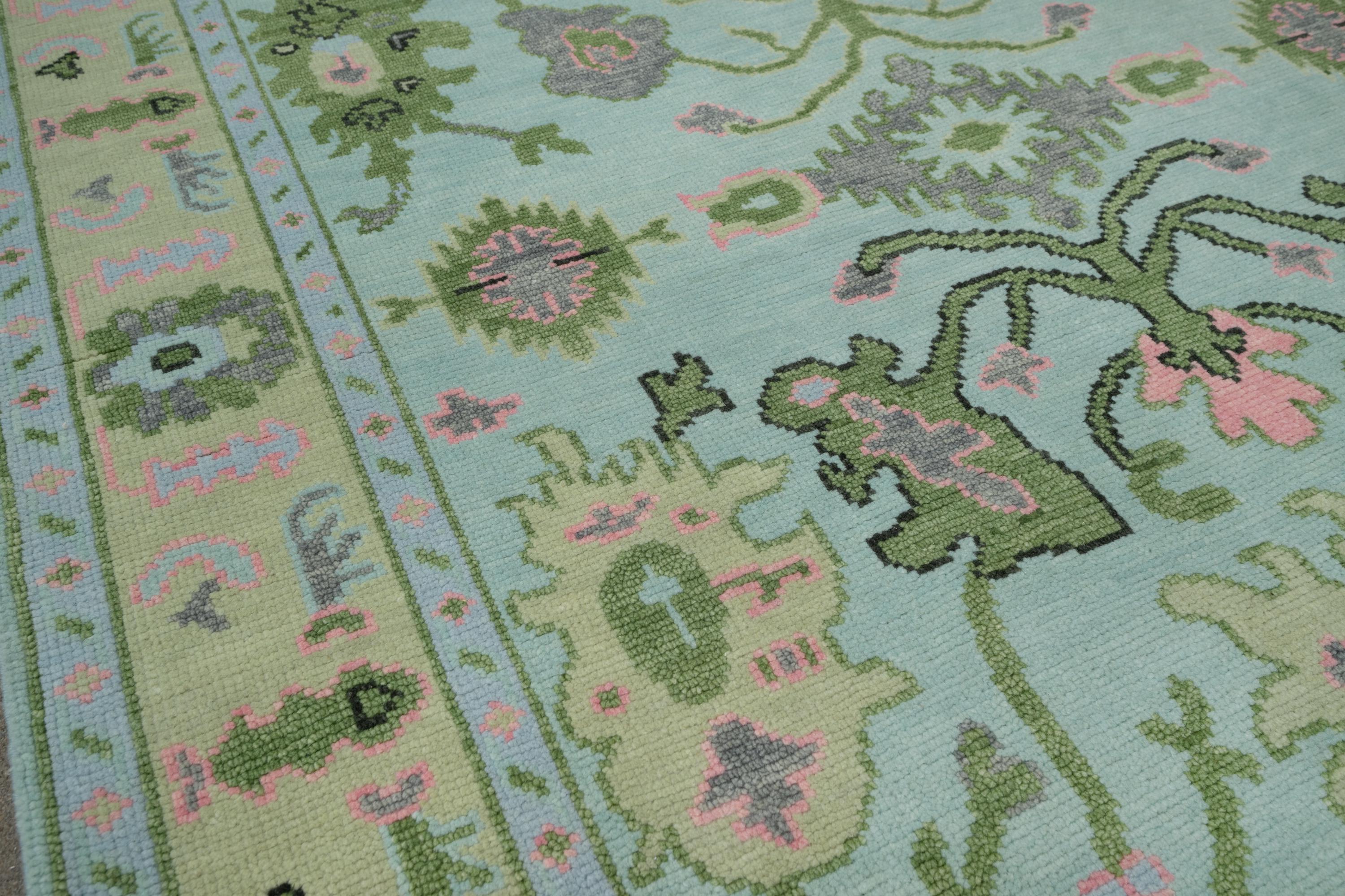 Handmade Oushak Wool Rug – Mint Green, Pink Floral Medallion AR_3872