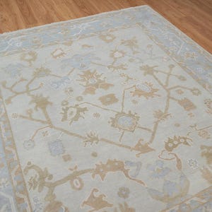 This hand woven Oushak area rug has a base that uses a blend of white, gray, and blue colors. The mixed colors give the rug a unique faded look that is just right for muted or neutral style home décor. The Turkish wool rug has bright aqua and pink floral accents. So the entire look of this Carpets Bazaar design looks like a watercolor painting. Hand-knotted in premium New Zealand wool, the Oushak rug is available in 8x10 size, perfect for a bedroom or living room. The blue hues of the carpet also make it a great choice for nursery décor and baby shower gift. Part of our fine wool collection, the gray blue rug is very durable, luxurious, super soft and has intricate details. If you’re looking for an ultra-luxury area rug for your home, this is one is it!