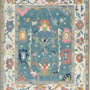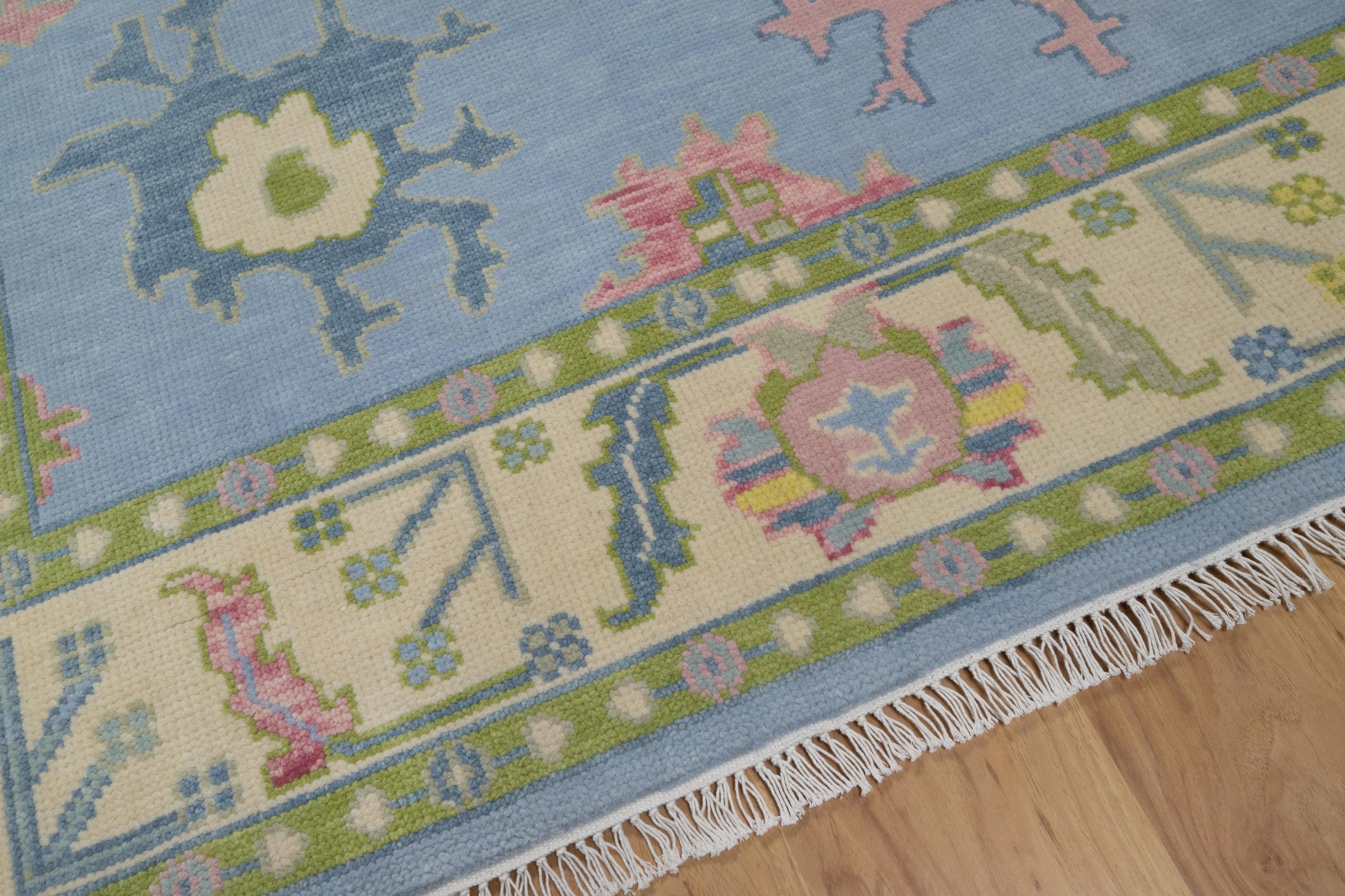 Handmade Oushak Wool Rug – Sky Blue Floral Oriental Carpet AR_3873