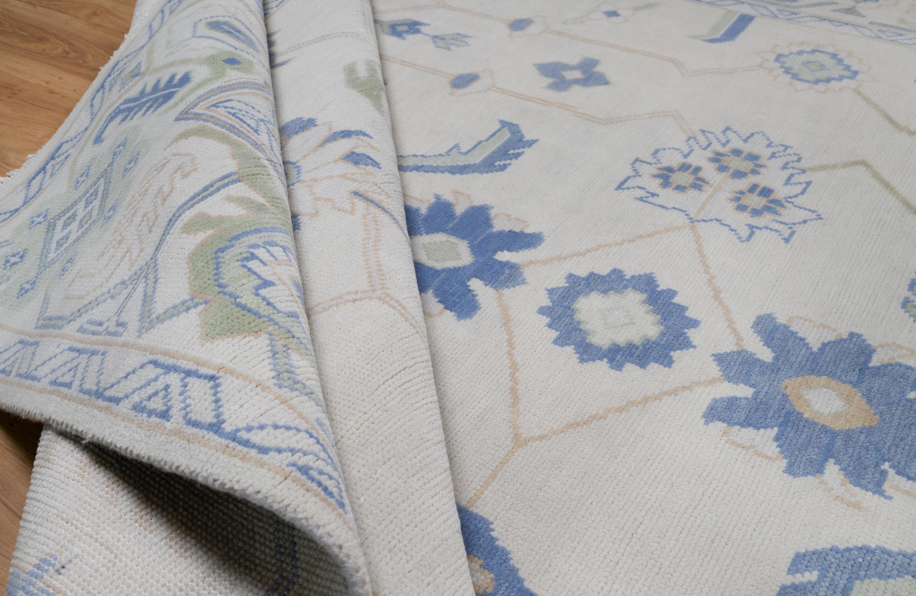 Handmade Oushak Wool Rug – Ivory, Blue & Green Floral Oriental Carpet AR_3880