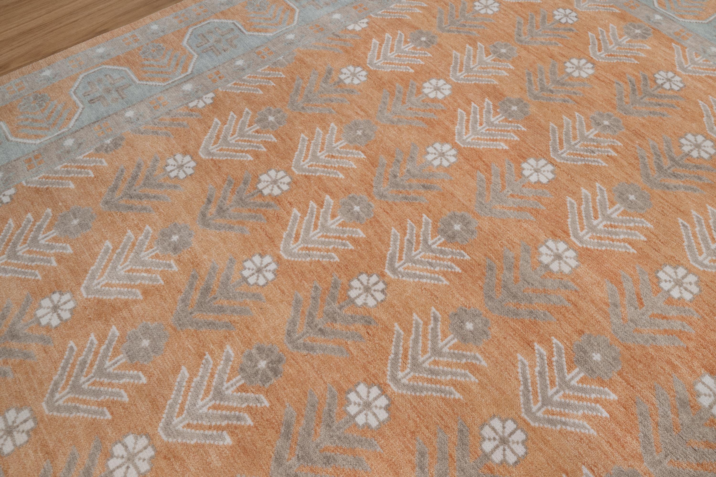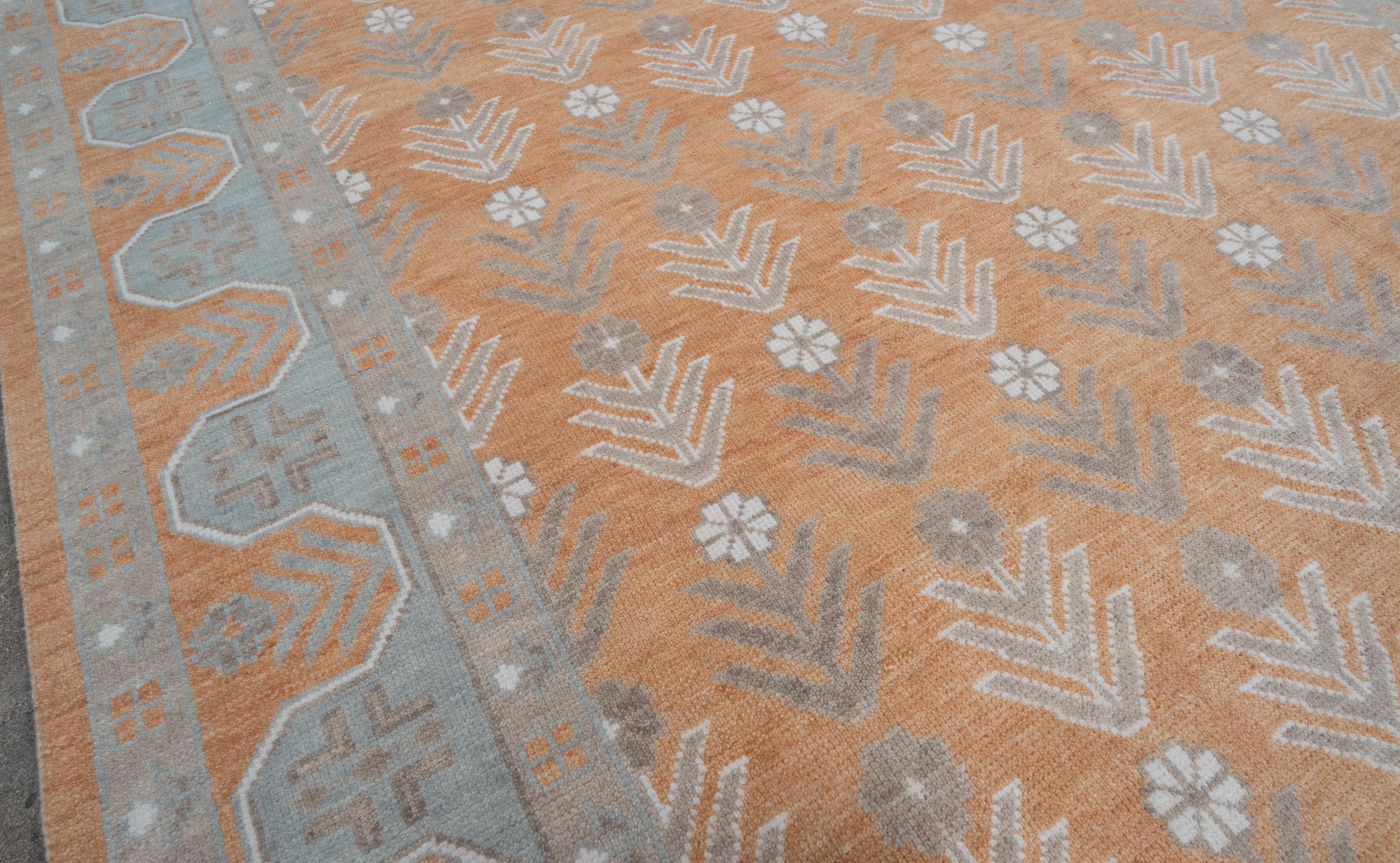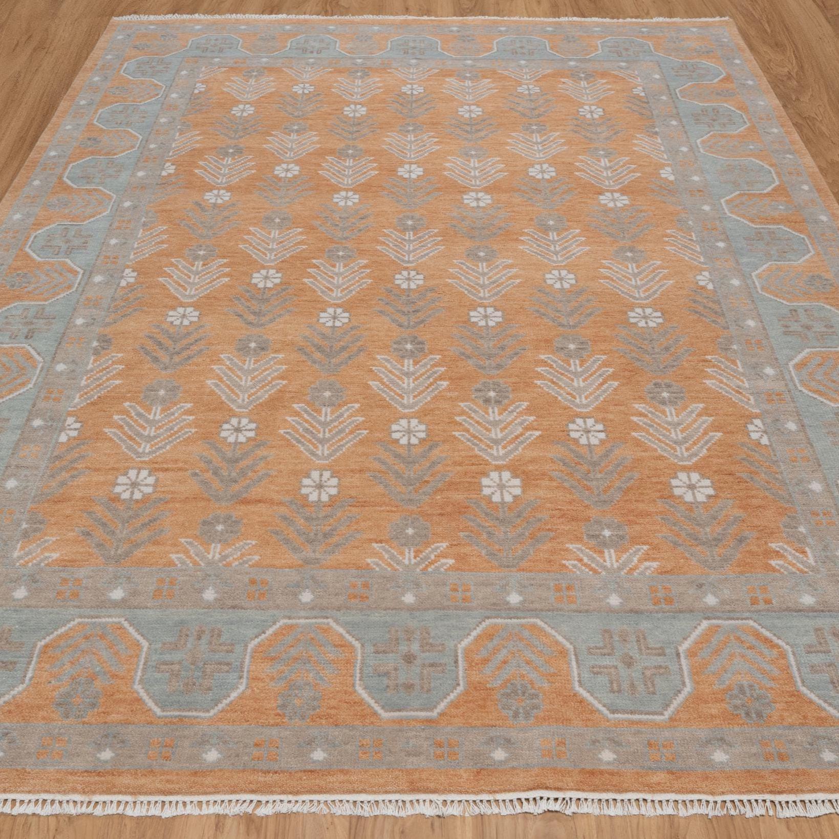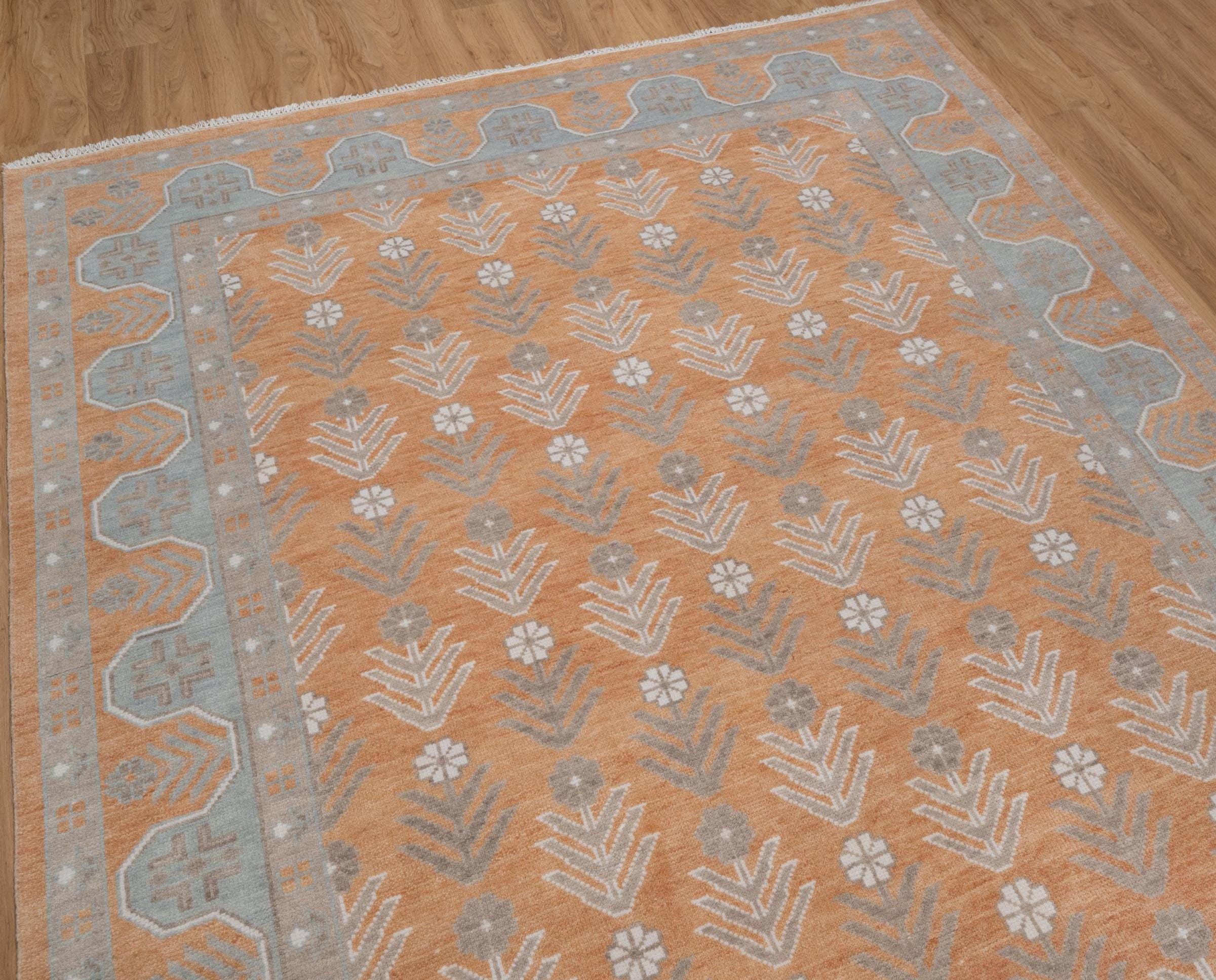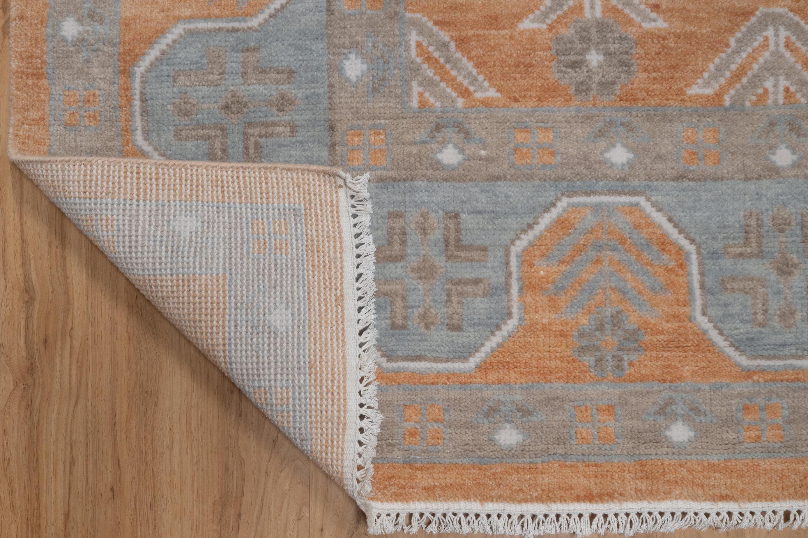 The beautiful peachy-orange field provides a warm, glowing foundation for the soft gray-blue geometric elements and cream floral rosettes that create visual rhythm across the surface. Each element is meticulously hand-knotted, demonstrating exceptional craftsmanship and traditional Turkish techniques. The design features repeating stylized tulip or arrow motifs alternating with delicate floral medallions in an all-over pattern that creates movement and harmony. The distinctive scalloped border in soft gray-blue adds architectural interest and frames the warm field beautifully with complementary geometric patterns. The sophisticated color combination of warm peach, cool gray-blue, and cream creates a balanced palette that works beautifully in both traditional and contemporary interiors, adding warmth without overwhelming the space. Perfect for living rooms, dining areas, bedrooms, or any space where you want to add authentic Turkish charm with welcoming, sophisticated colors.