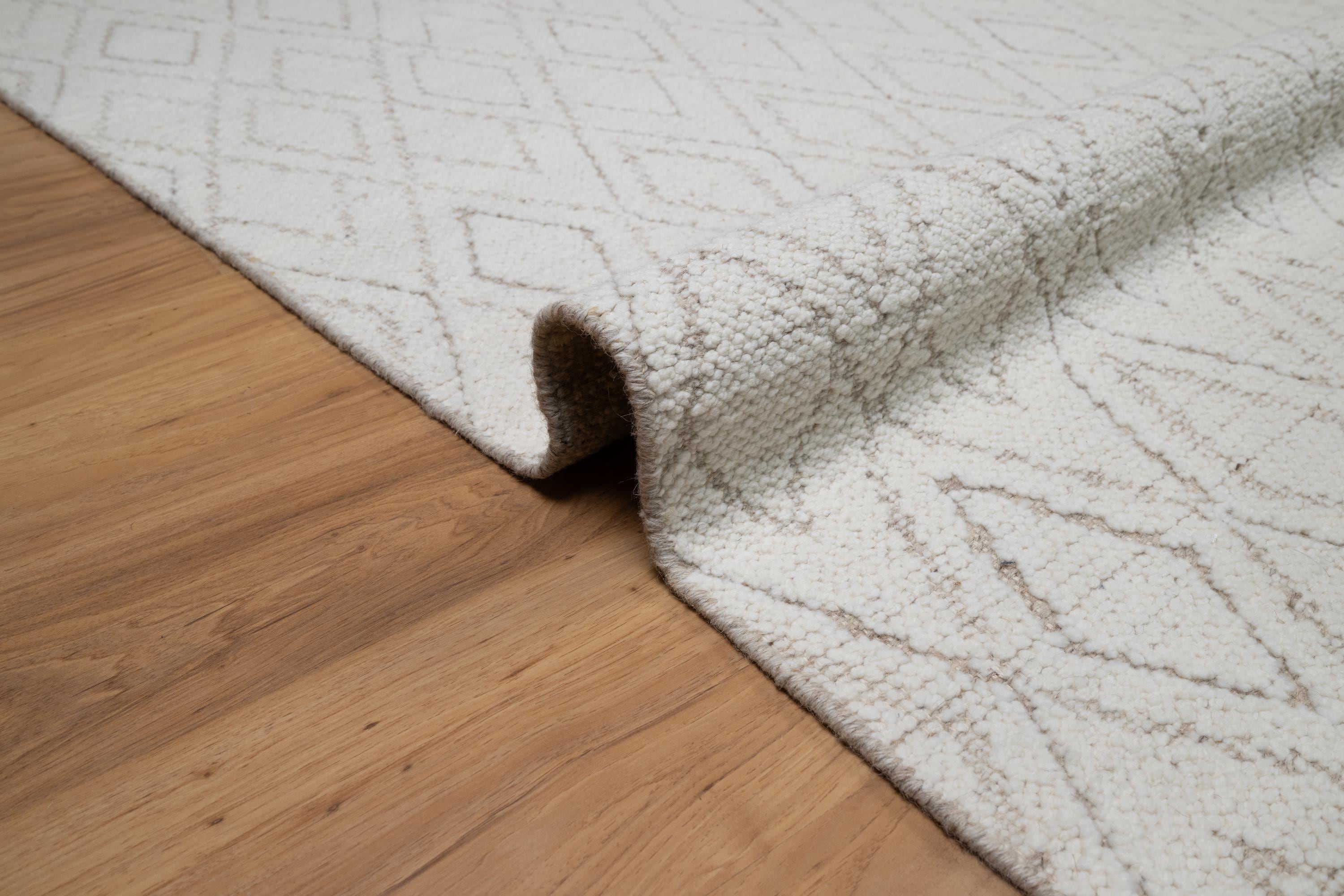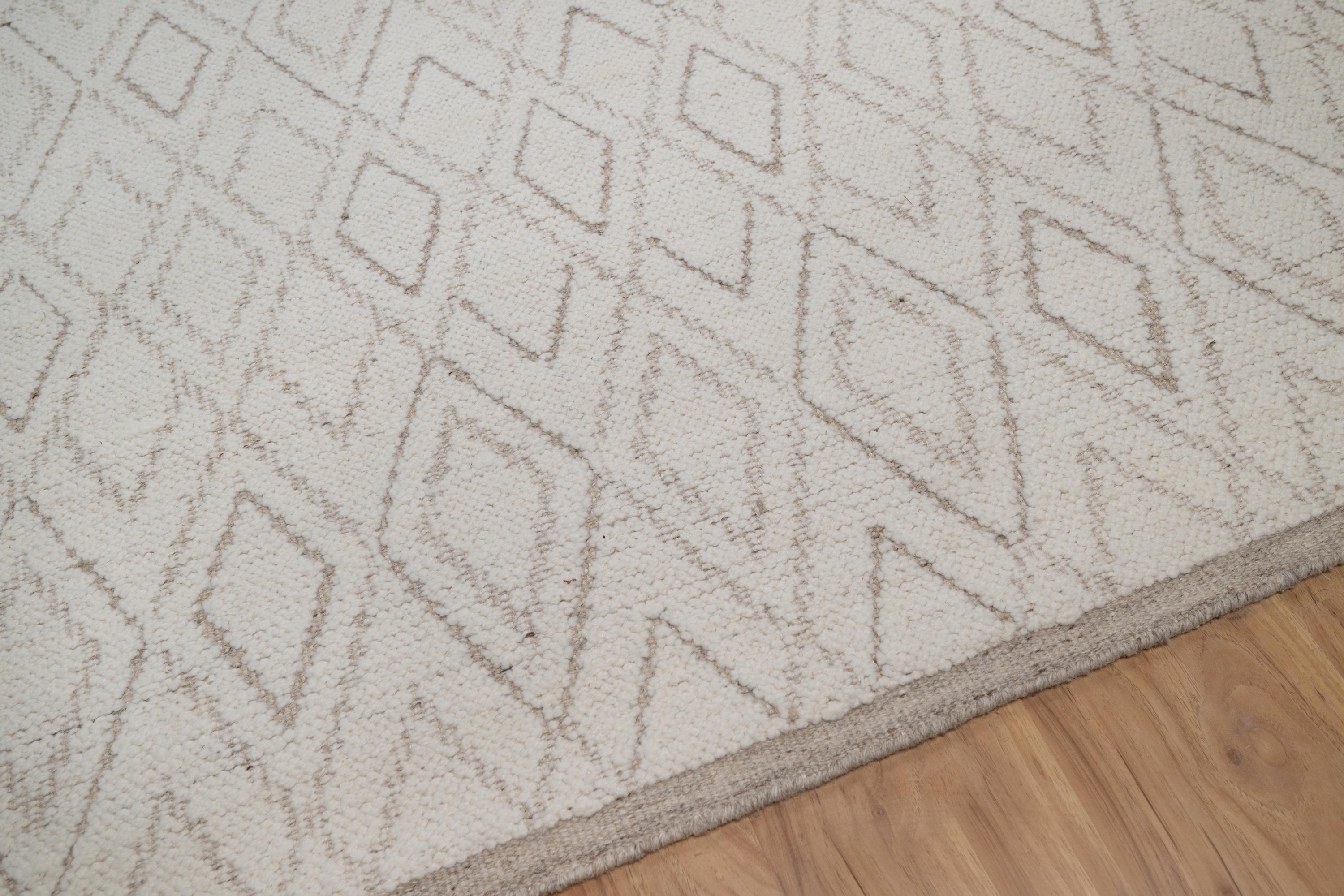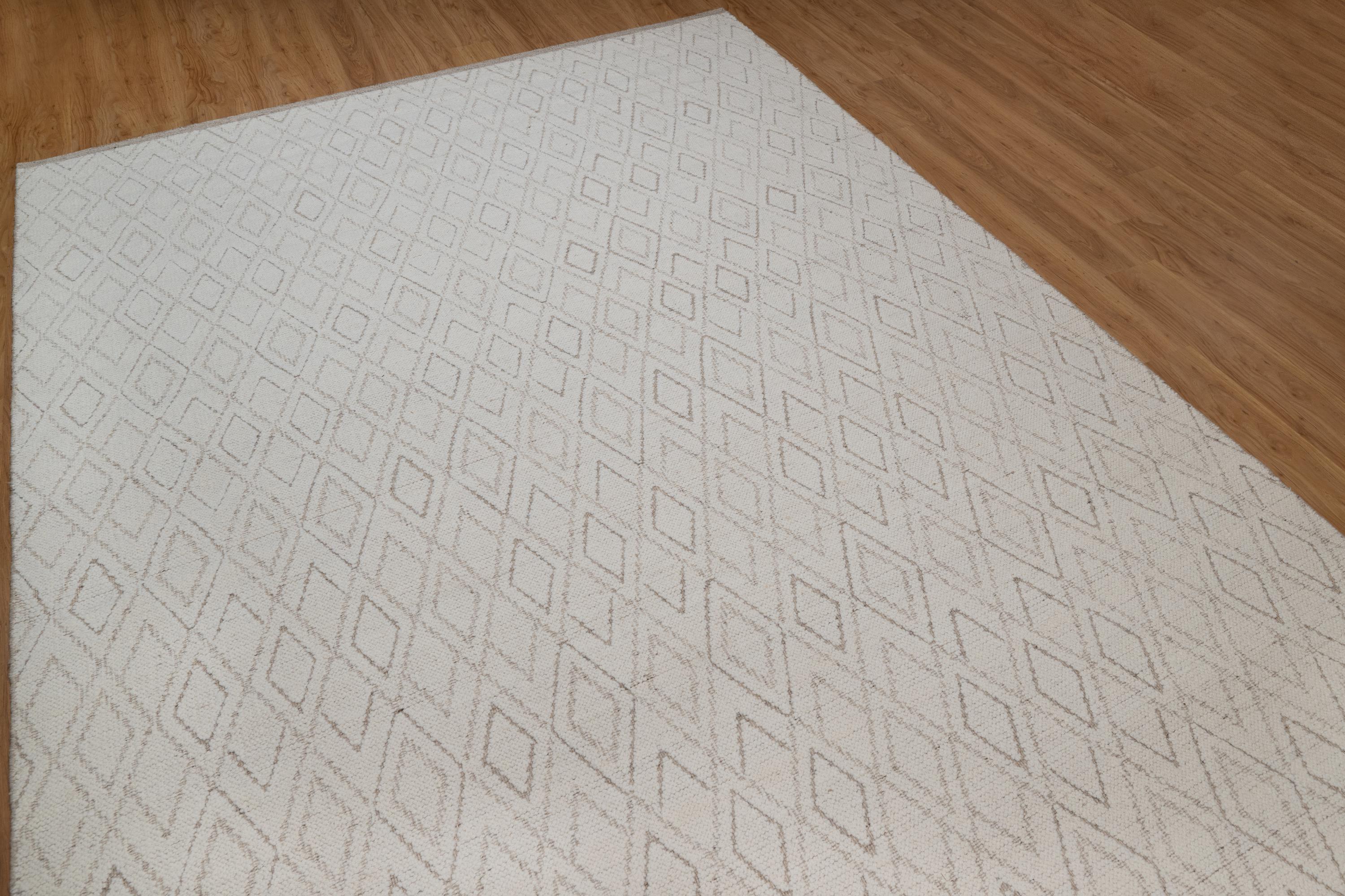 Elevate your home with this elegant handwoven Kilim rug featuring a timeless diamond lattice pattern in soft, neutral tones. This authentic flat-weave piece brings understated sophistication and versatile style to any space. This beautiful Kilim showcases a classic geometric diamond trellis design with delicate gray-taupe lines on a pristine ivory-cream background. The flat-weave construction is characteristic of traditional Kilim craftsmanship, making it reversible and perfect for high-traffic areas. Hand-loomed with care, this piece combines durability with refined elegance. Its softness underfoot is a testament to its premium construction, eliminating the need for backing—a clear indicator of its superior quality. Unlike cheaper rugs that rely on backing for support, this beige Moroccan Kilim stands out for its exceptional craftsmanship and durability. The soft, muted beige and ivory tones of the 8x10 flatweave rug create a harmonious blend that effortlessly complements any décor, demonstrating that simplicity can be incredibly chic. Designed for high-traffic areas, hand woven white and beige dhurrie is as durable as it is stylish, offering a perfect balance of practicality and elegance.