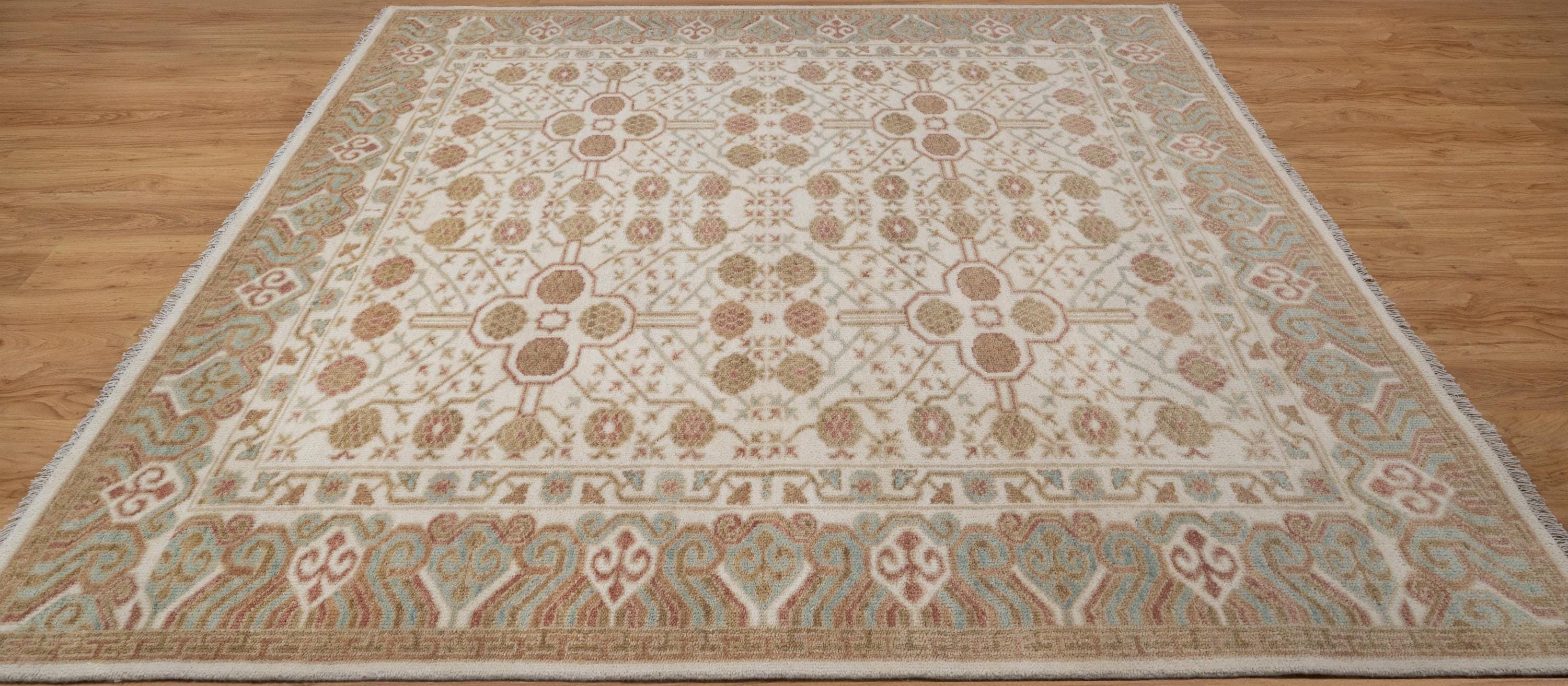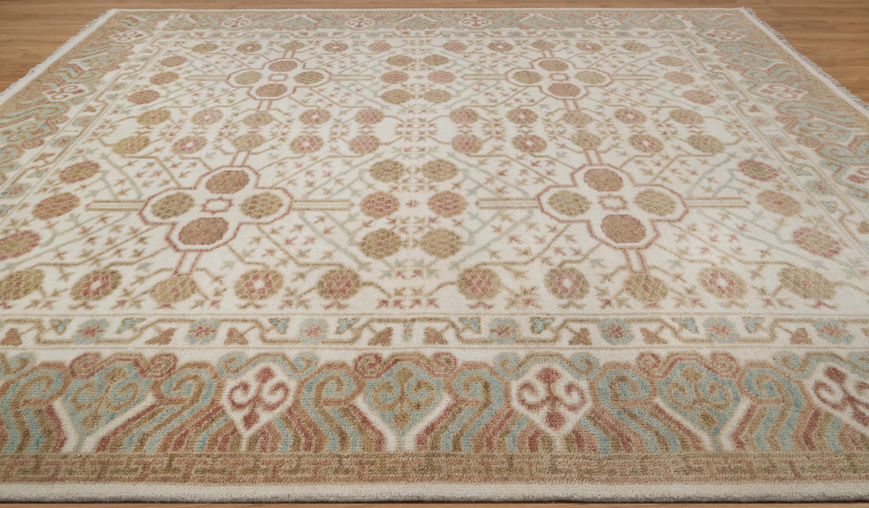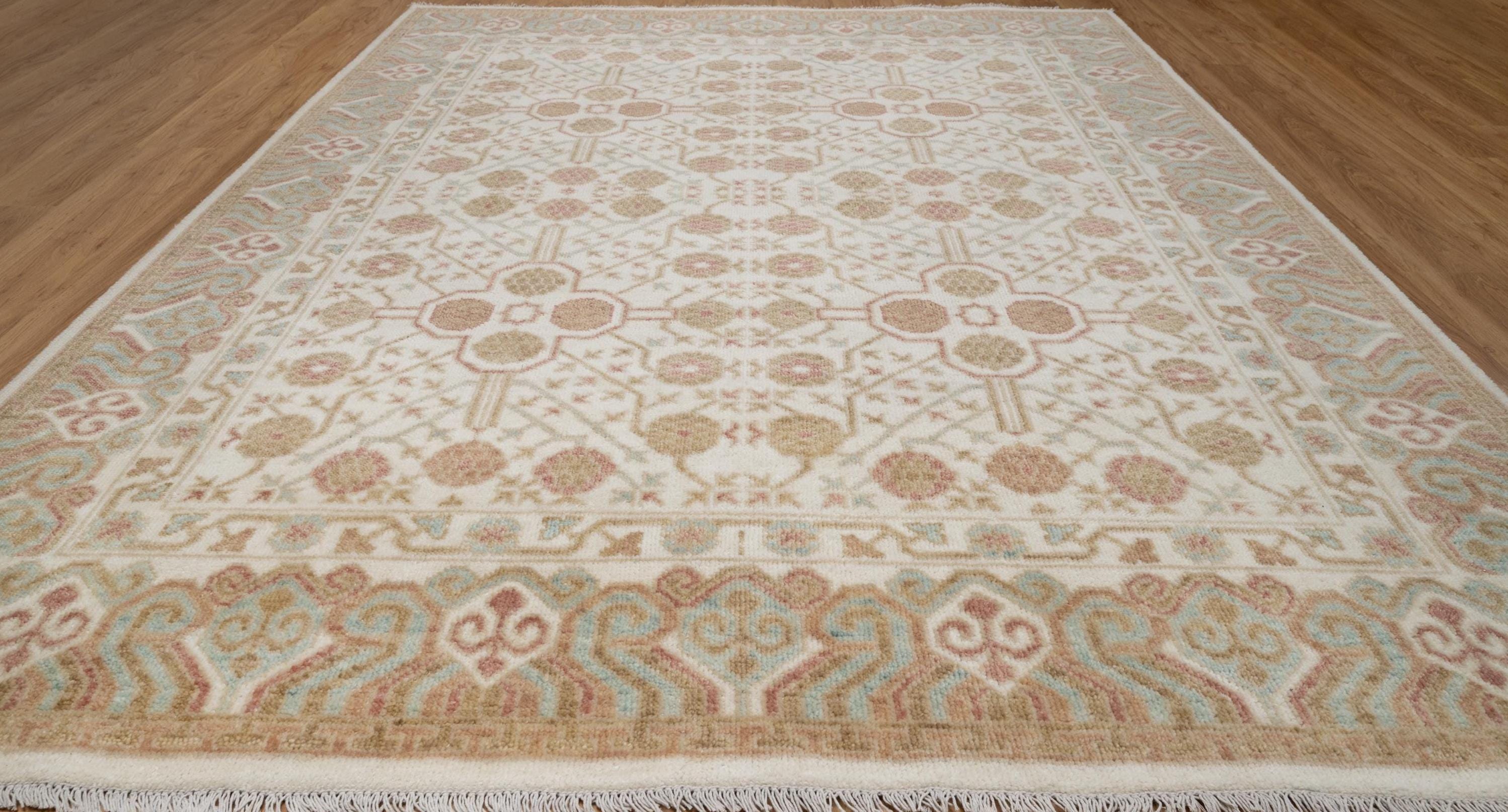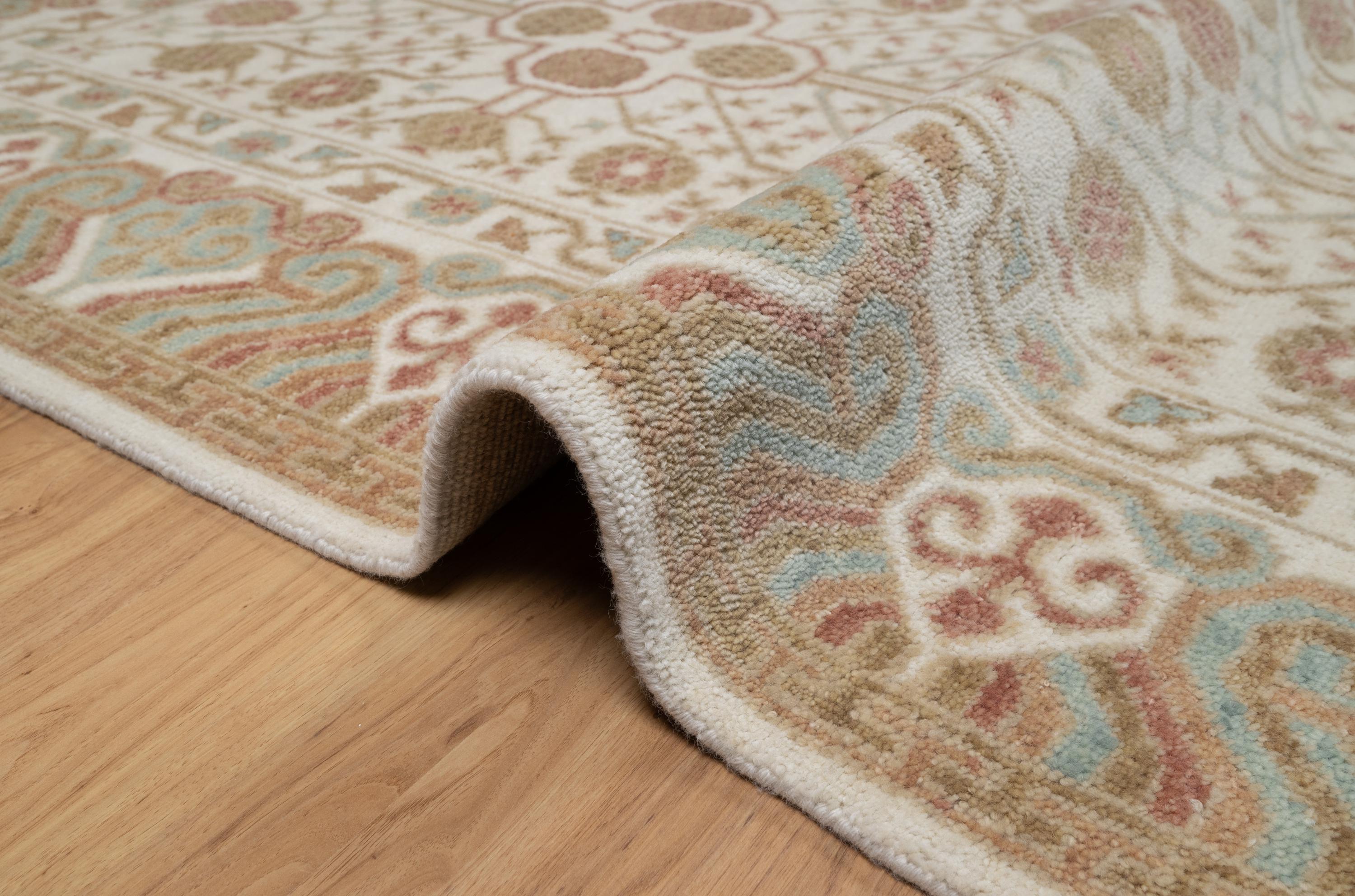 Discover the perfect blend of timeless elegance and serene beauty with this exceptional handmade wool rug. Featuring a sophisticated Persian-inspired design with delicate floral medallions and an ornate border, this piece brings museum-quality artistry into your home This magnificent hand-knotted rug is a masterpiece of traditional weaving artistry. The design features a mesmerizing repeat pattern of octagonal and circular floral medallions set against a pristine ivory field, surrounded by an exquisite border of flowing scrollwork in soft aqua and warm terracotta hues. Each intricate detail is created knot by knot, representing countless hours of skilled craftsmanship.