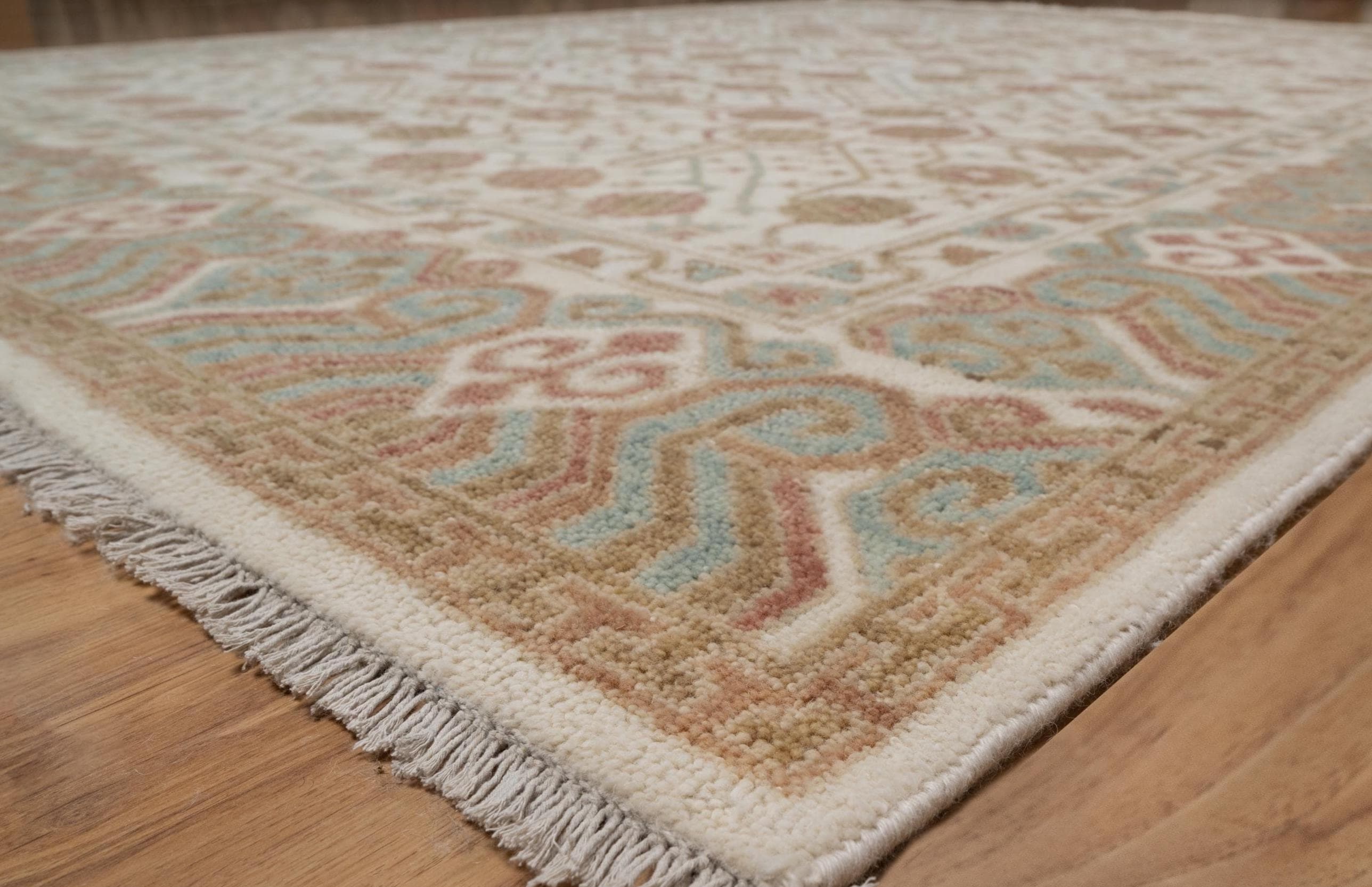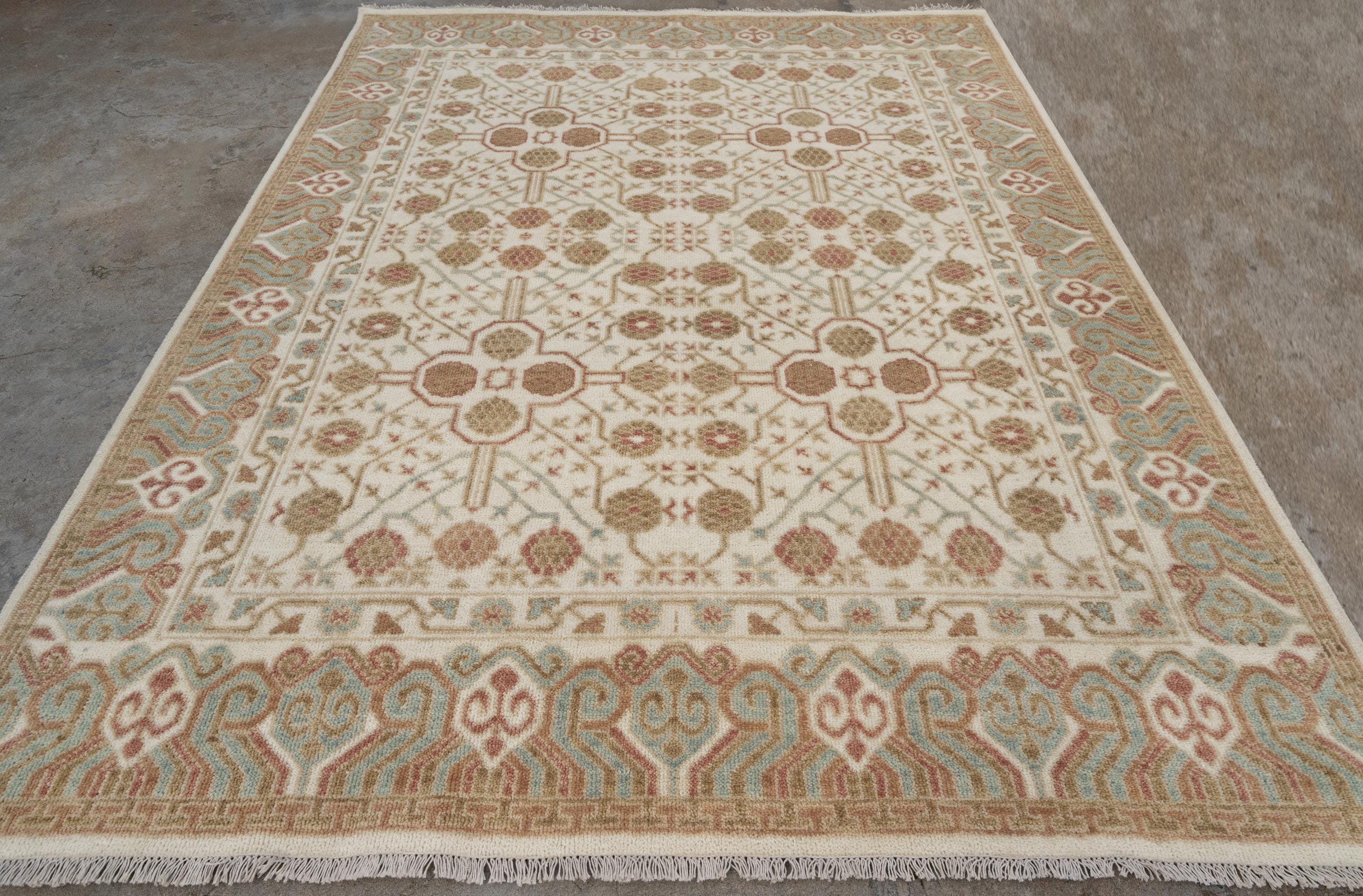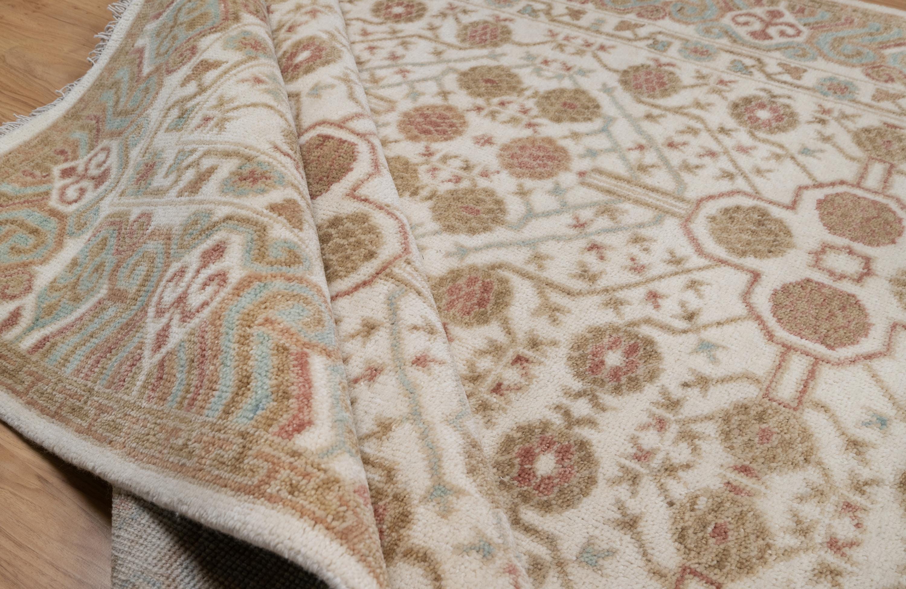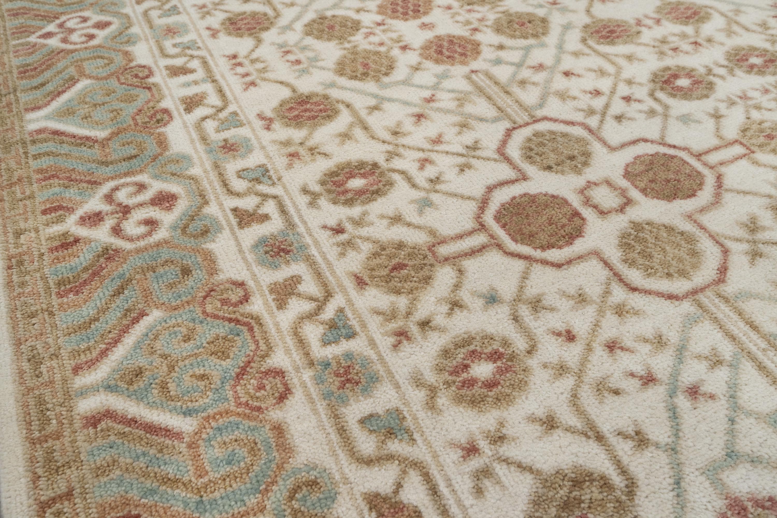 Discover the perfect blend of timeless elegance and serene beauty with this exceptional handmade wool rug. Featuring a sophisticated Persian-inspired design with delicate floral medallions and an ornate border, this piece brings museum-quality artistry into your home This magnificent hand-knotted rug is a masterpiece of traditional weaving artistry. The design features a mesmerizing repeat pattern of octagonal and circular floral medallions set against a pristine ivory field, surrounded by an exquisite border of flowing scrollwork in soft aqua and warm terracotta hues. Each intricate detail is created knot by knot, representing countless hours of skilled craftsmanship.