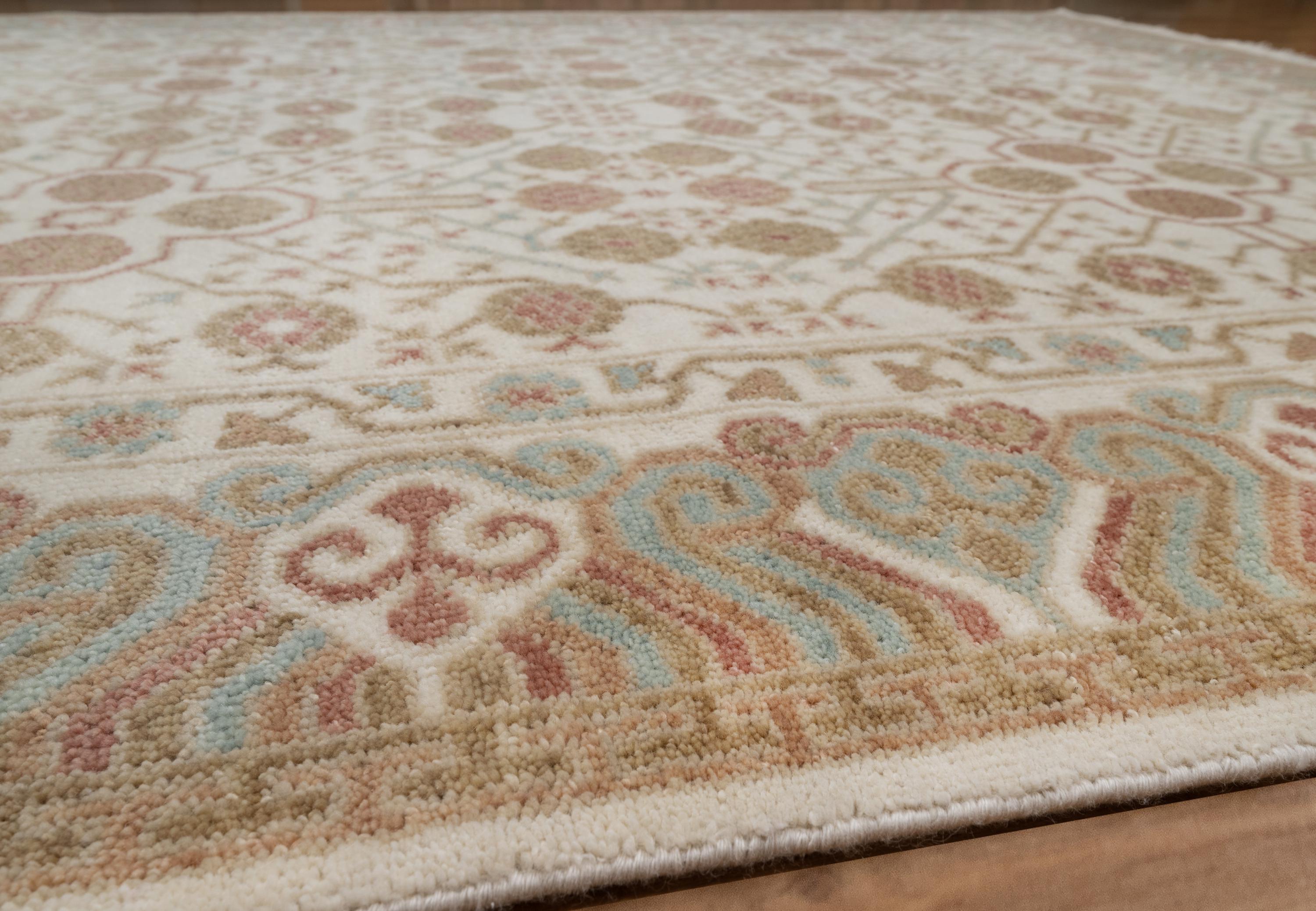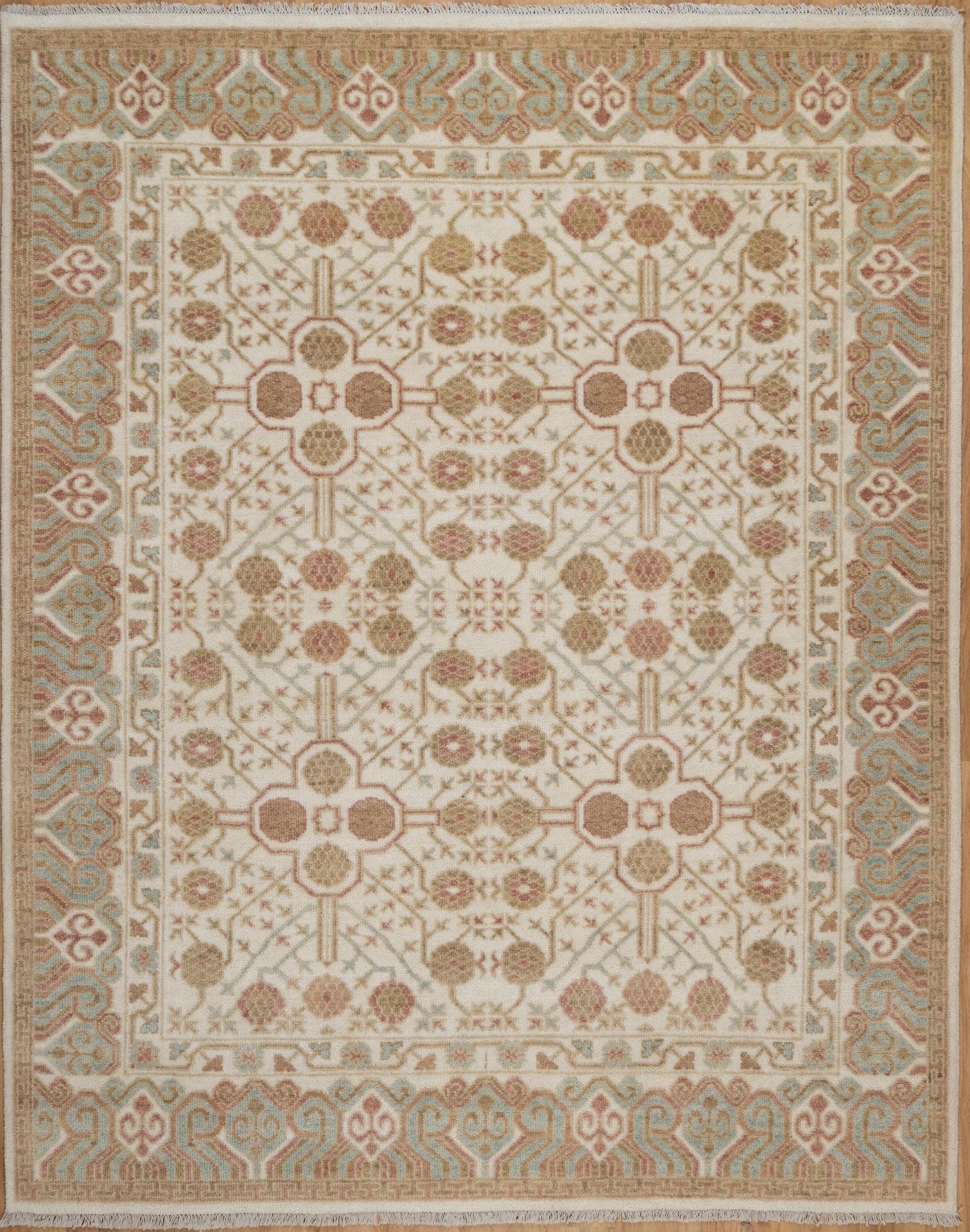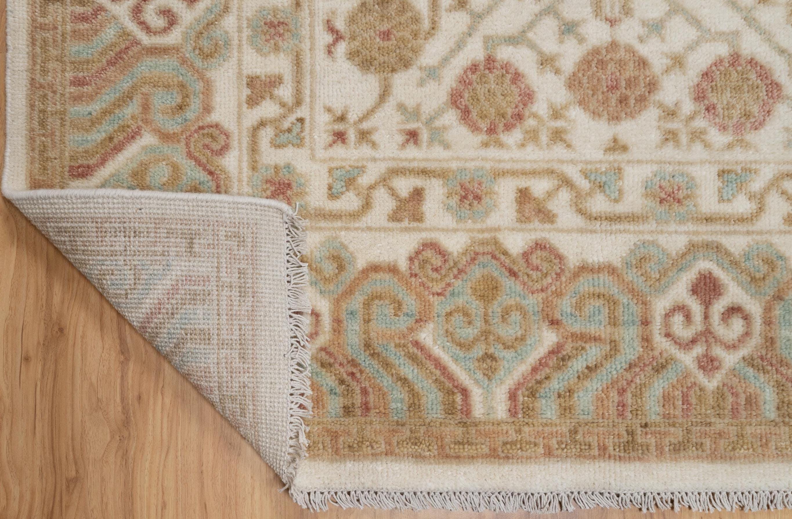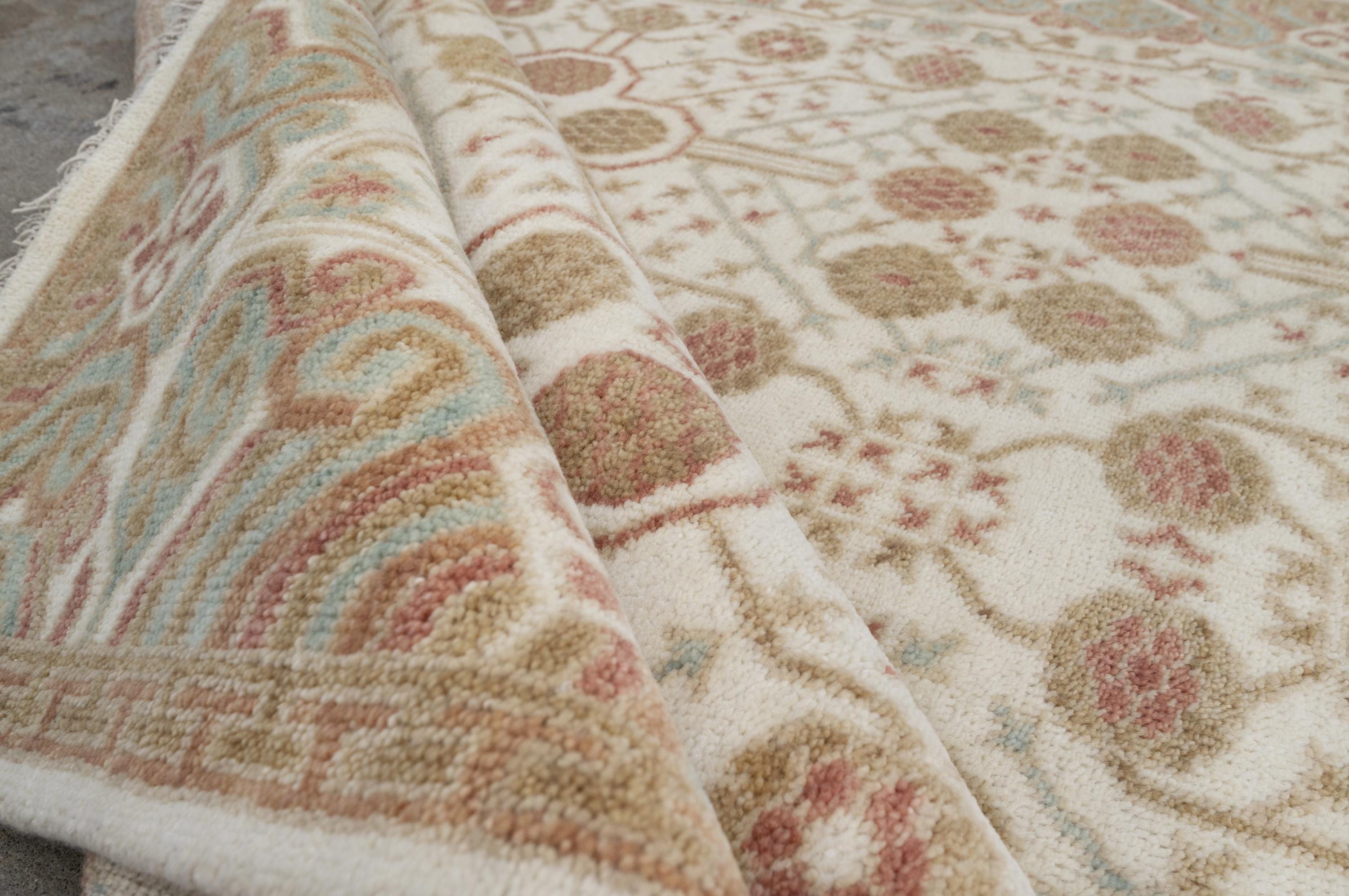 Discover the perfect blend of timeless elegance and serene beauty with this exceptional handmade wool rug. Featuring a sophisticated Persian-inspired design with delicate floral medallions and an ornate border, this piece brings museum-quality artistry into your home This magnificent hand-knotted rug is a masterpiece of traditional weaving artistry. The design features a mesmerizing repeat pattern of octagonal and circular floral medallions set against a pristine ivory field, surrounded by an exquisite border of flowing scrollwork in soft aqua and warm terracotta hues. Each intricate detail is created knot by knot, representing countless hours of skilled craftsmanship.