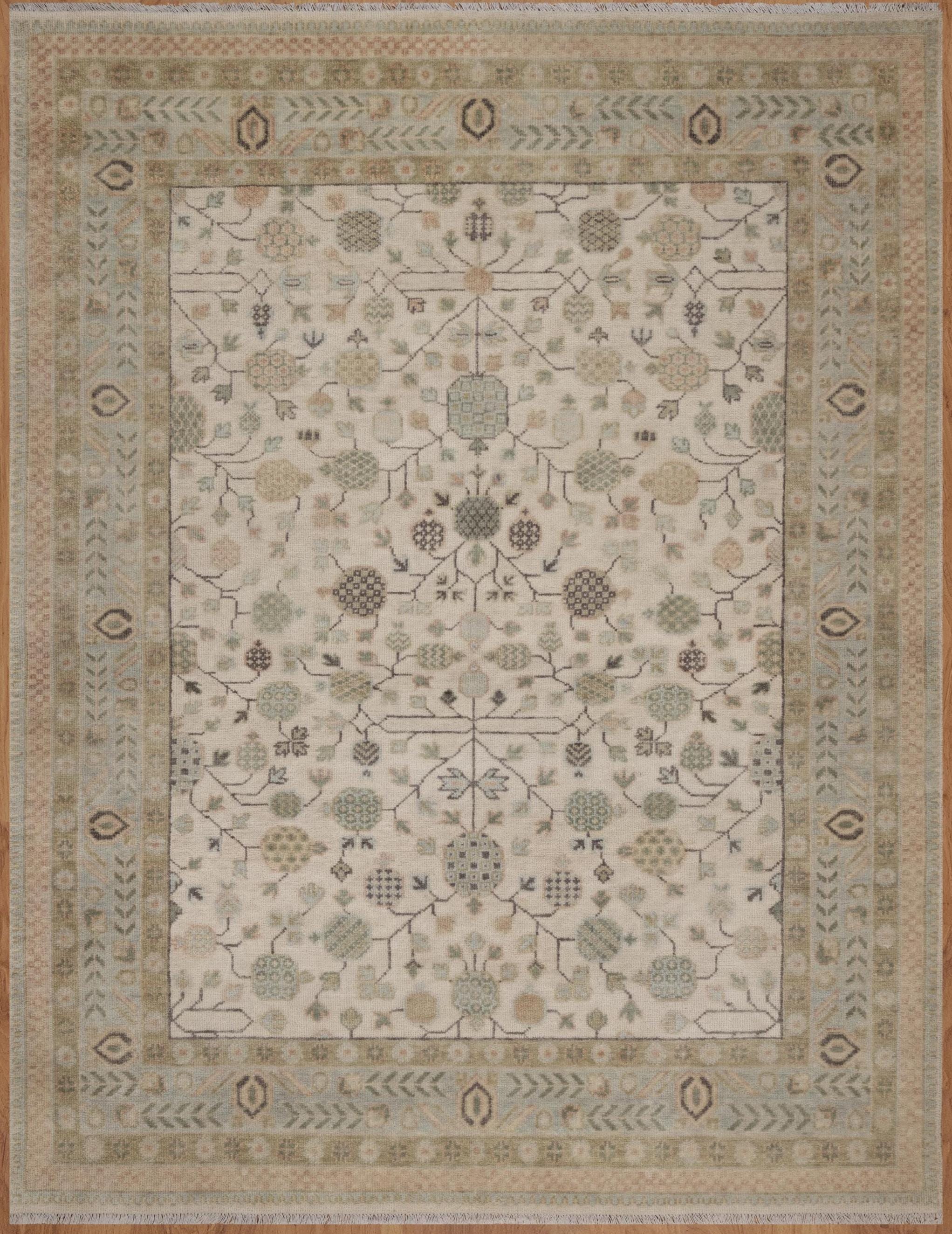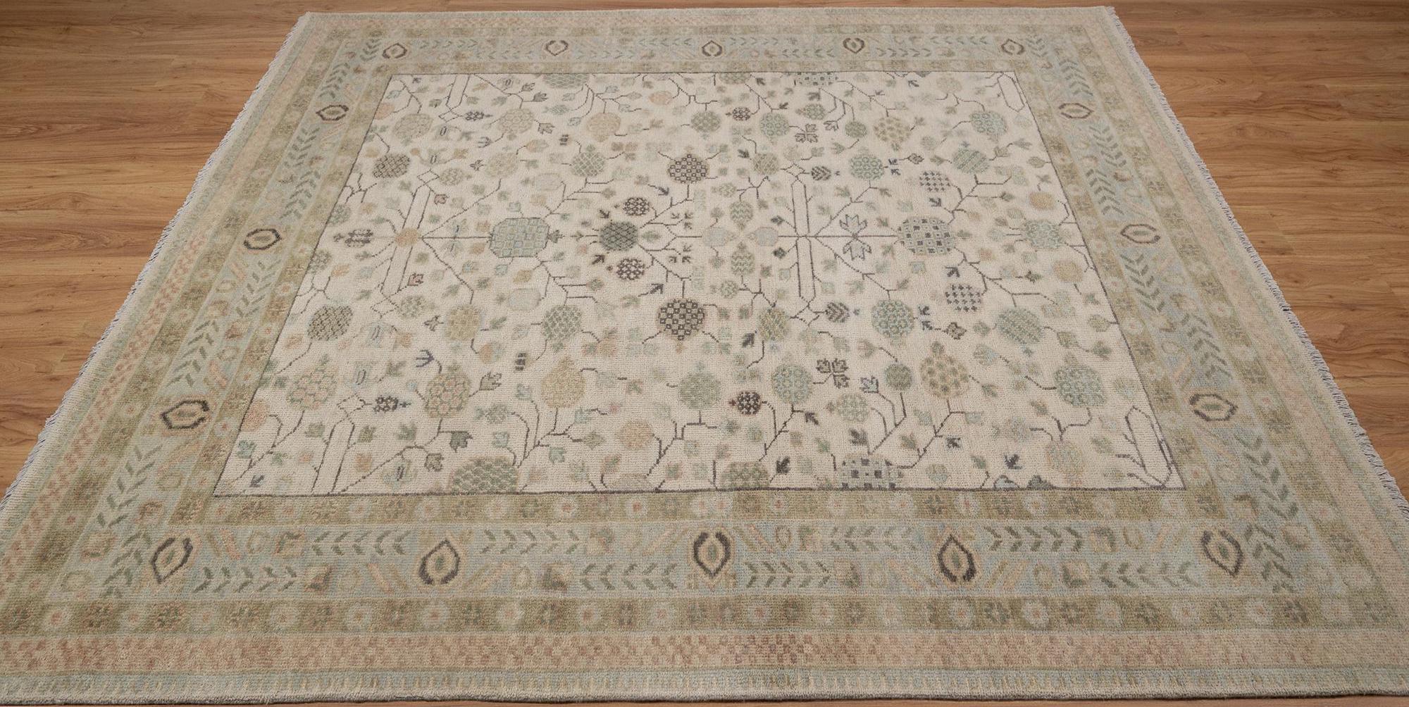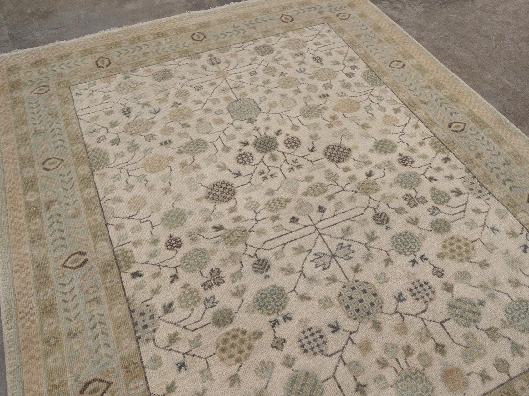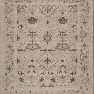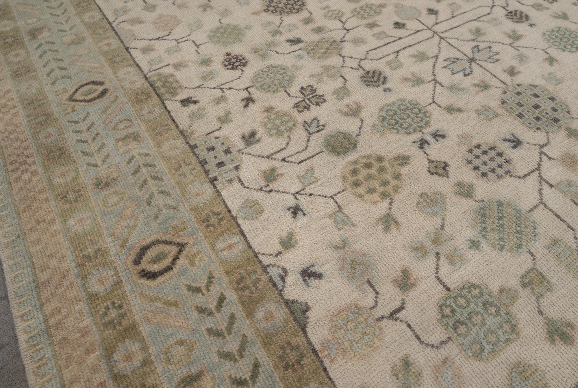 Embrace timeless elegance with this exquisite handmade wool rug featuring a sophisticated all-over floral design in soothing neutral tones. This stunning piece showcases the refined beauty of traditional Oushak aesthetics with its delicate color palette and intricate botanical motifs—perfect for creating a serene, elegant atmosphere in any space. This magnificent hand-knotted rug displays classic Persian-Oushak design artistry with a luminous ivory field adorned with graceful floral rosettes, delicate vines, and geometric medallions. The soft sage green and taupe border features traditional arrow patterns and hexagonal motifs that beautifully frame the central design. The muted, sophisticated color palette creates an airy, tranquil ambiance while the intricate pattern adds visual interest and depth.