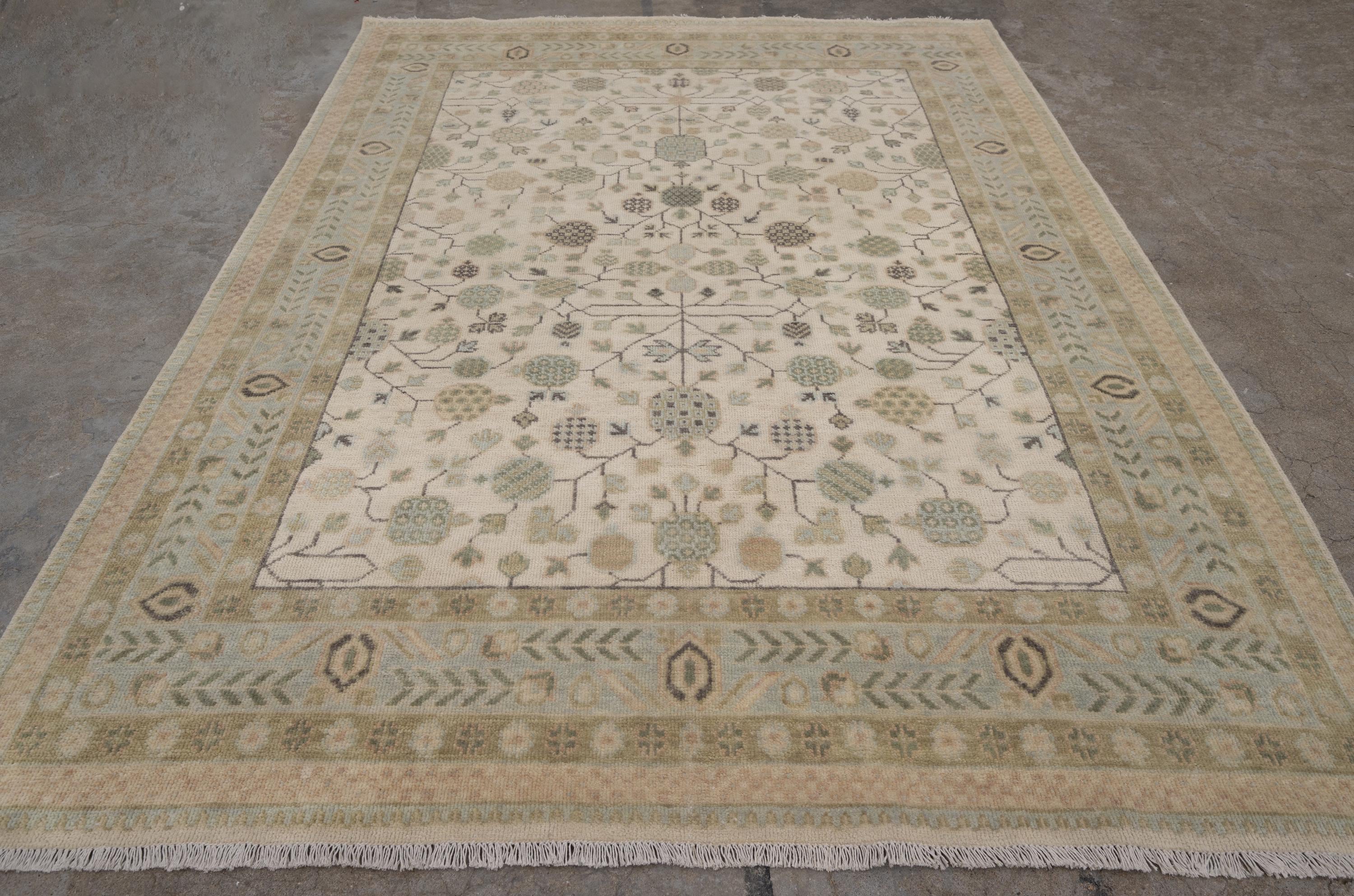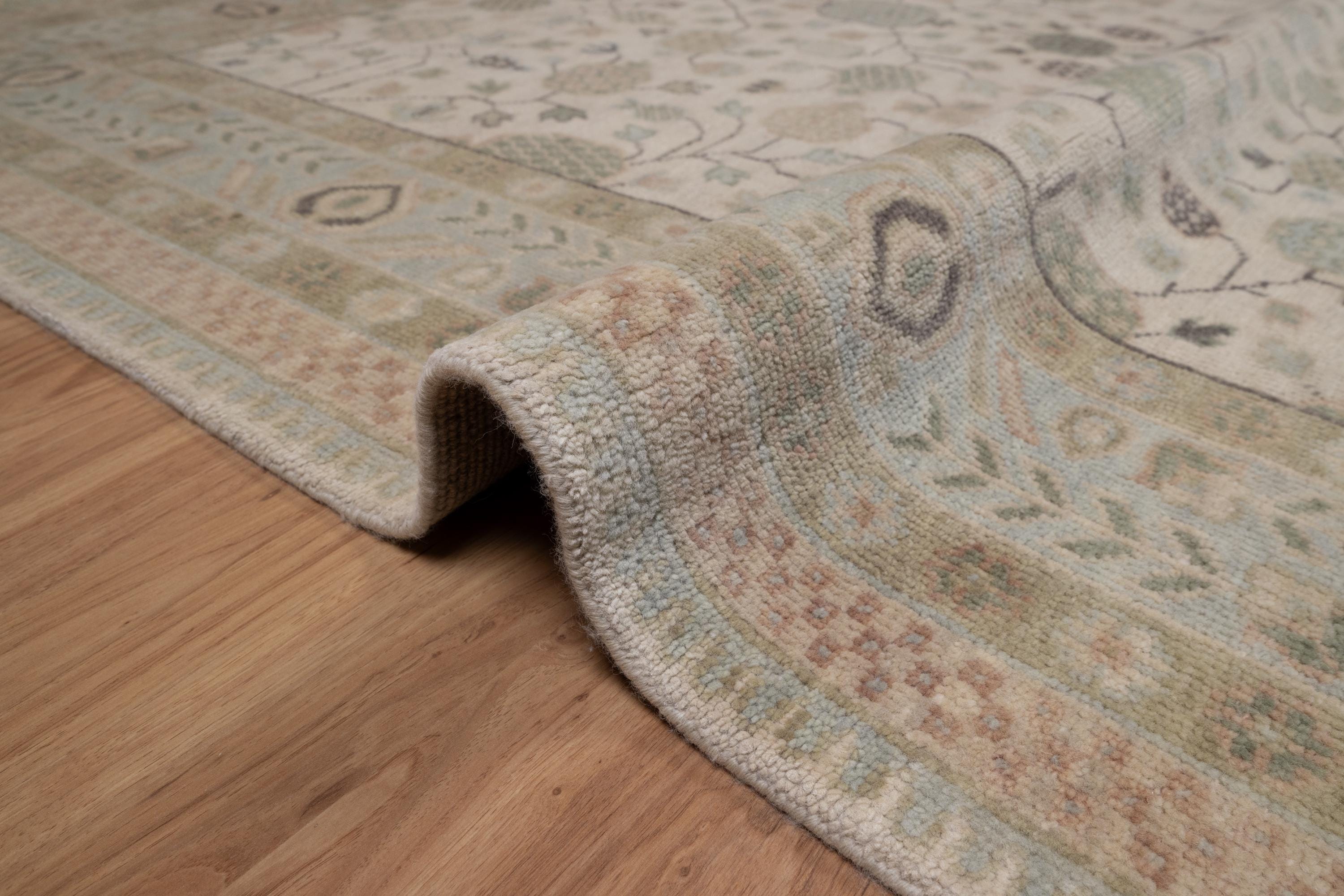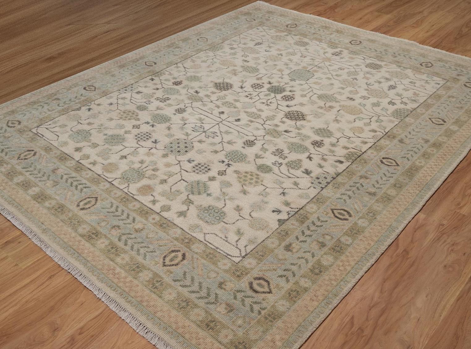 Handmade Wool Oushak Rug: Ivory, Sage Green Floral Persian Carpet L_291