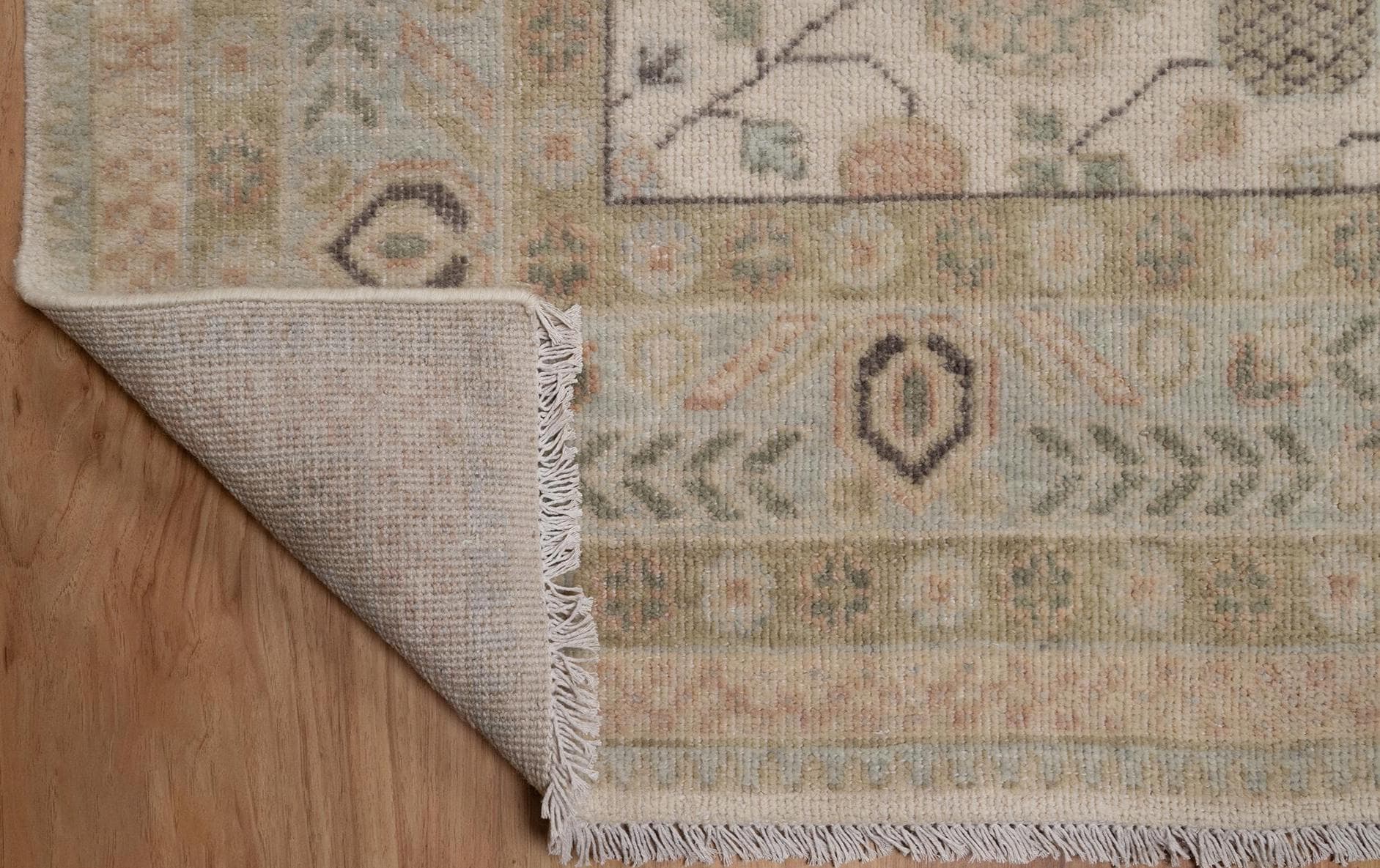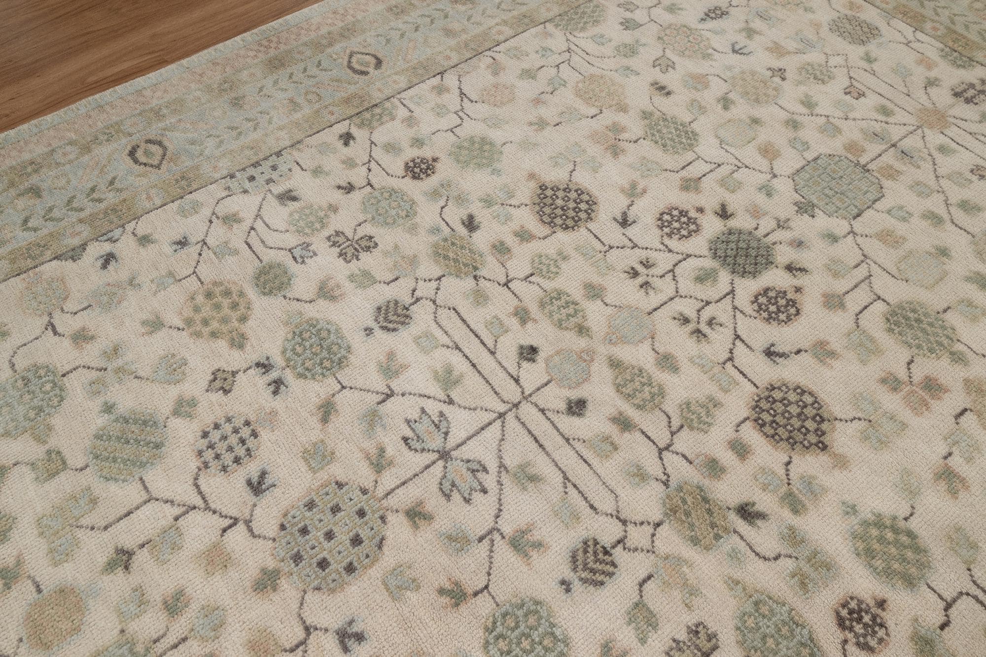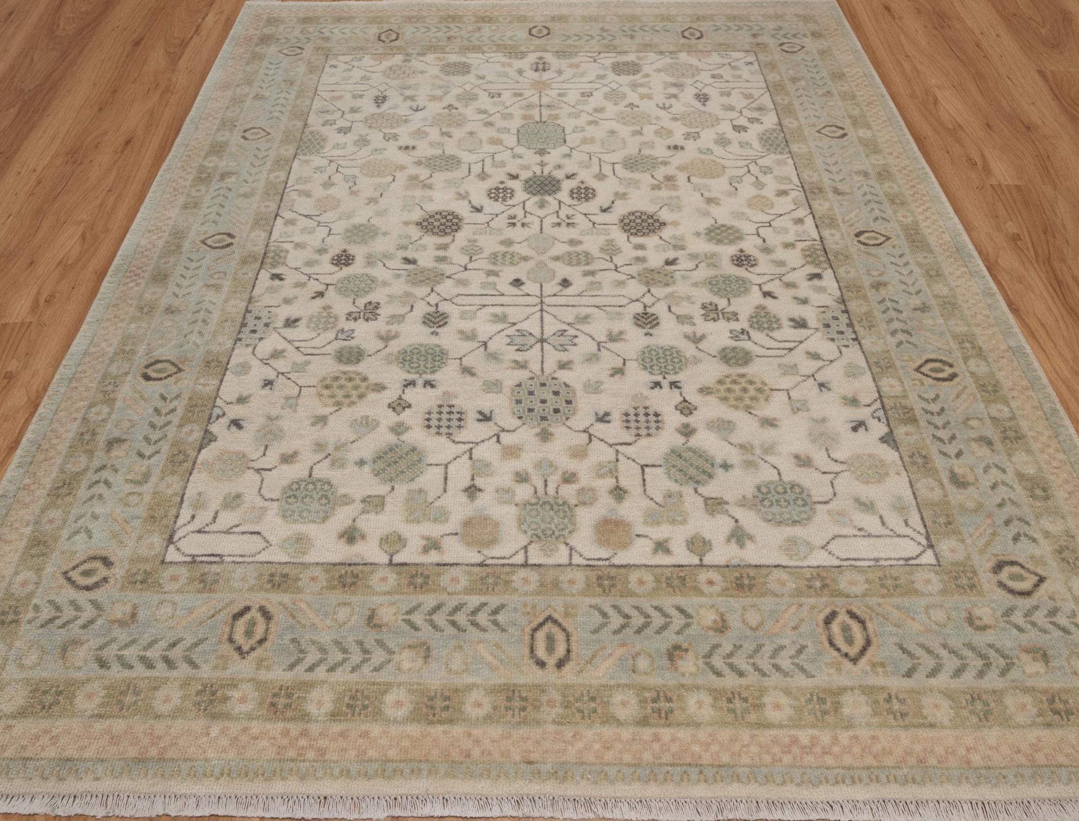Handmade Wool Oushak Rug: Ivory, Sage Green Floral Persian Carpet L_291