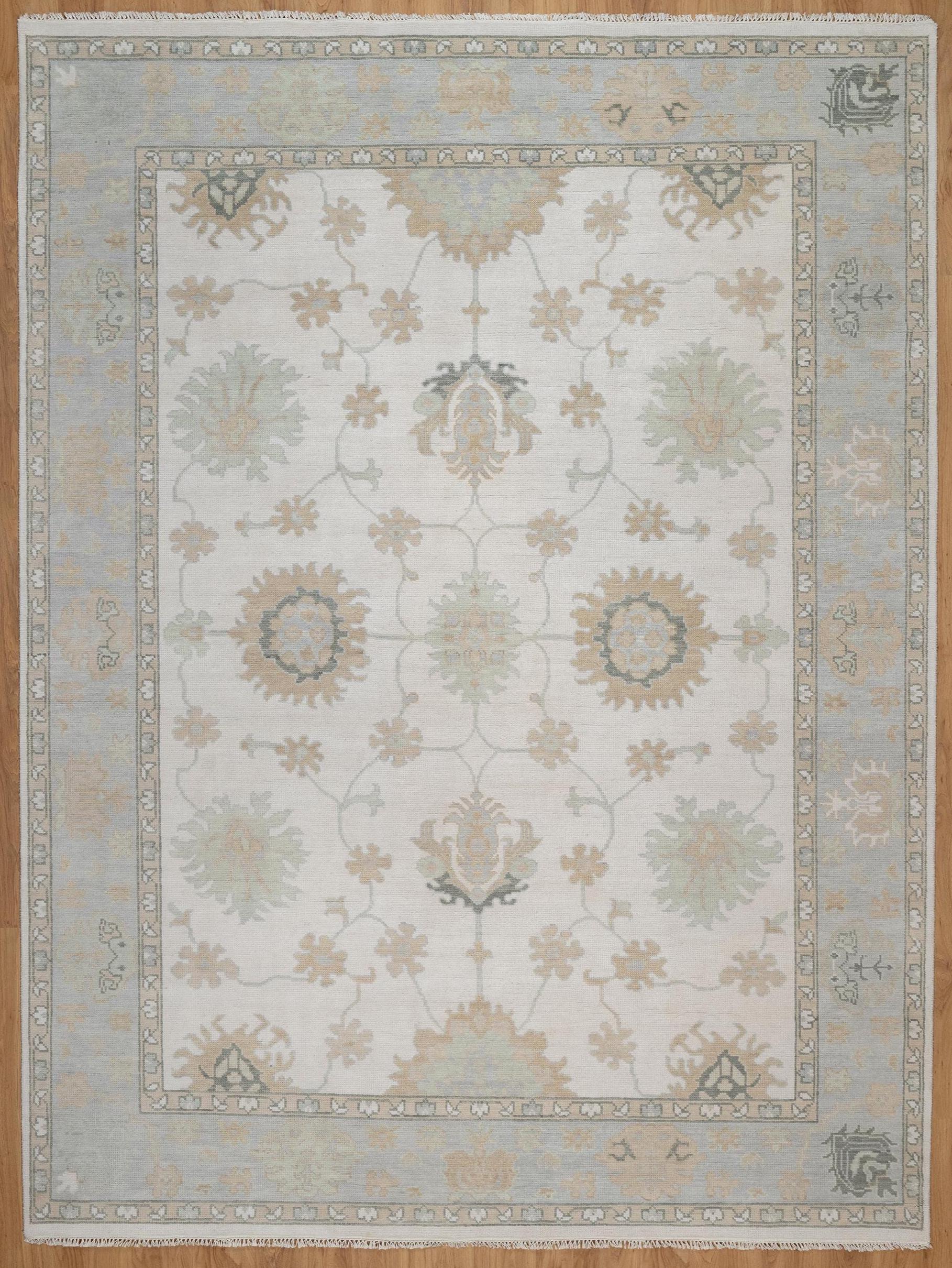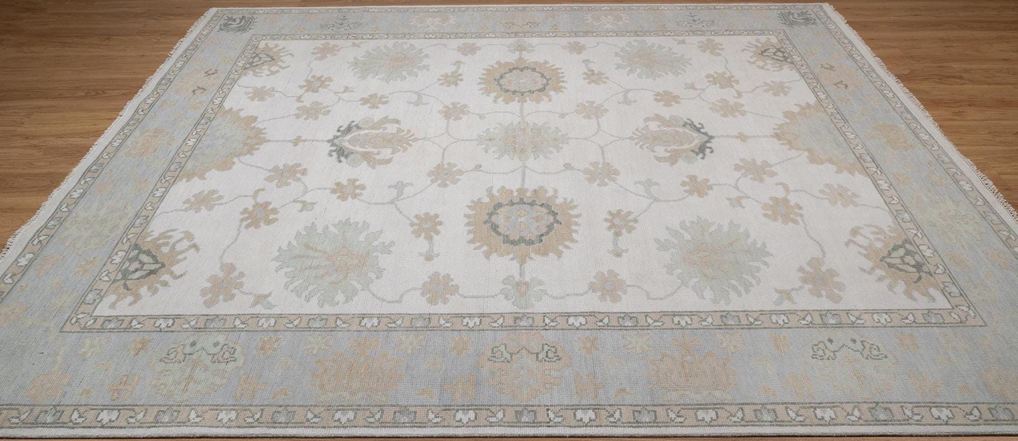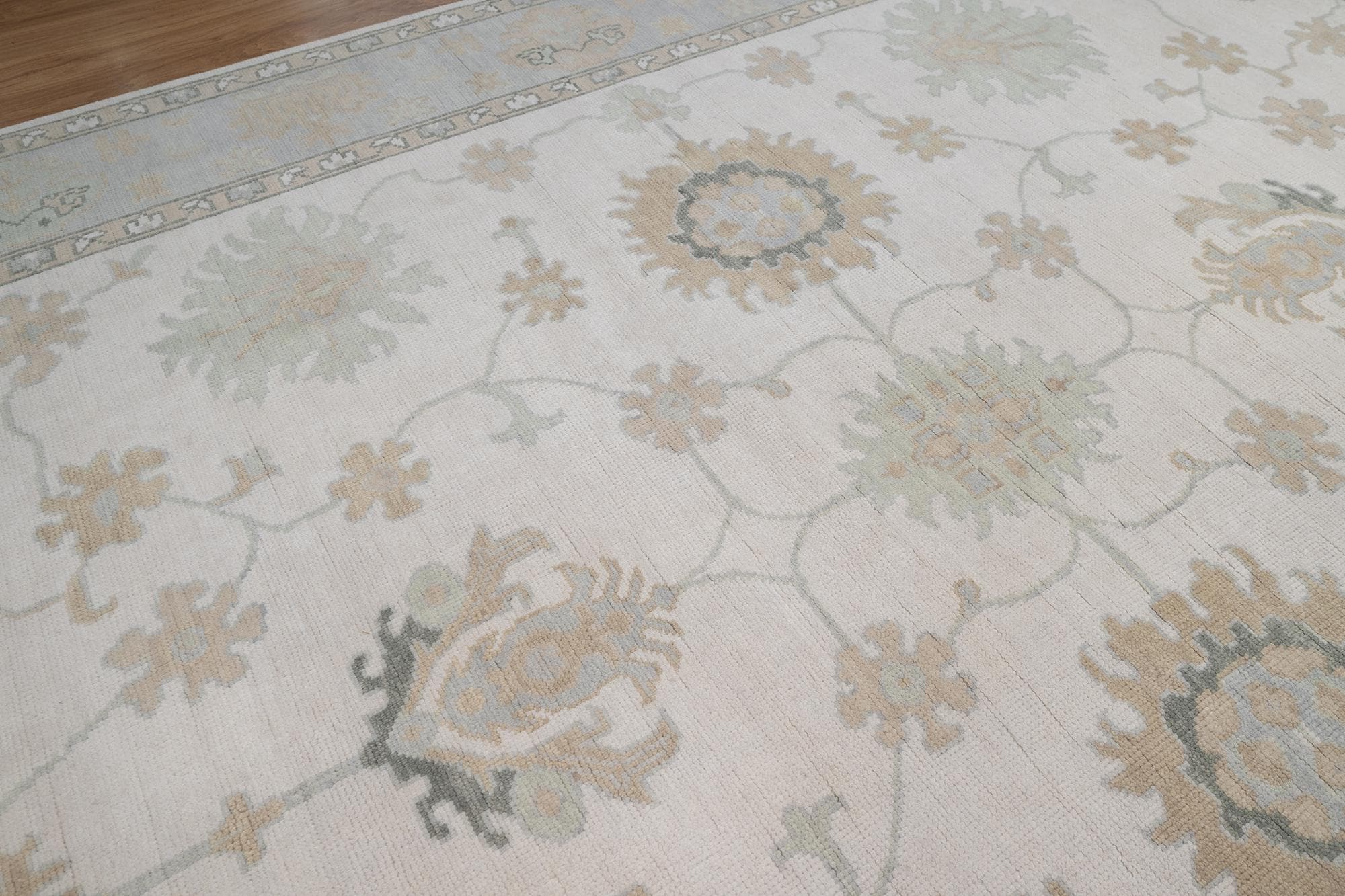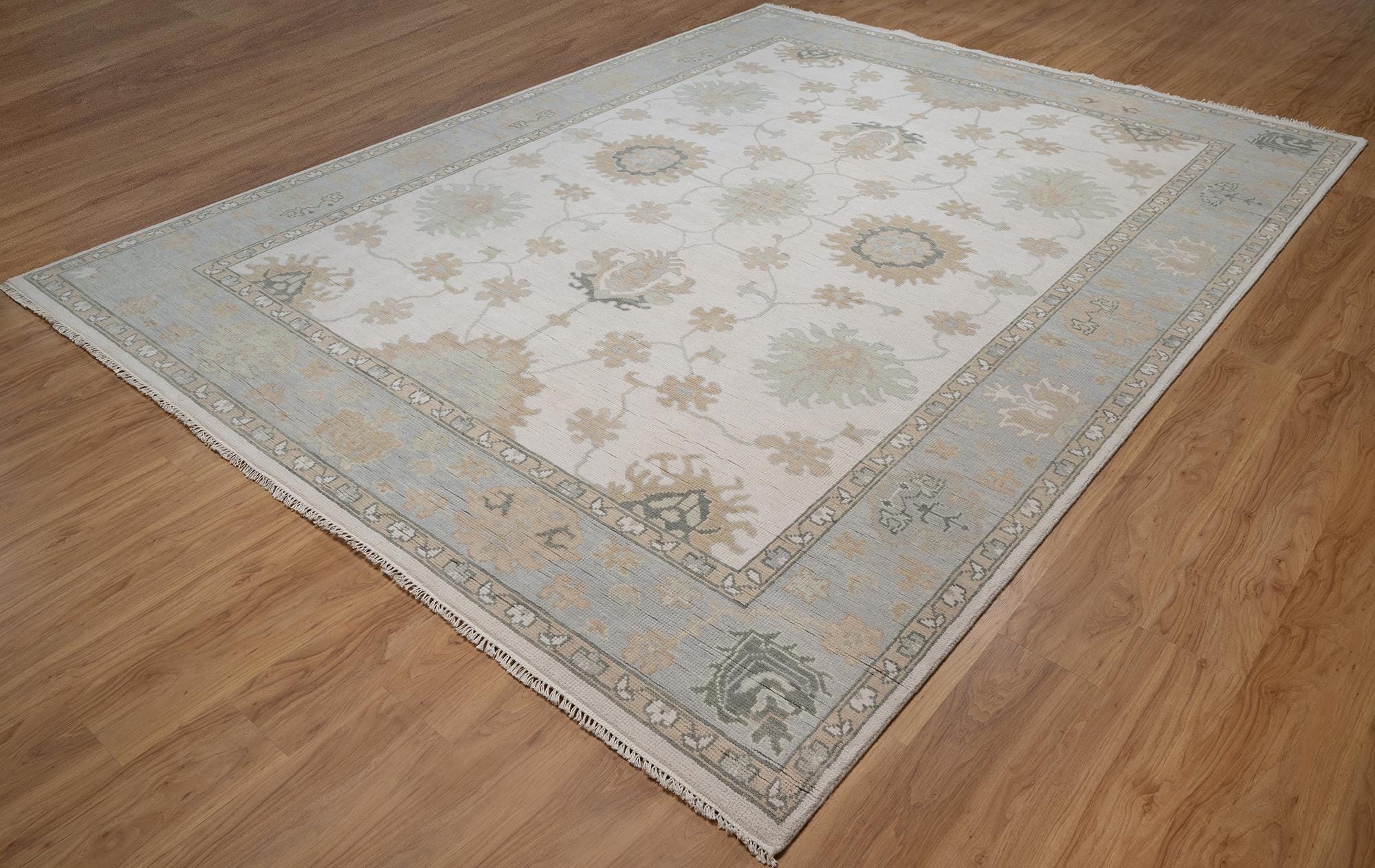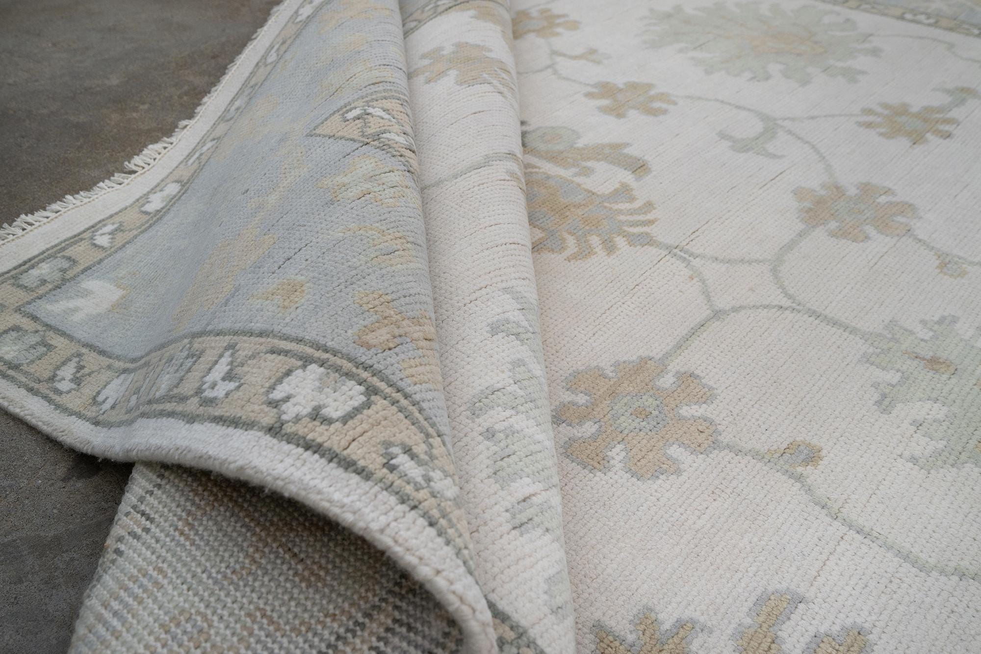 This exquisite handmade Oushak wool rug epitomizes the sophisticated elegance of traditional Turkish weaving artistry. Featuring a luminous ivory field adorned with graceful floral rosette medallions and delicate botanical vines, framed by a serene powder blue border, this piece brings timeless beauty to any interior. Oushak rugs are prized for their versatility and ability to blend seamlessly with various design styles. This piece works beautifully in traditional settings but equally enhances modern, transitional, coastal, or farmhouse interiors. The soft blue and beige tones pair effortlessly with neutral furnishings while adding subtle color and texture.