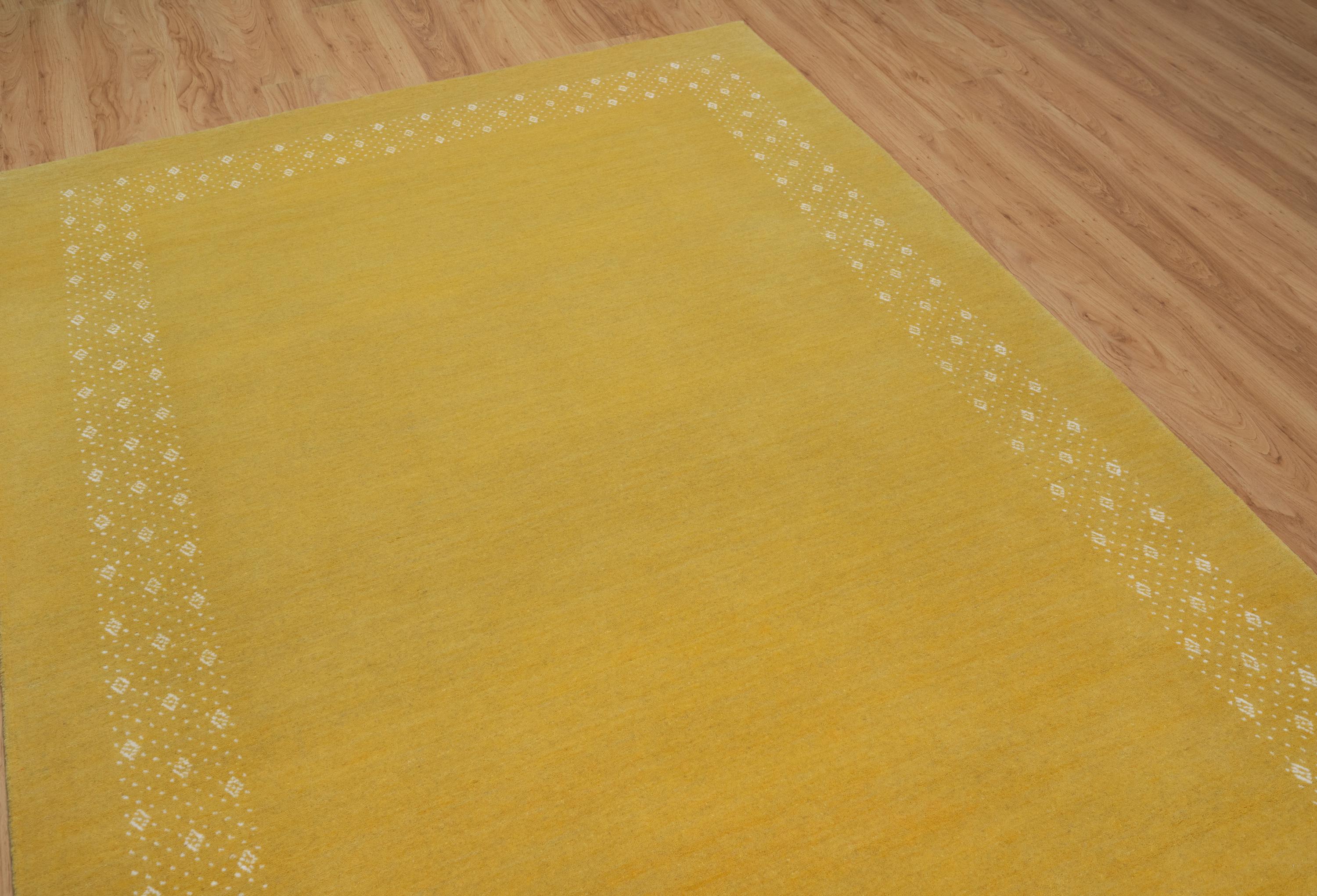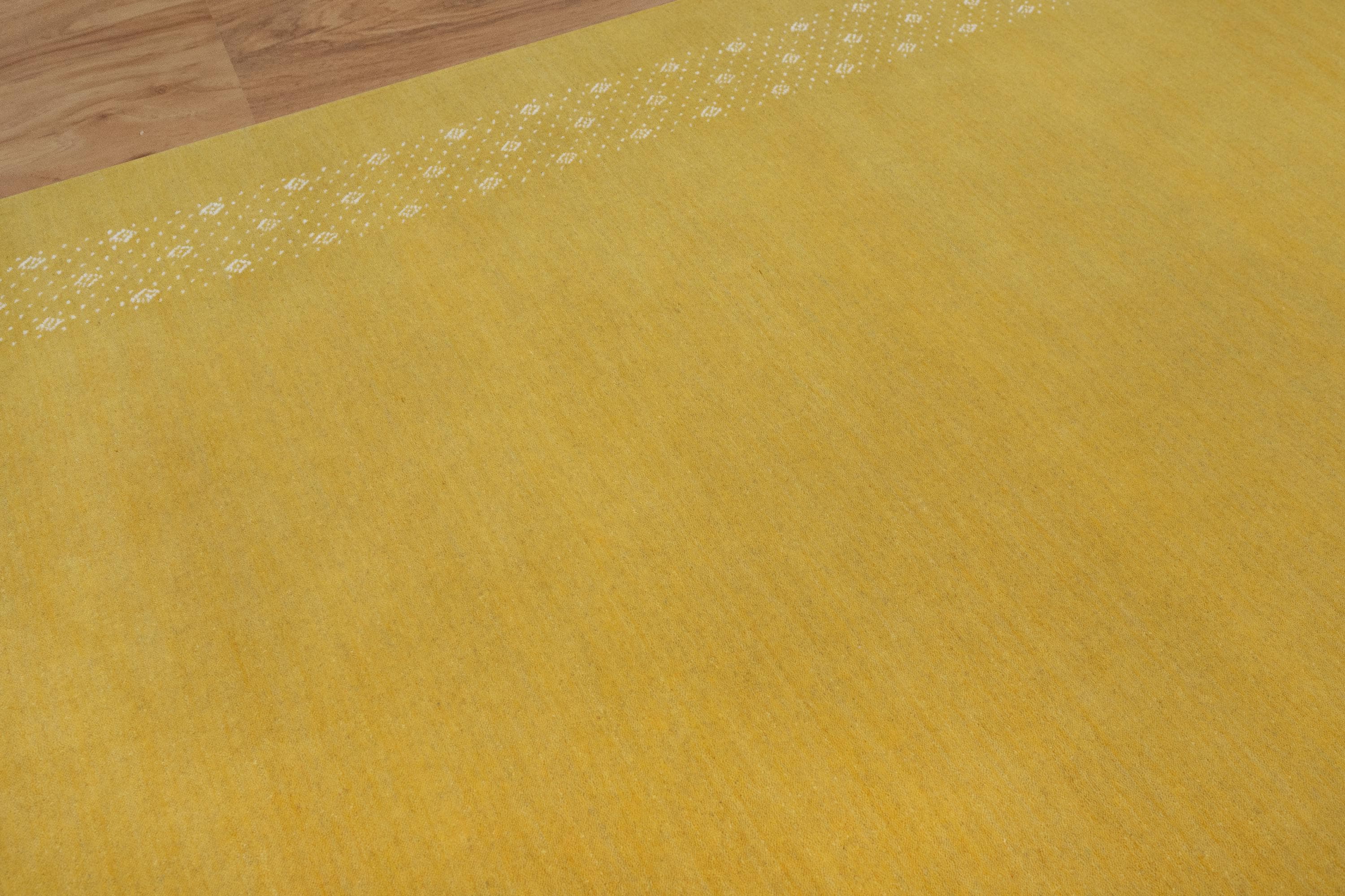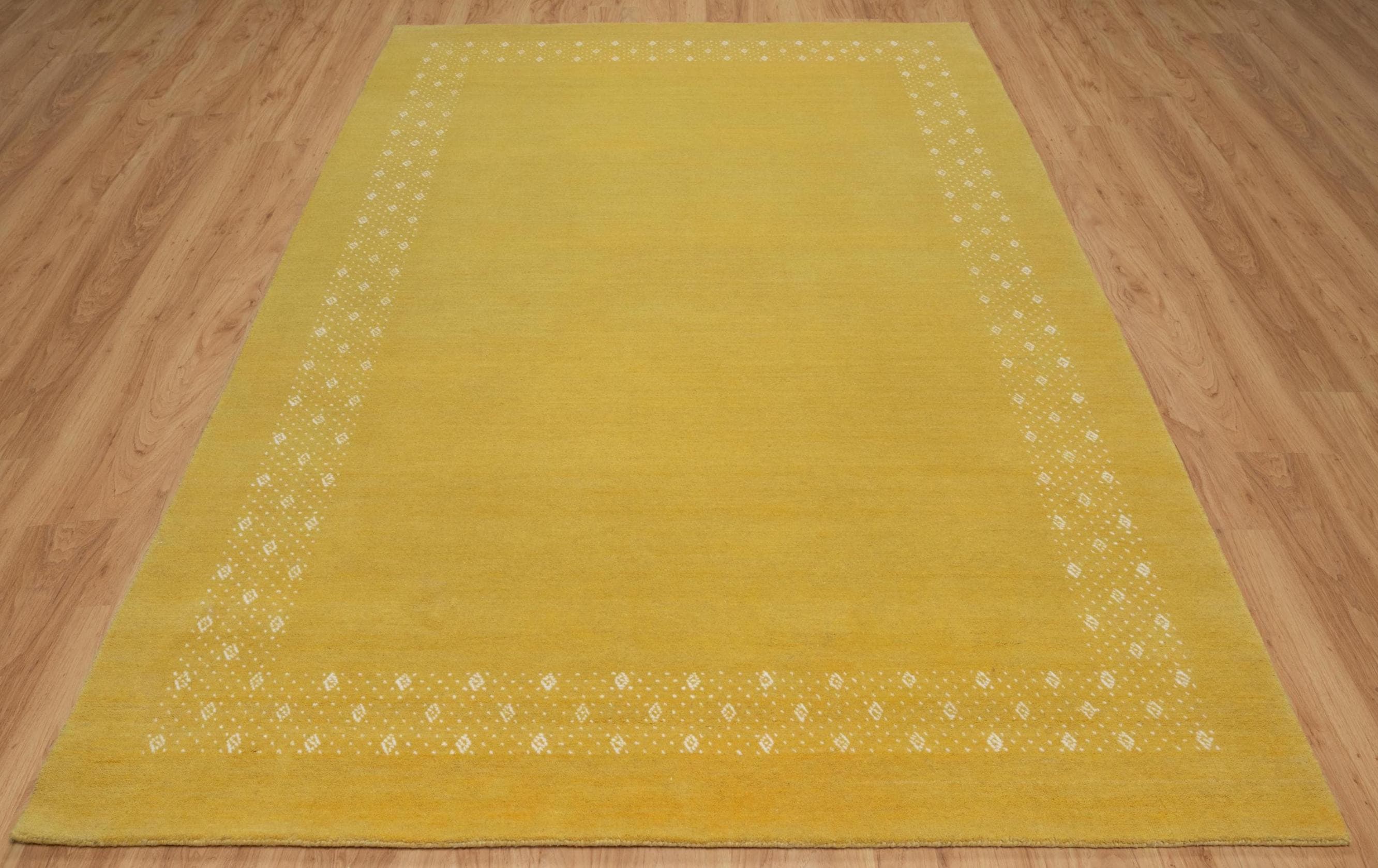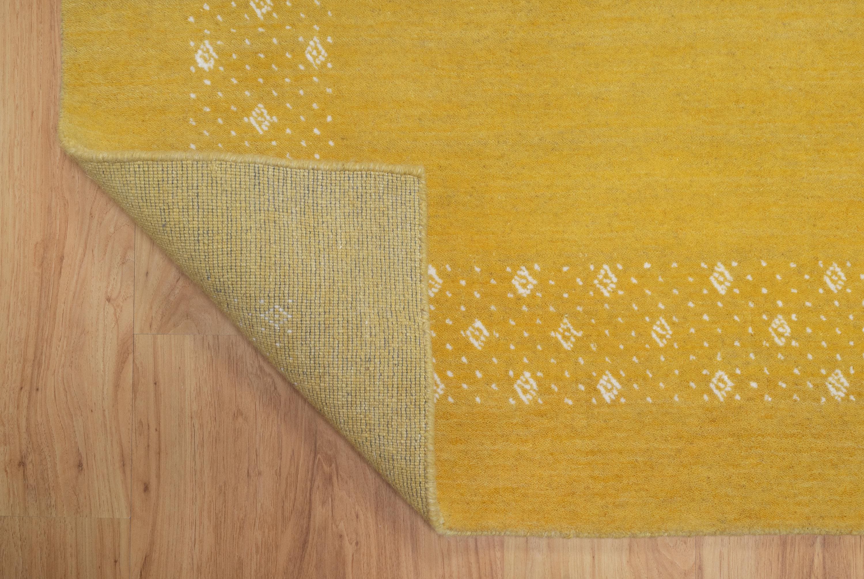 This Yellow wool gabbeh rug is handmade area rug with tribal design in maroon, orange & blue accents. The solid Gabbeh rug in a rich yellow base, beautifully accented with intricate patterns along the border. Perfect for adding a pop of color to living rooms, bedrooms, dining areas, or entryways, this minimalist yet striking area rug blends effortlessly with both modern and traditional décor.