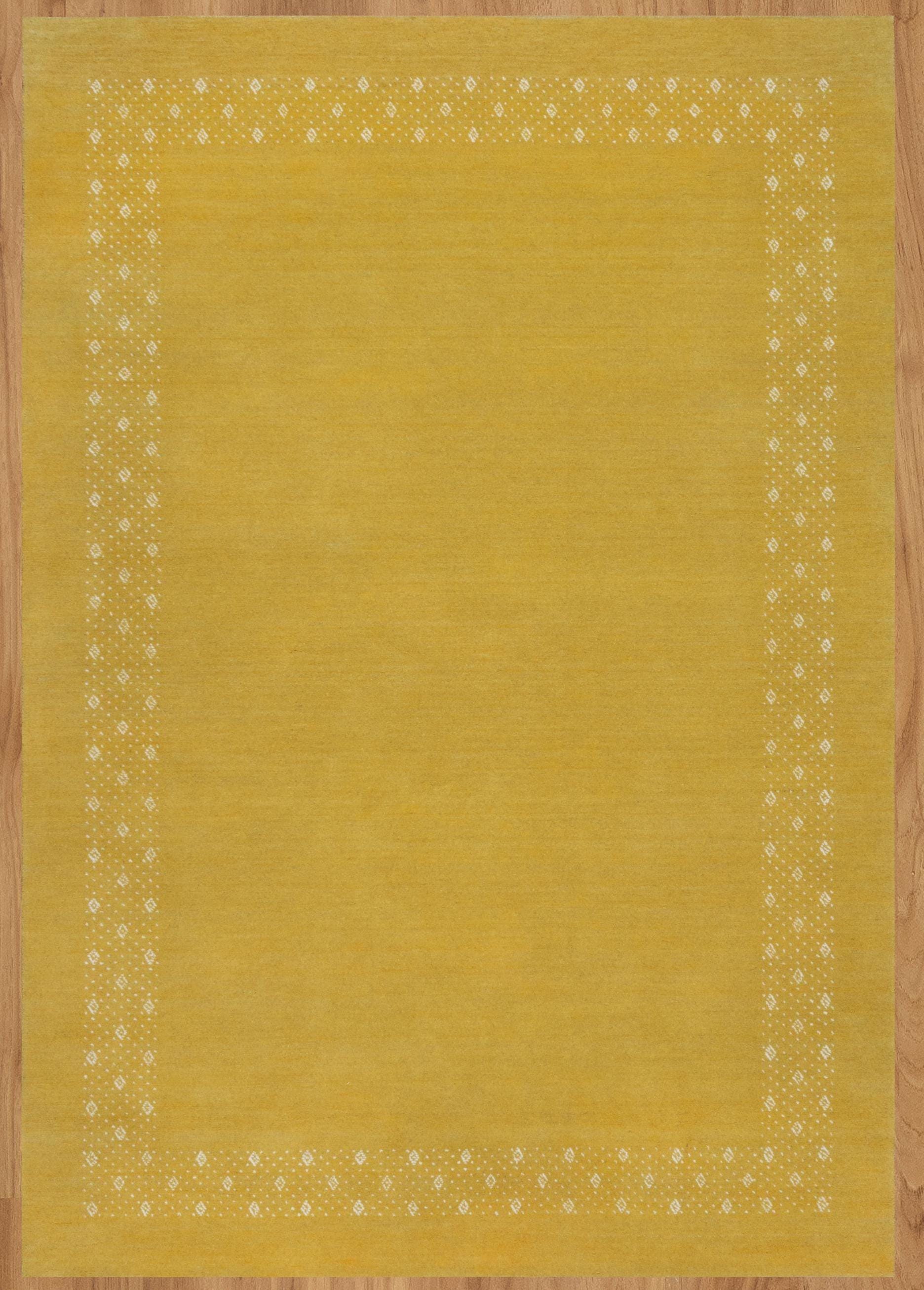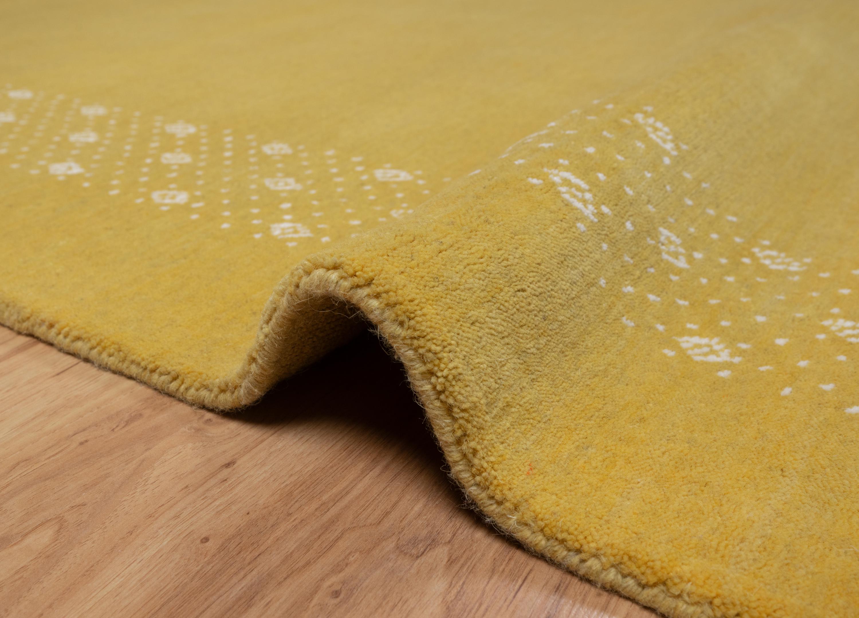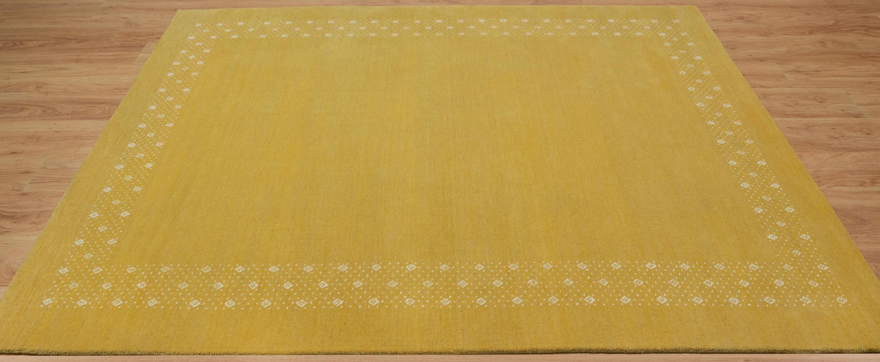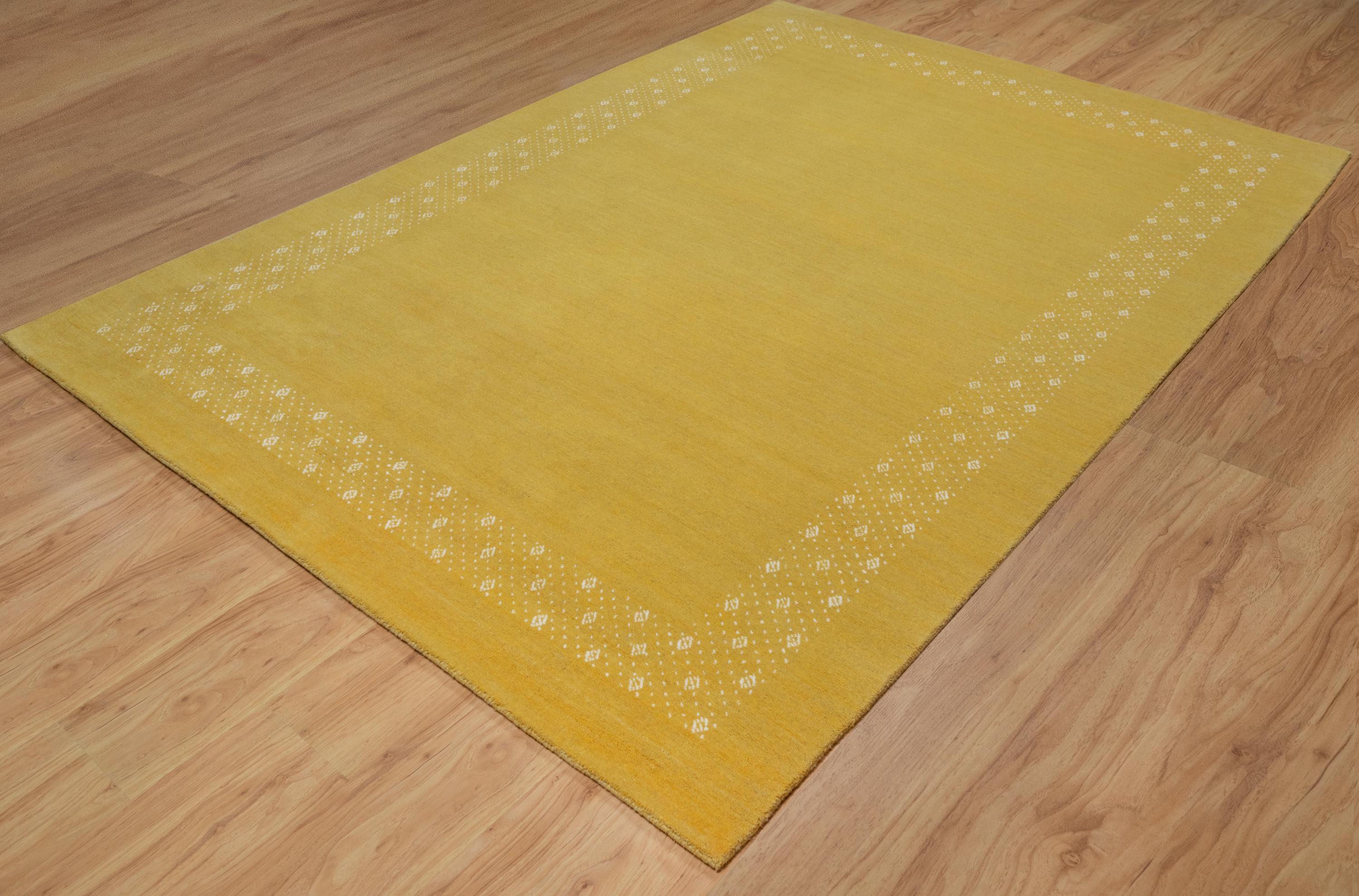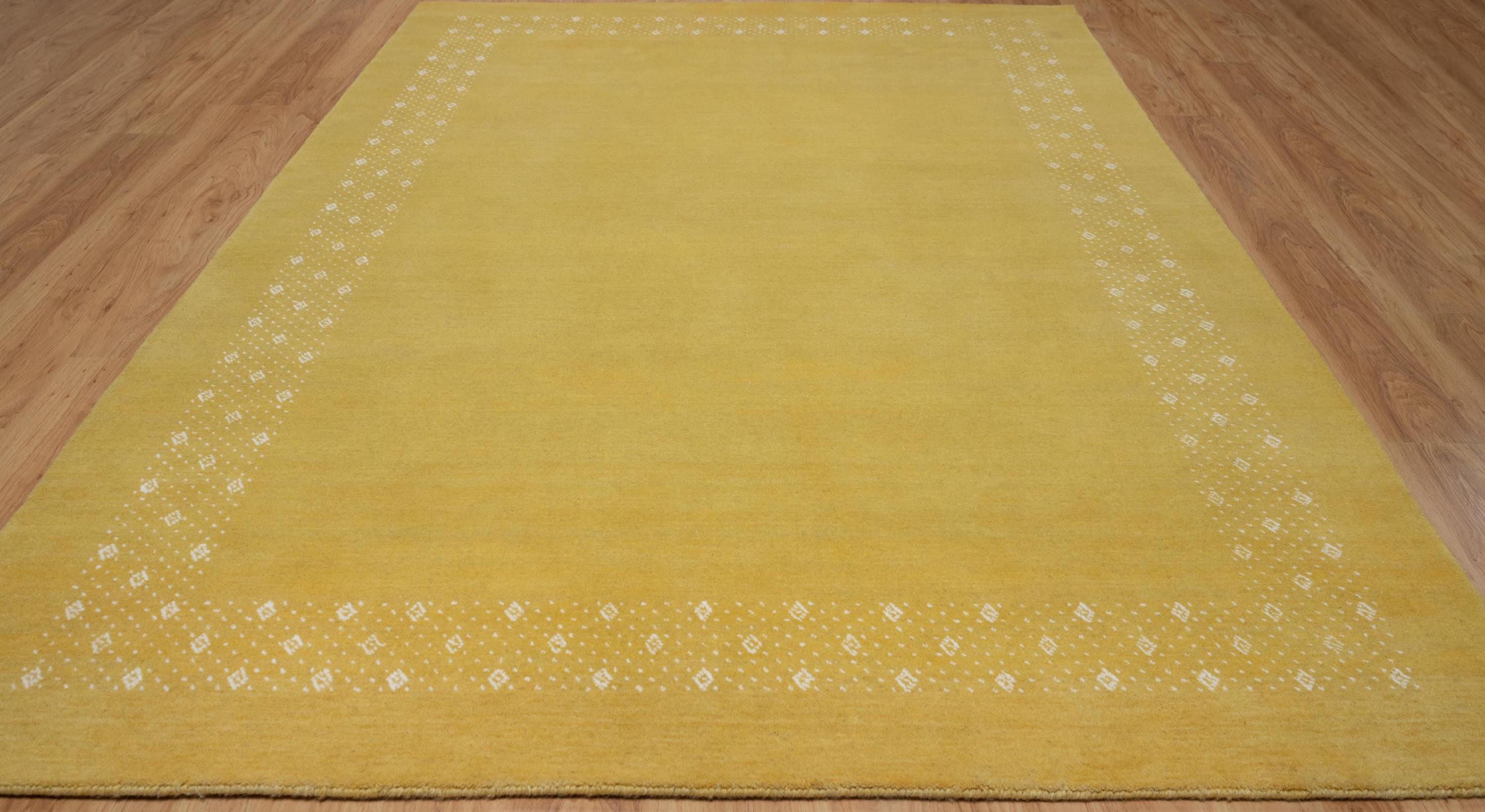 This Yellow wool gabbeh rug is handmade area rug with tribal design in maroon, orange & blue accents. The solid Gabbeh rug in a rich yellow base, beautifully accented with intricate patterns along the border. Perfect for adding a pop of color to living rooms, bedrooms, dining areas, or entryways, this minimalist yet striking area rug blends effortlessly with both modern and traditional décor.