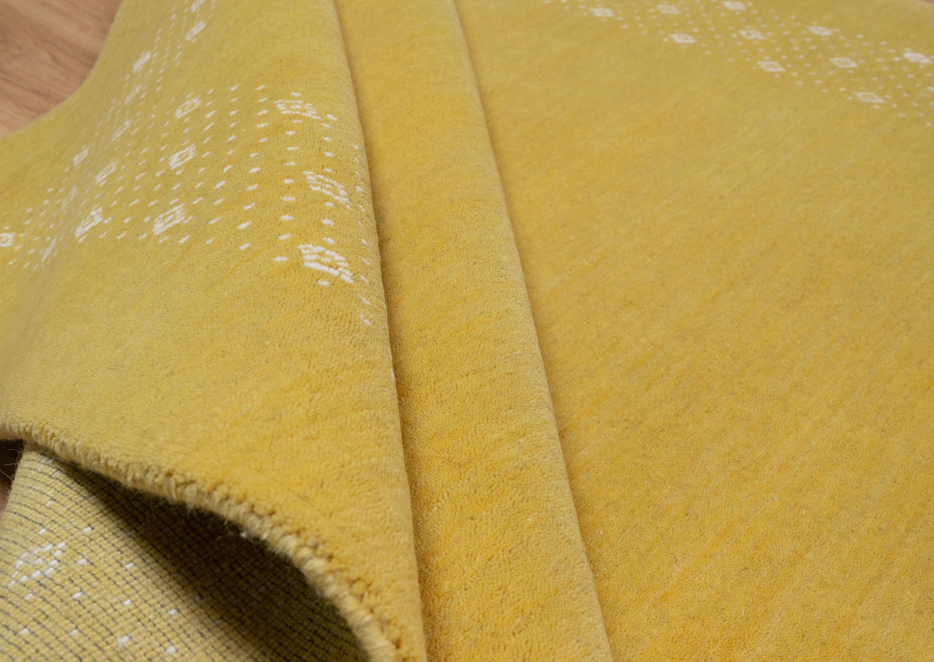 Hand woven by skilled artisans, this Gabbeh area rug has a fresh color palette that fits into farmhouse decor. The mustard yellow evokes energy and optimism. Made from premium wool, the rug is naturally soft, durable, and easy to maintain, ensuring long-lasting beauty. The pile height of this yellow rug is about 0.35 inch, with total rug thickness being under 1/2 inch. The knots per sq inch is about 50.